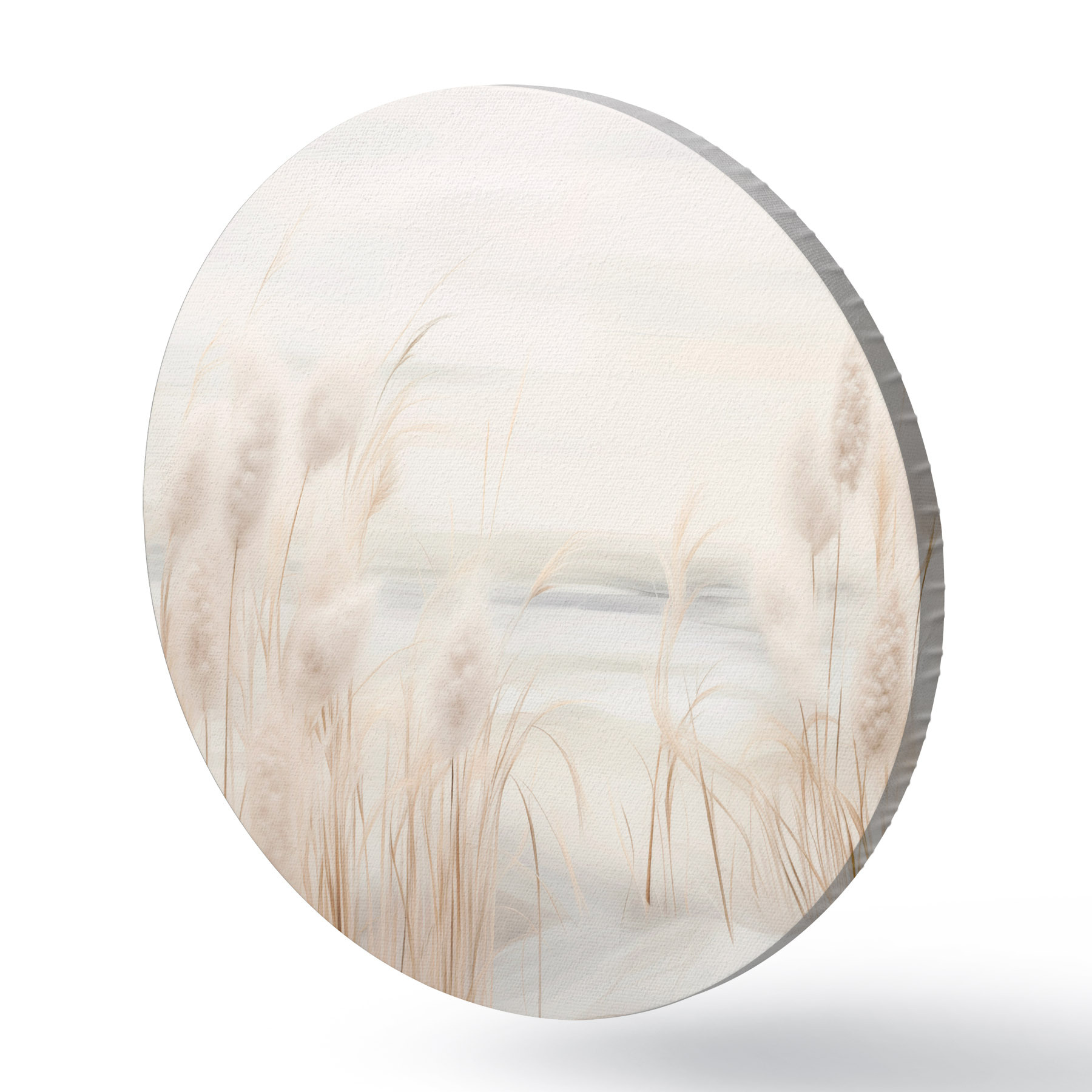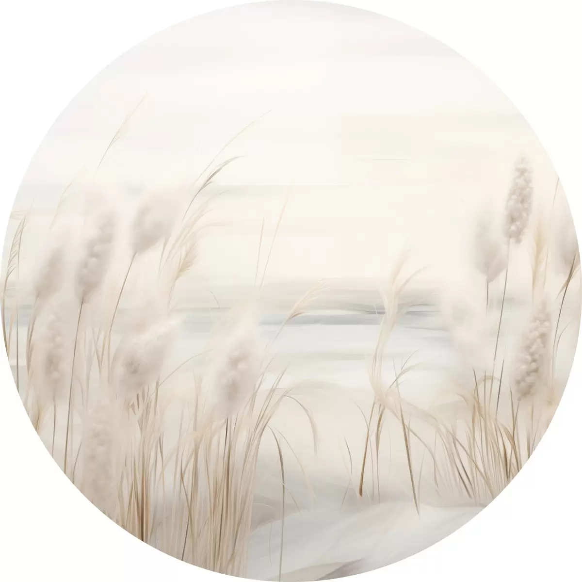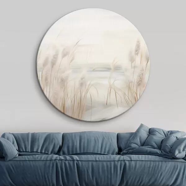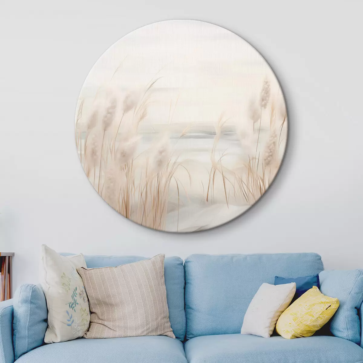 Cuadros redondos Cañas beige en primer plano, con cabezas de semillas, suaves y delicadas , un fondo borroso y un cielo claro r44851