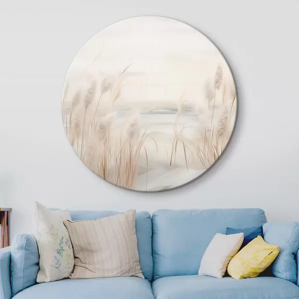 Cuadros redondos Cañas beige en primer plano, con cabezas de semillas, suaves y delicadas , un fondo borroso y un cielo claro r44851
