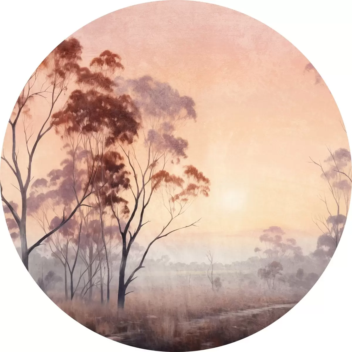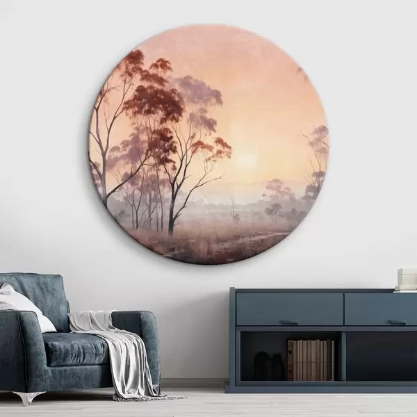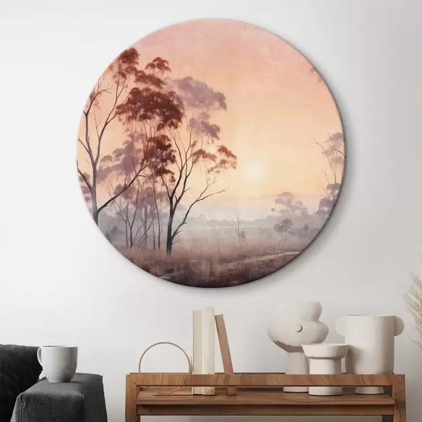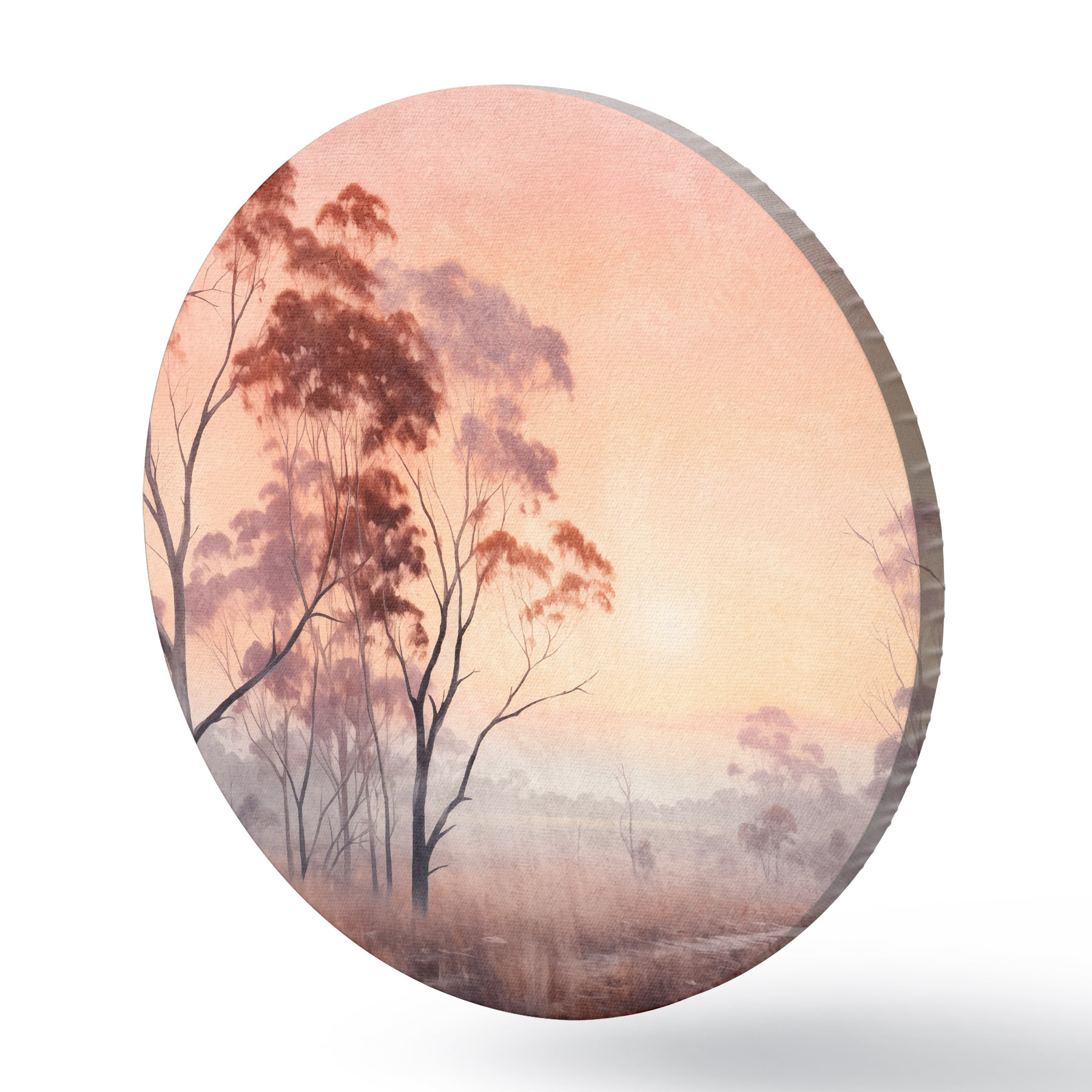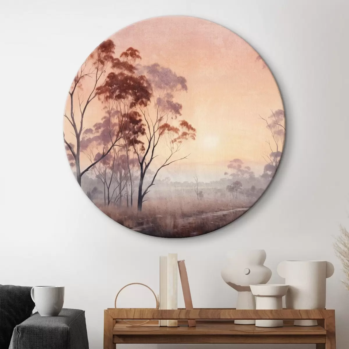 Cuadros redondos Un paisaje pintado de un campo con hierba alta y árboles, el sol está en el fondo r44854