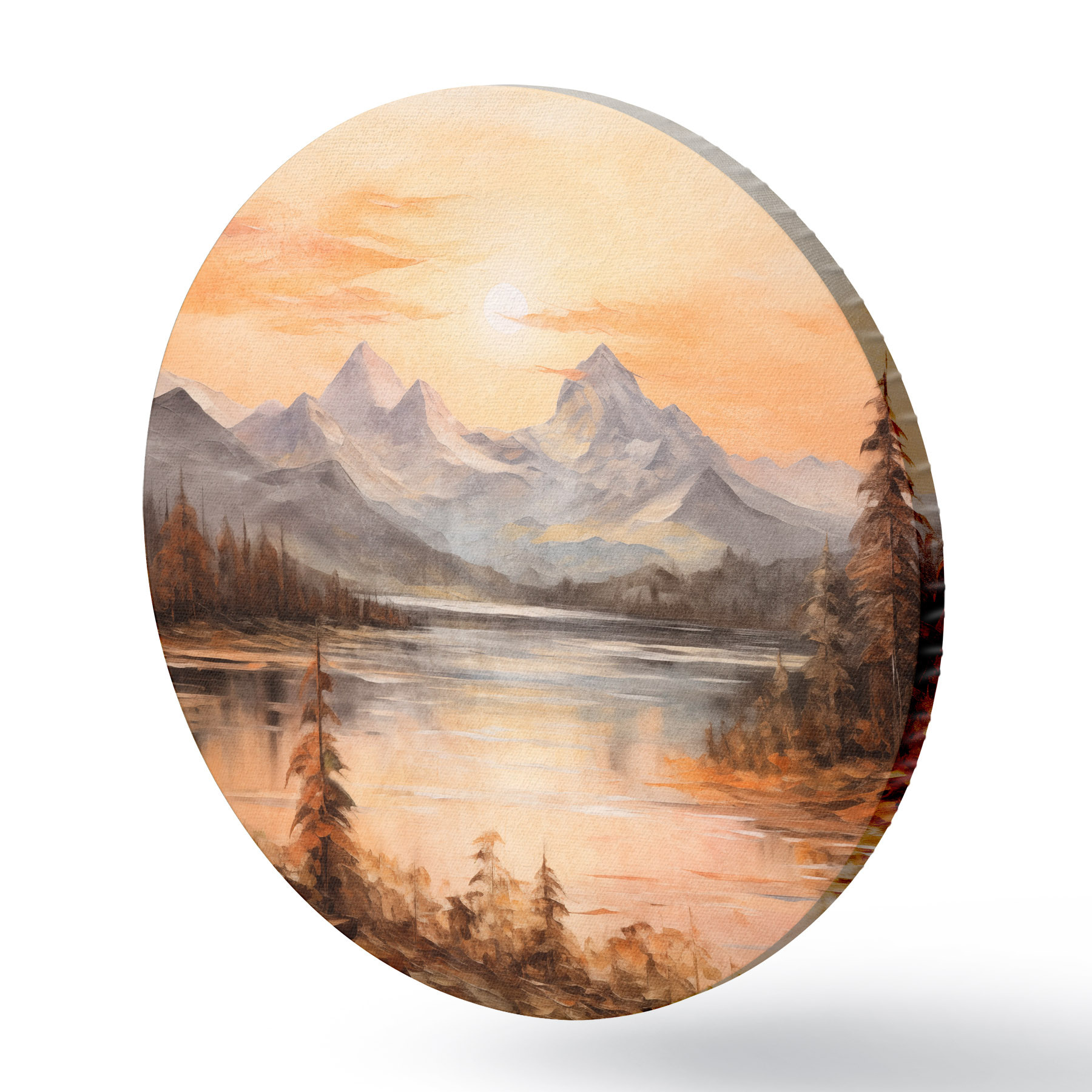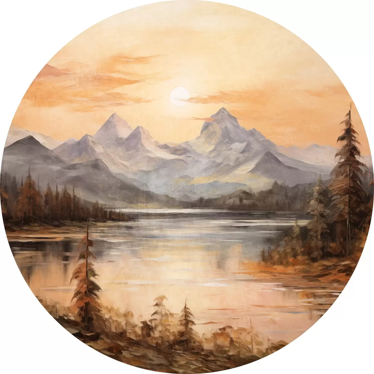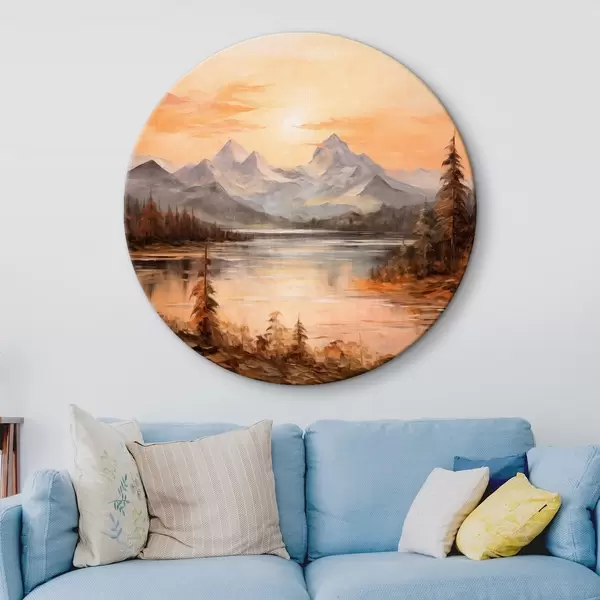 Cuadros redondos Paisaje con un lago rodeado de árboles y montañas al fondo, cielo anaranjado con el sol r44857
