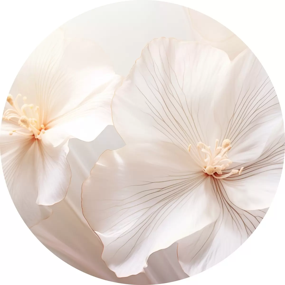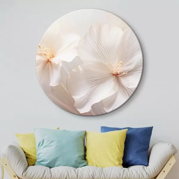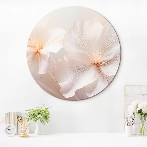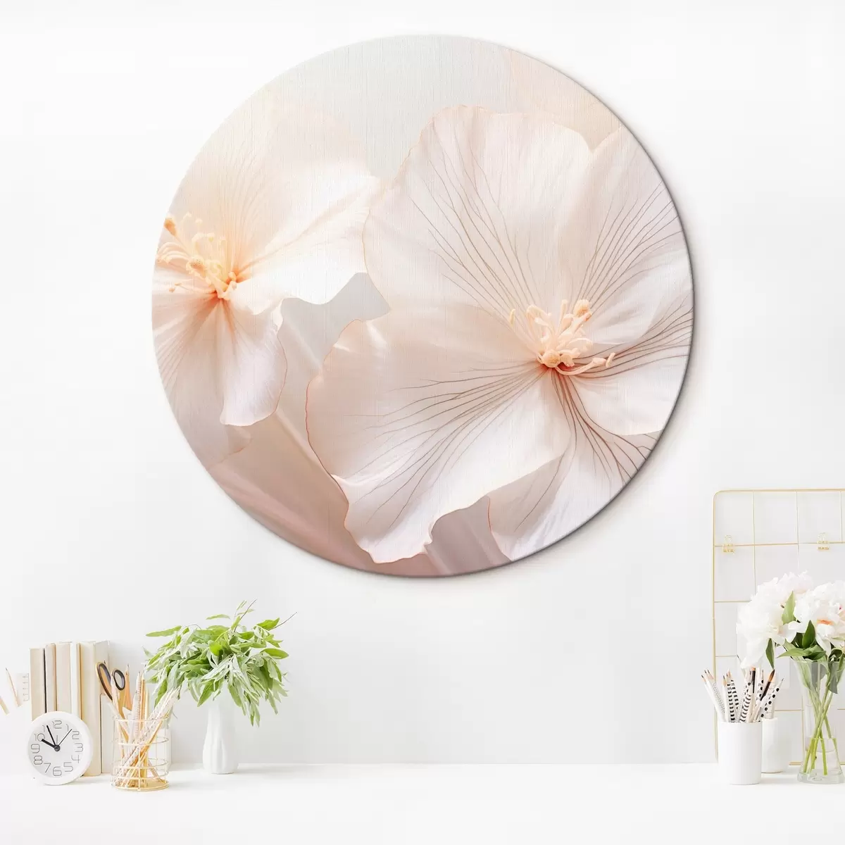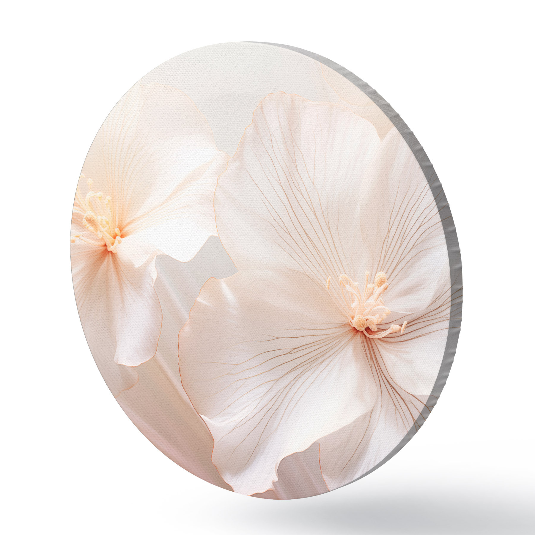 Cuadros redondos Delicadas flores blancas con pétalos y centros de suaves colores pastel, que crean un arte floral de ensueño y etéreo r44858