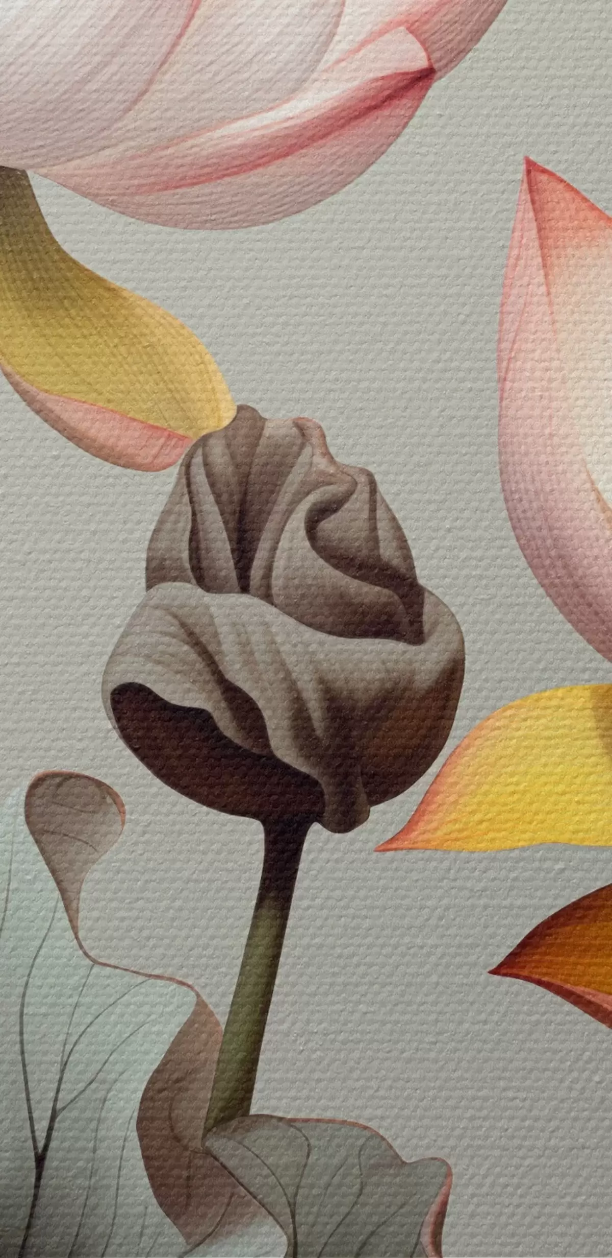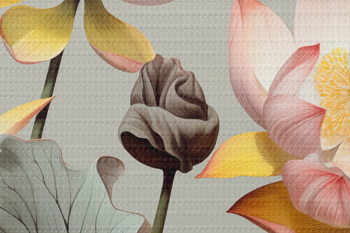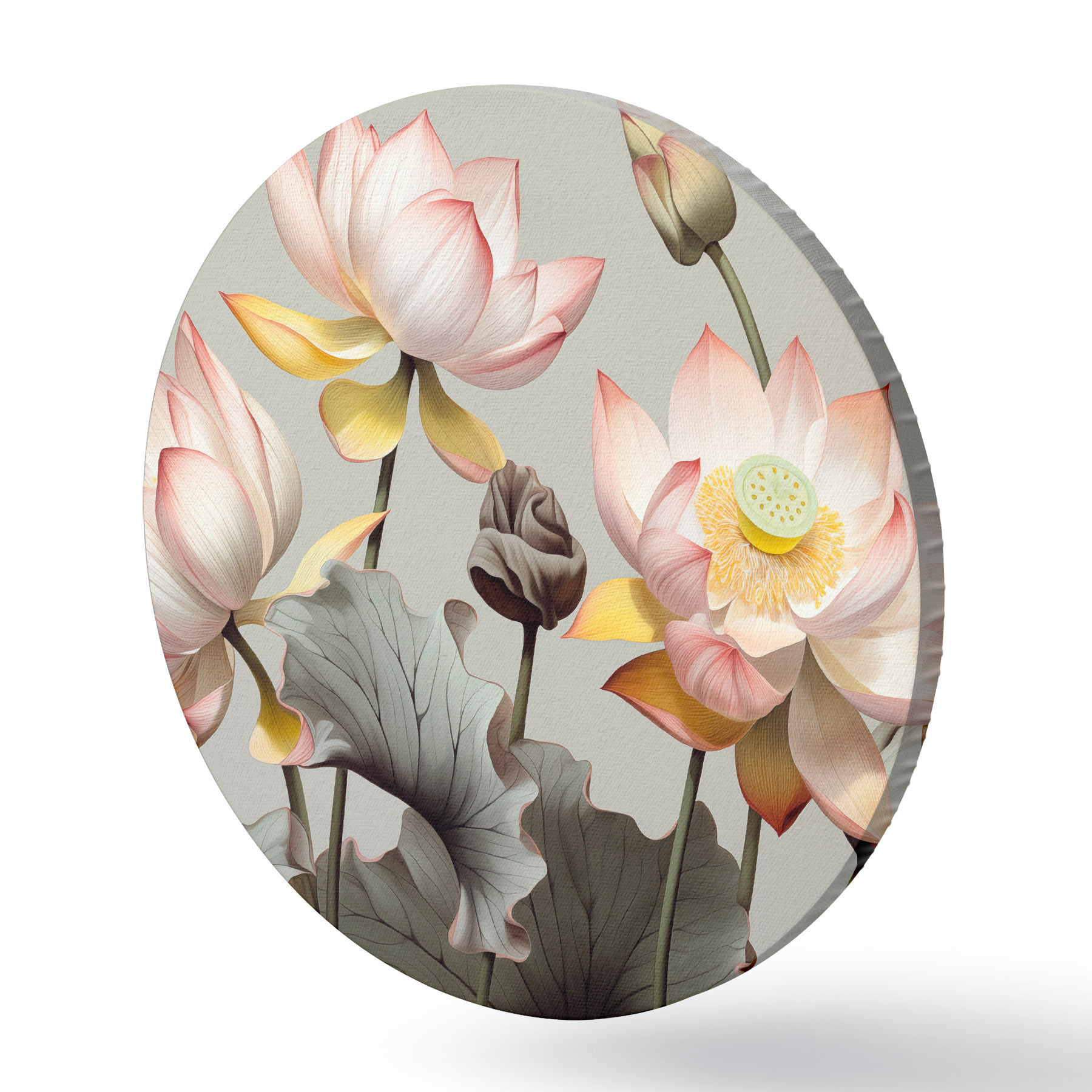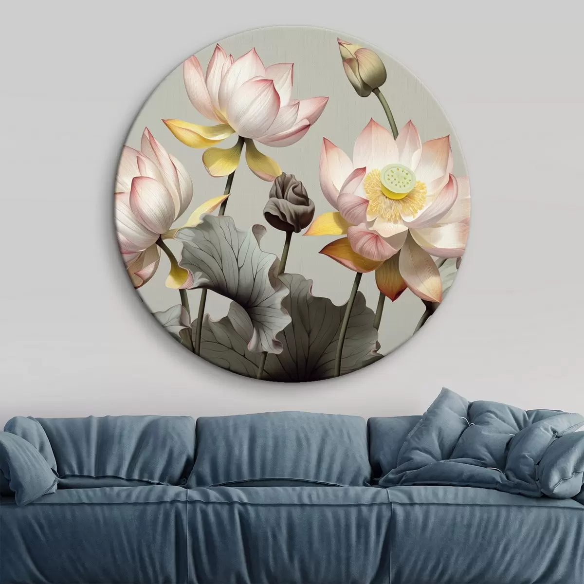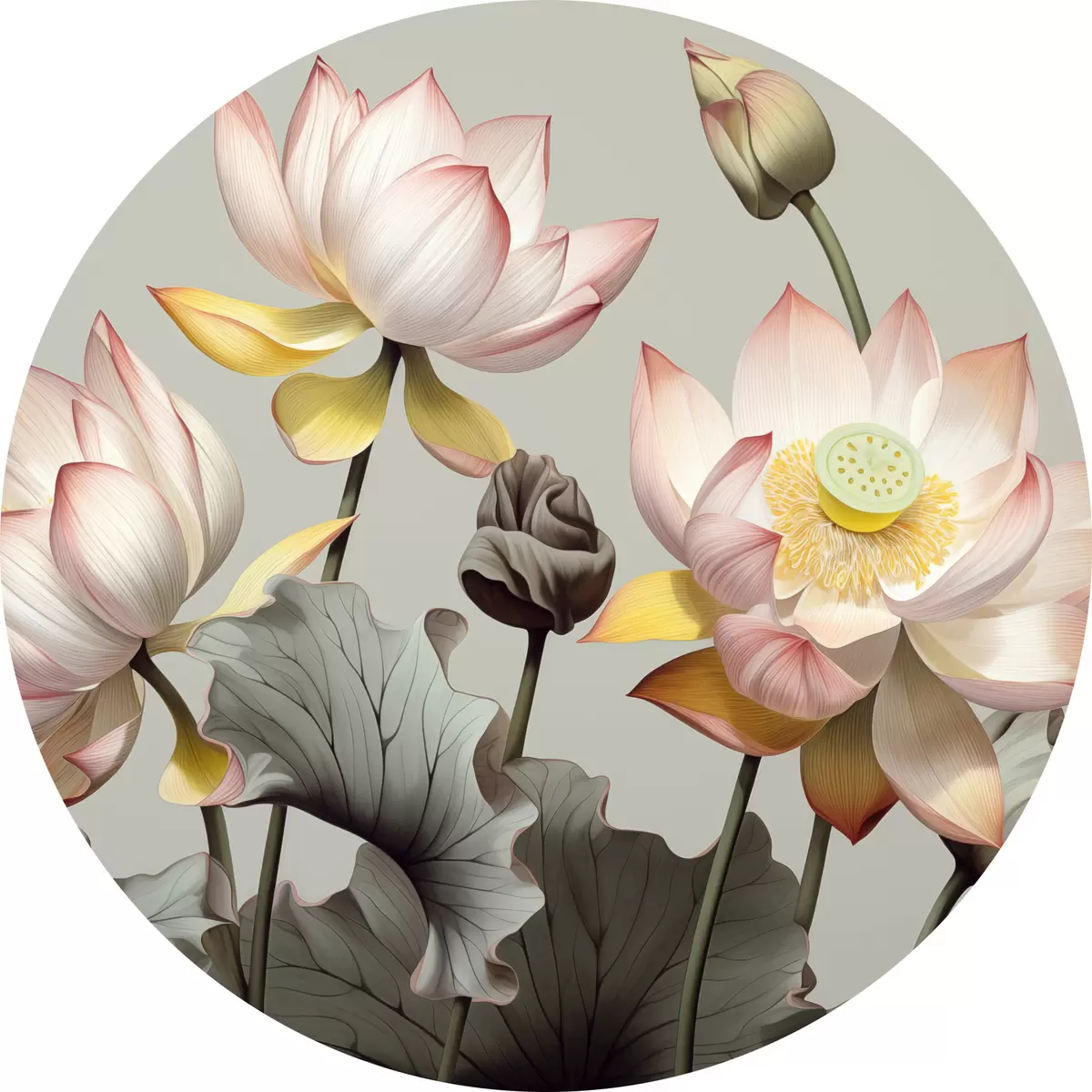 Cuadros redondos Flores de loto con pétalos en tonos pastel y hojas verdes, en una paleta de colores apagados, sobre un fondo liso r44862