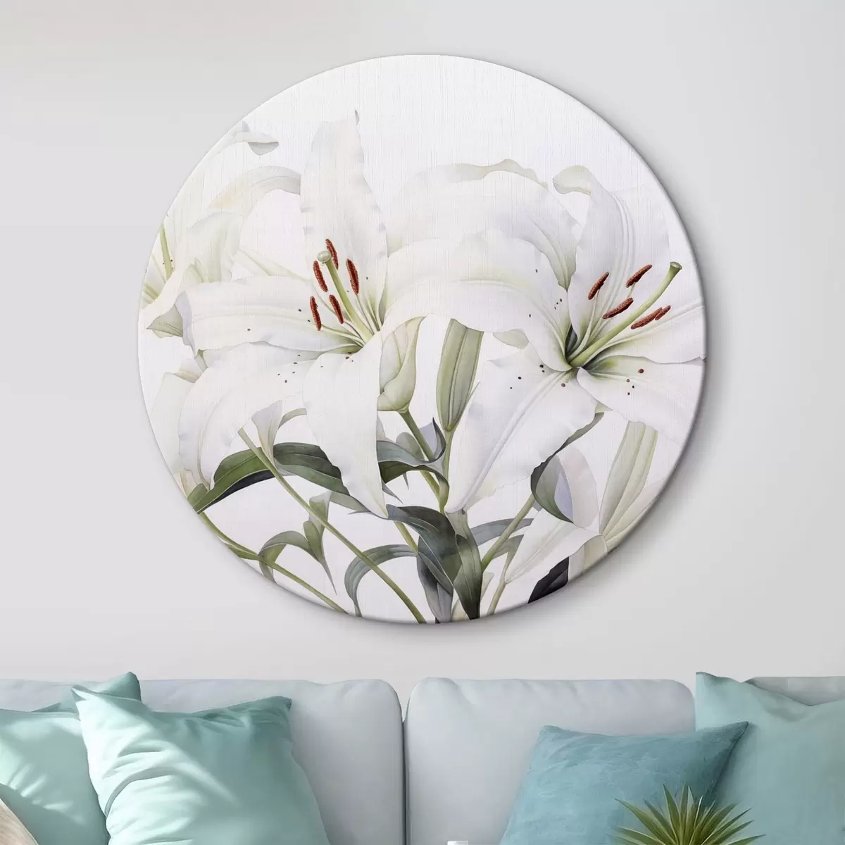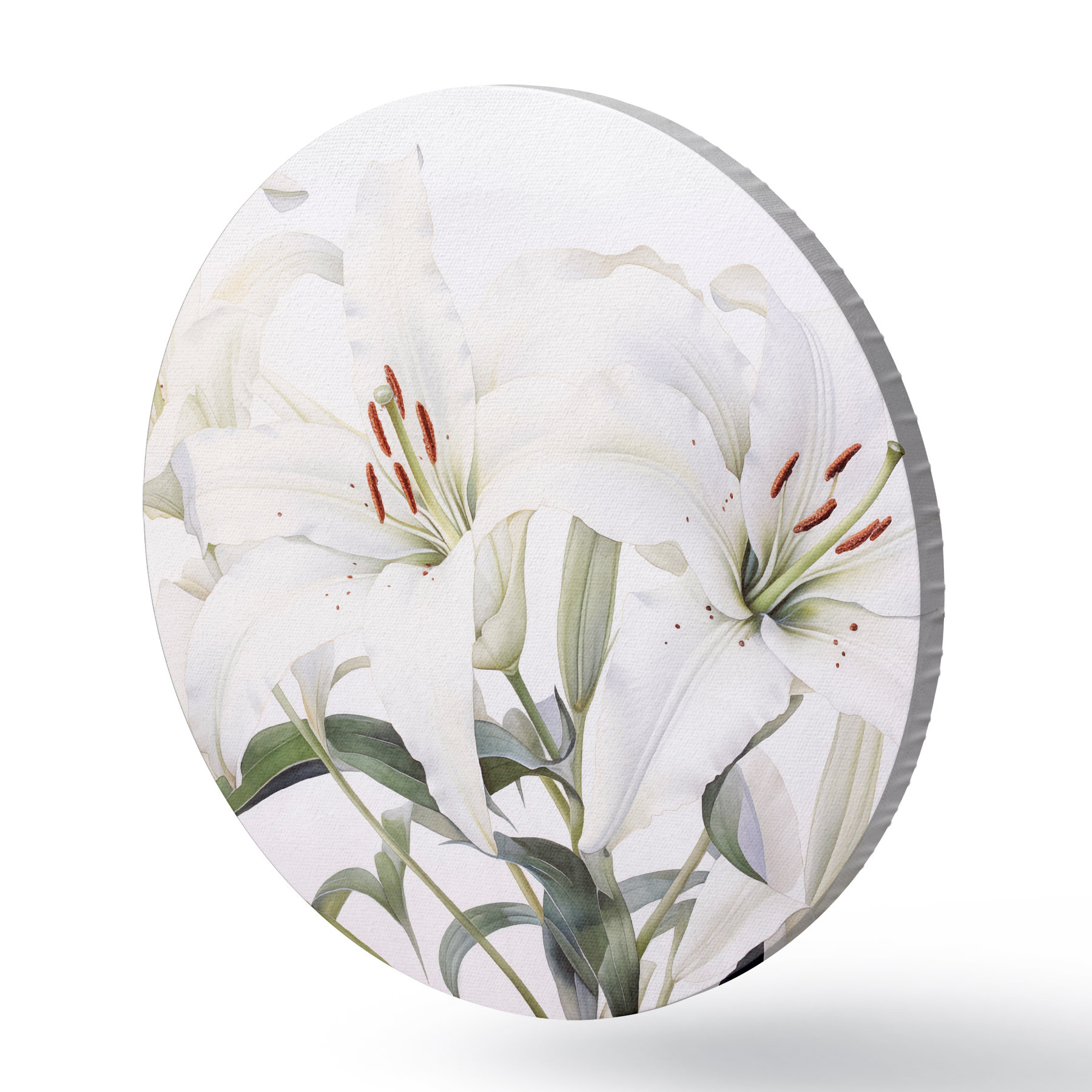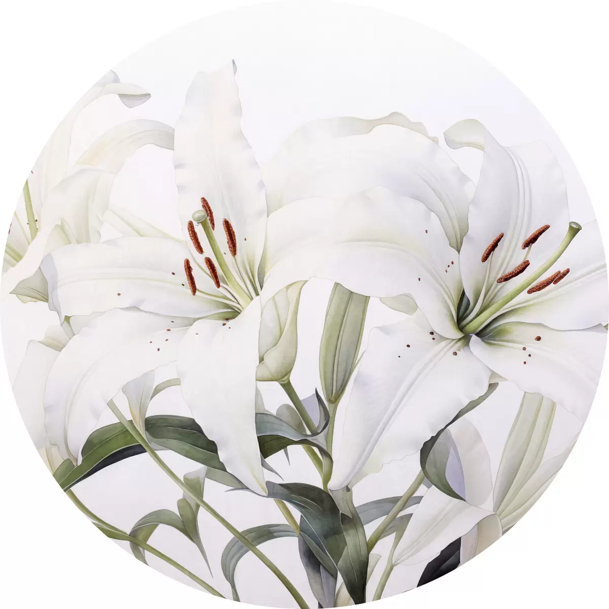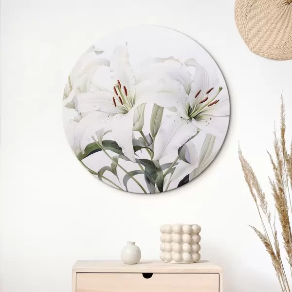 Cuadros redondos Un ramo de lirios blancos con hojas verdes, delicados pétalos y suave fondo blanco r44868