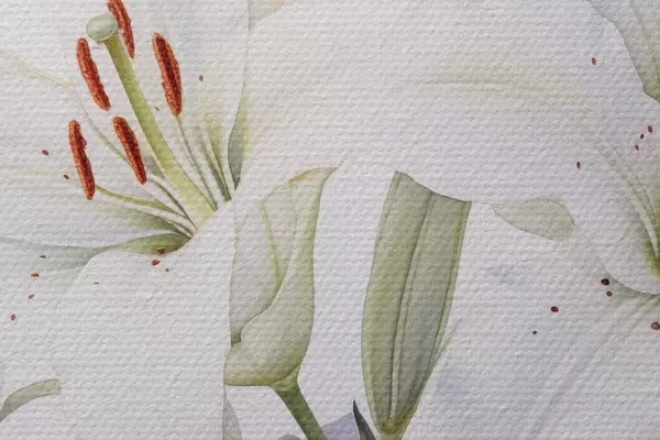 Foto Un ramo de lirios blancos con hojas verdes, delicados pétalos y suave fondo blanco Nr r44868