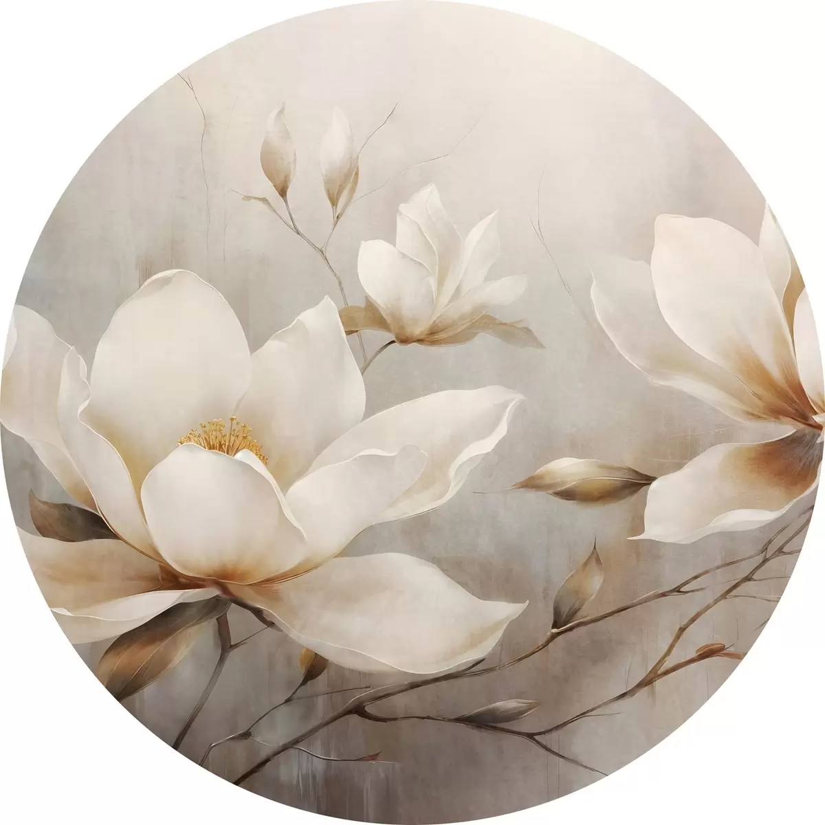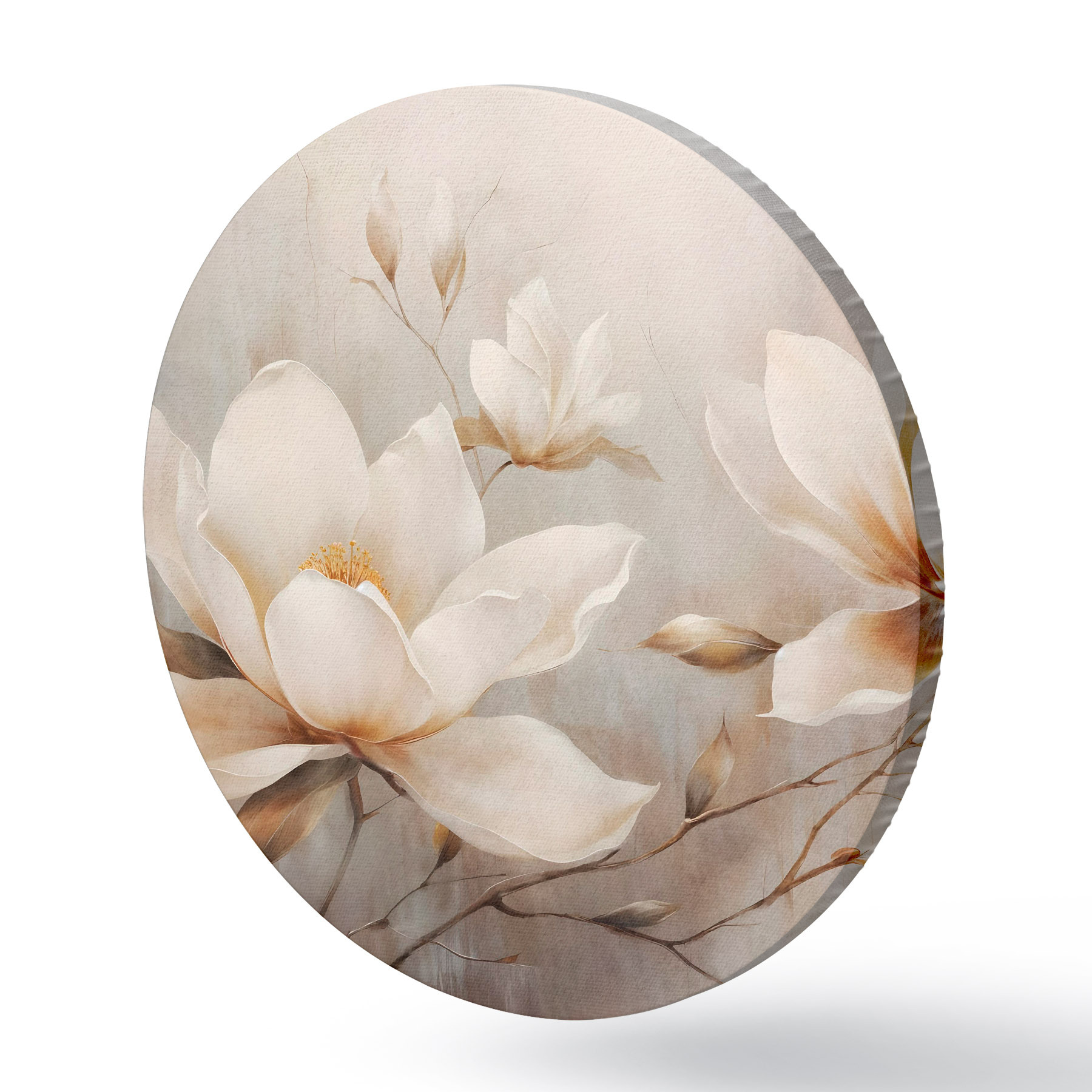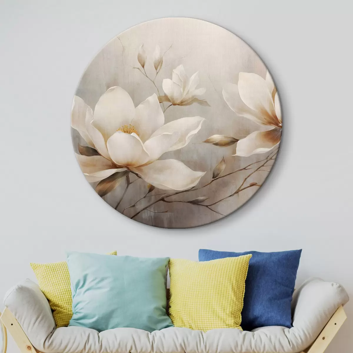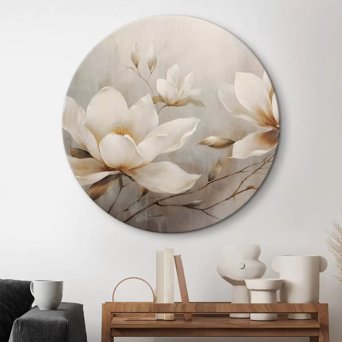 Cuadros redondos Textura vintage de flores blancas de magnolia sobre ramas en un fondo marrón claro r44869