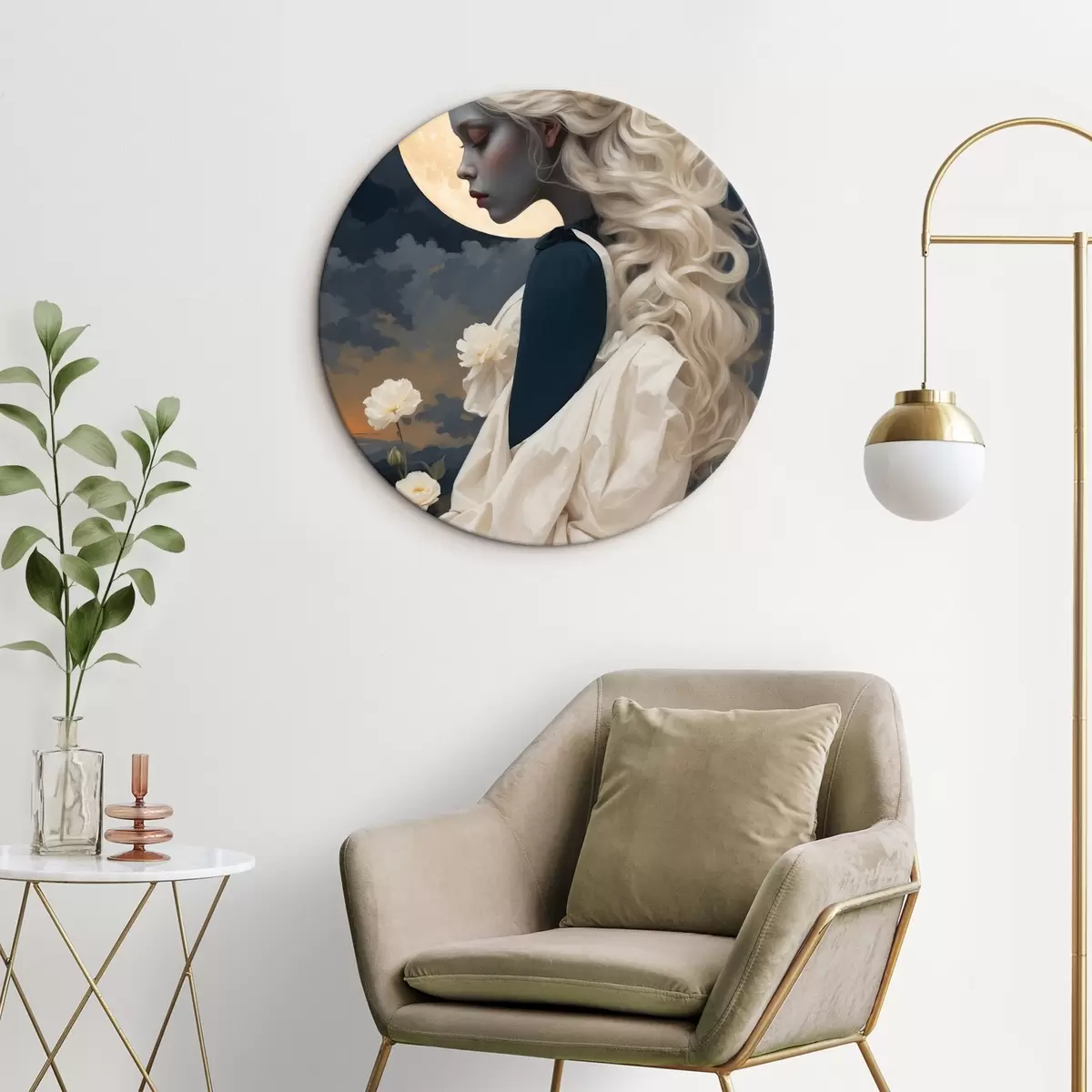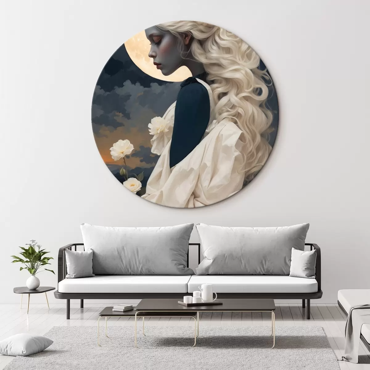 Cuadros redondos Retrato de niña con pelo blanco y luna llena r44887