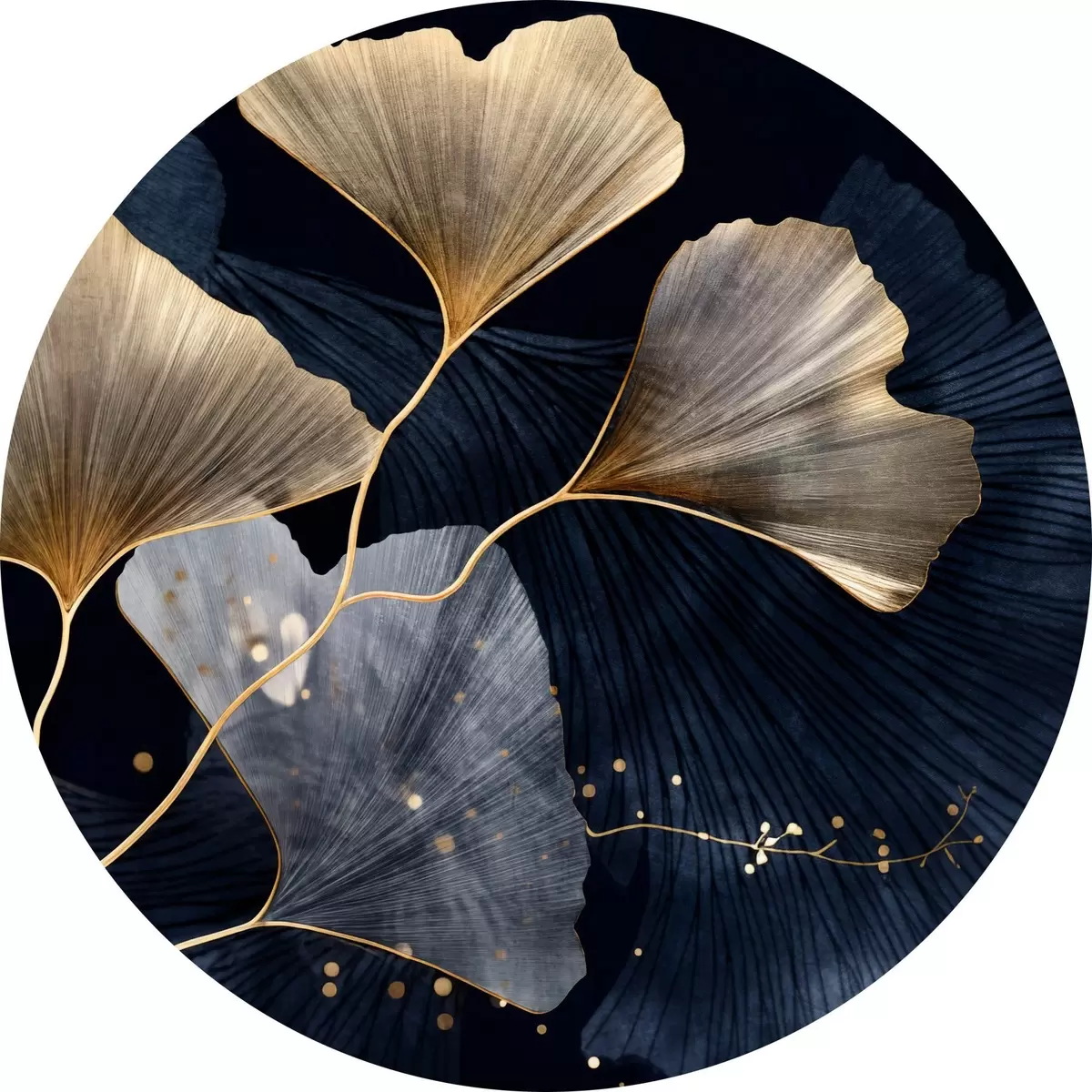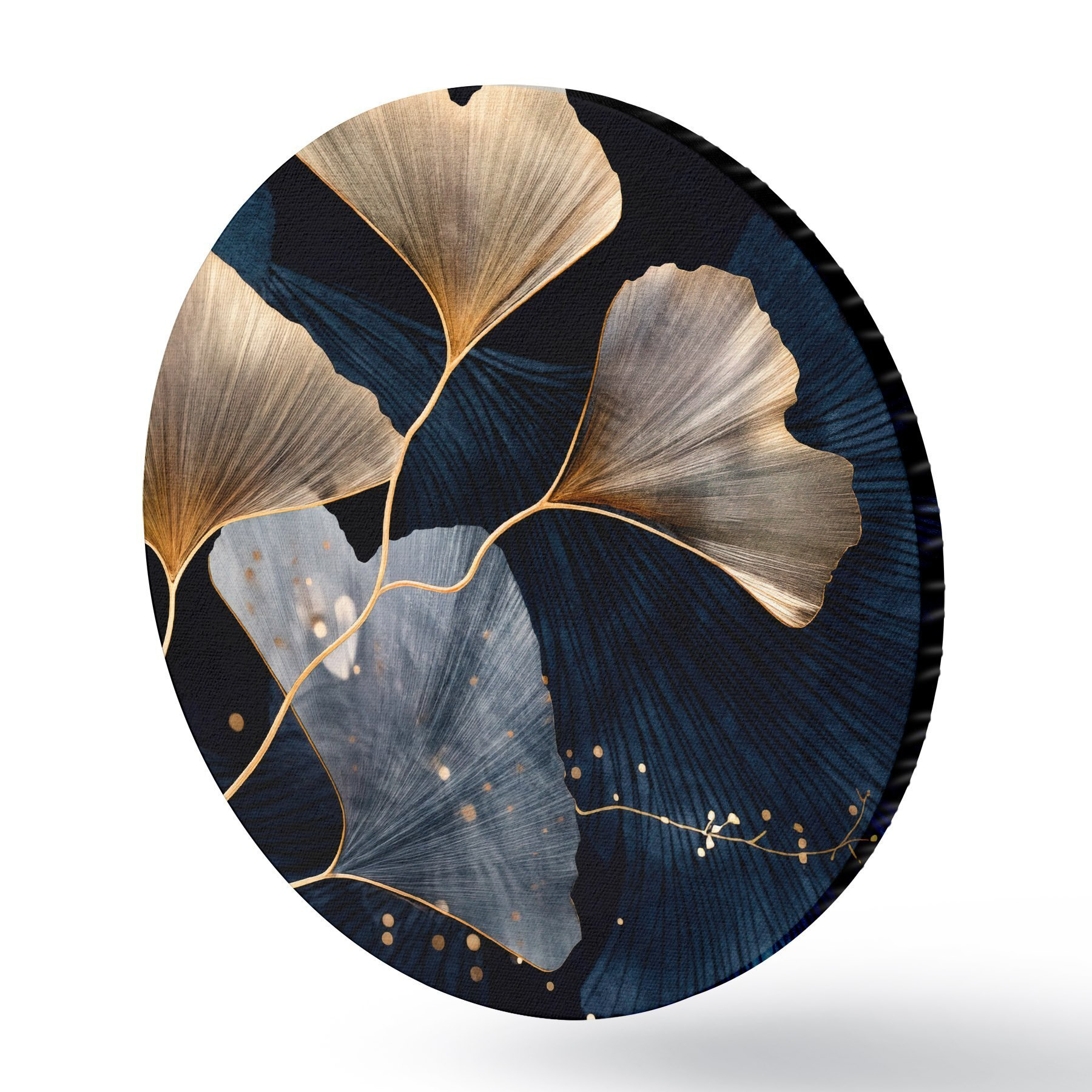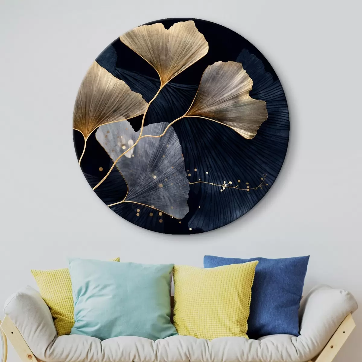 Cuadros redondos Hojas de ginkgo en tonos amarillos y azules, elegante fondo oscuro, arte moderno, estilo minimalista, inspirado en la naturaleza r44921