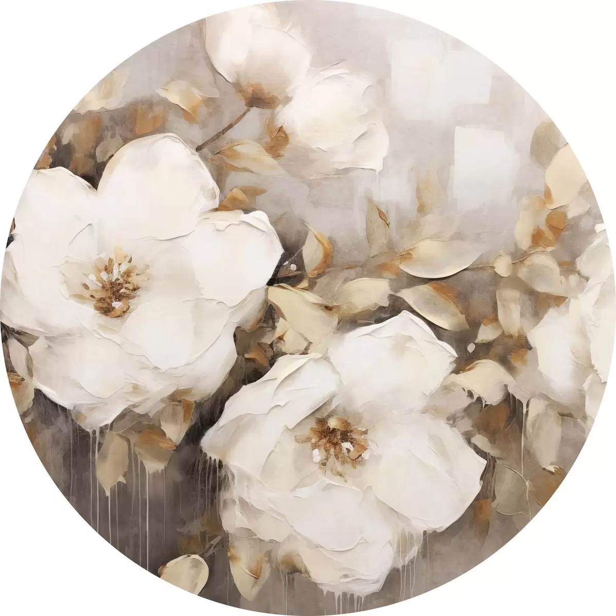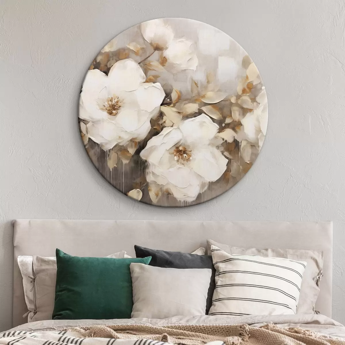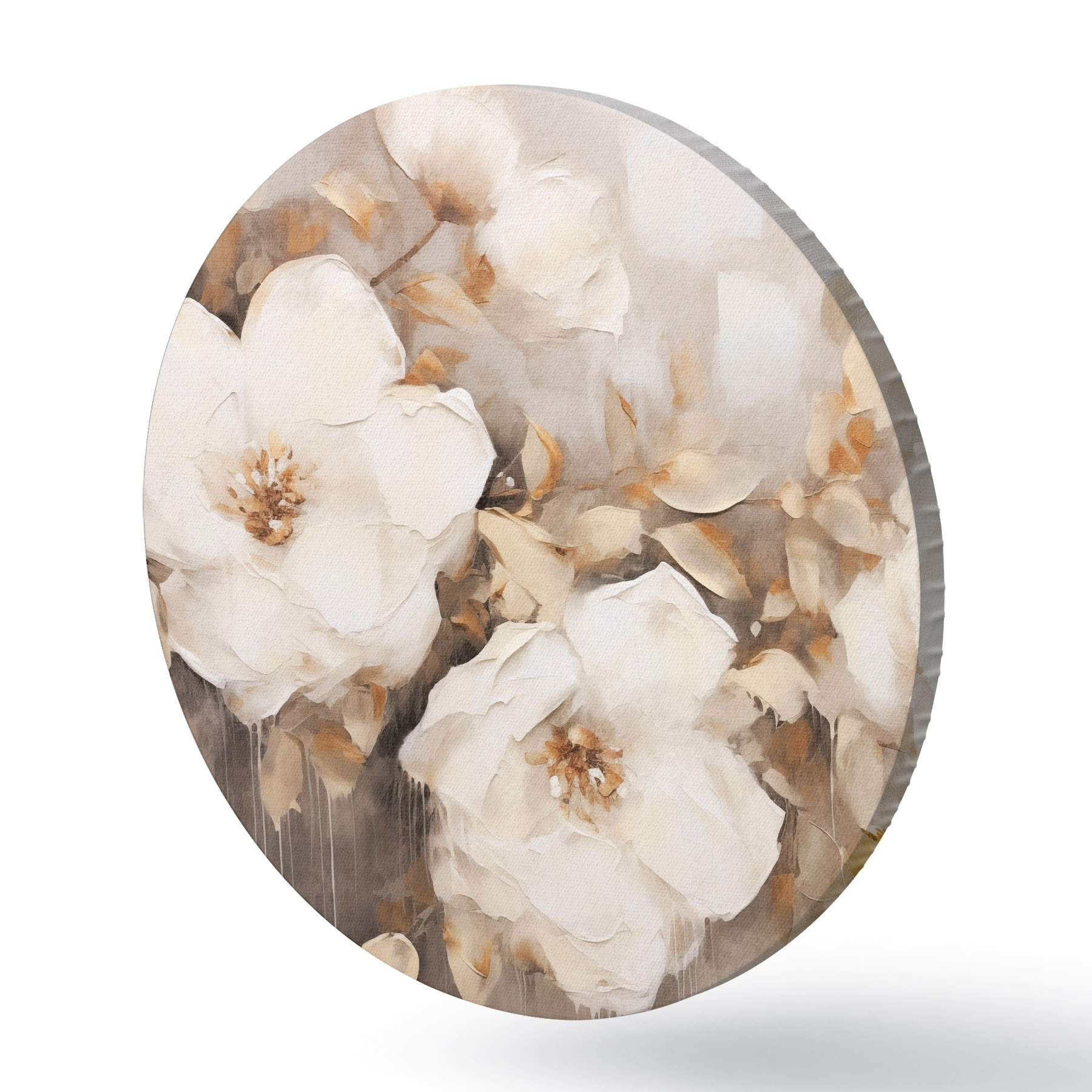 Cuadros redondos Flores blancas con hojas marrones en un fondo beige, imitación de pintura al óleo, arreglo floral, arte botánico r44922