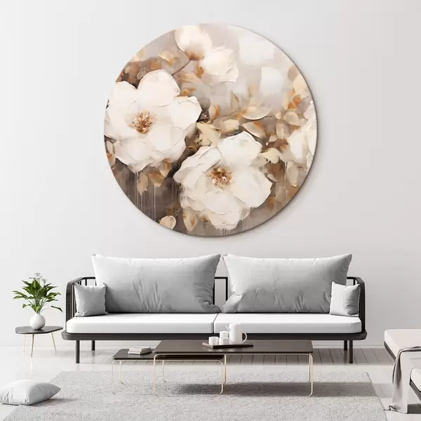 Cuadros redondos Flores blancas con hojas marrones en un fondo beige, imitación de pintura al óleo, arreglo floral, arte botánico r44922