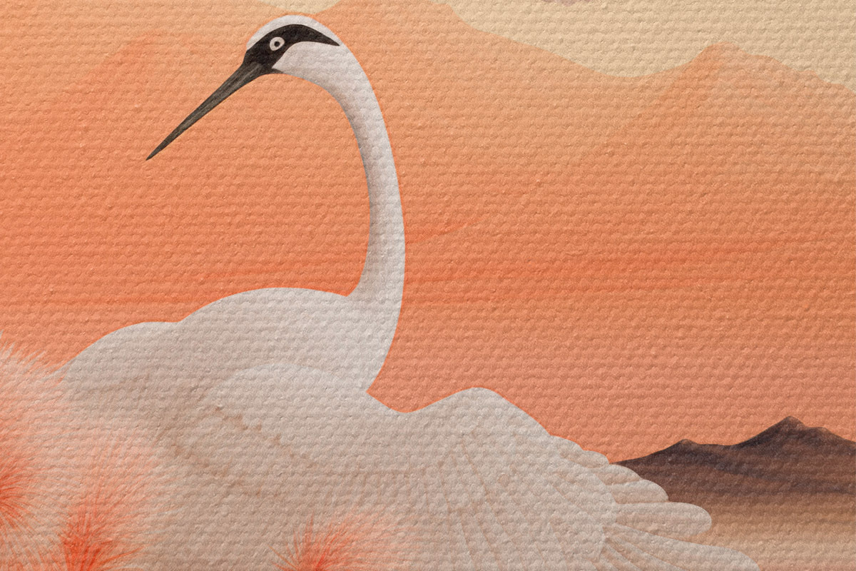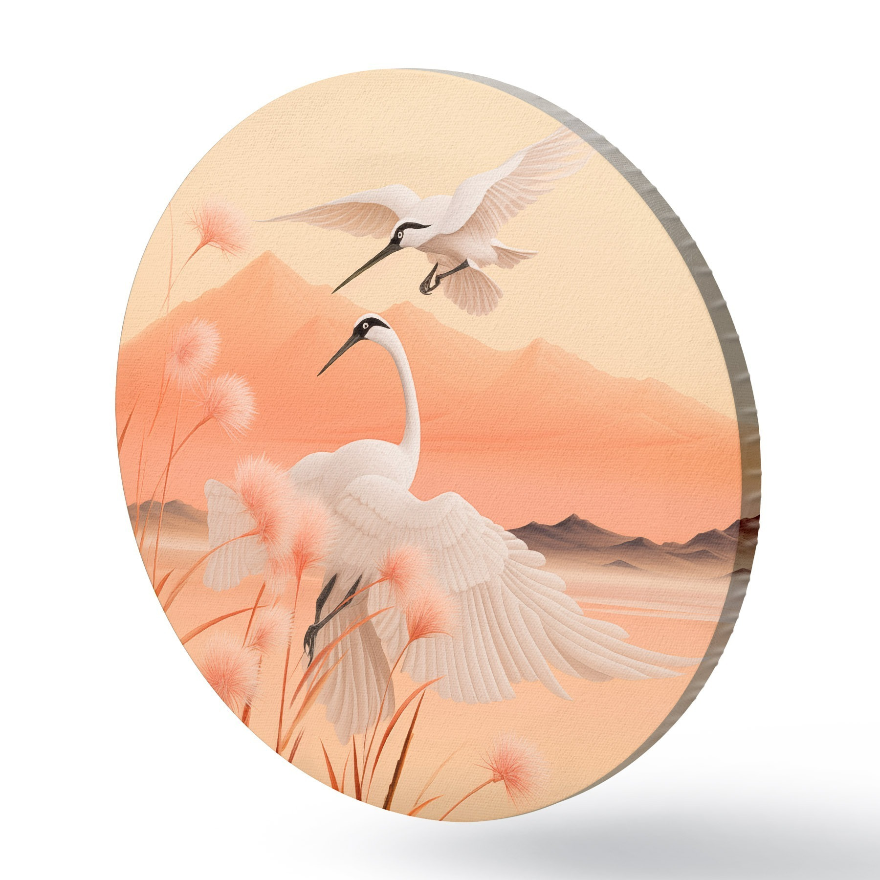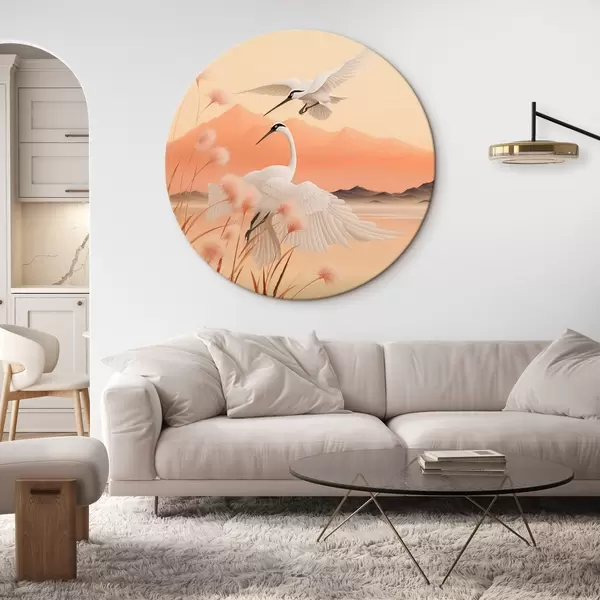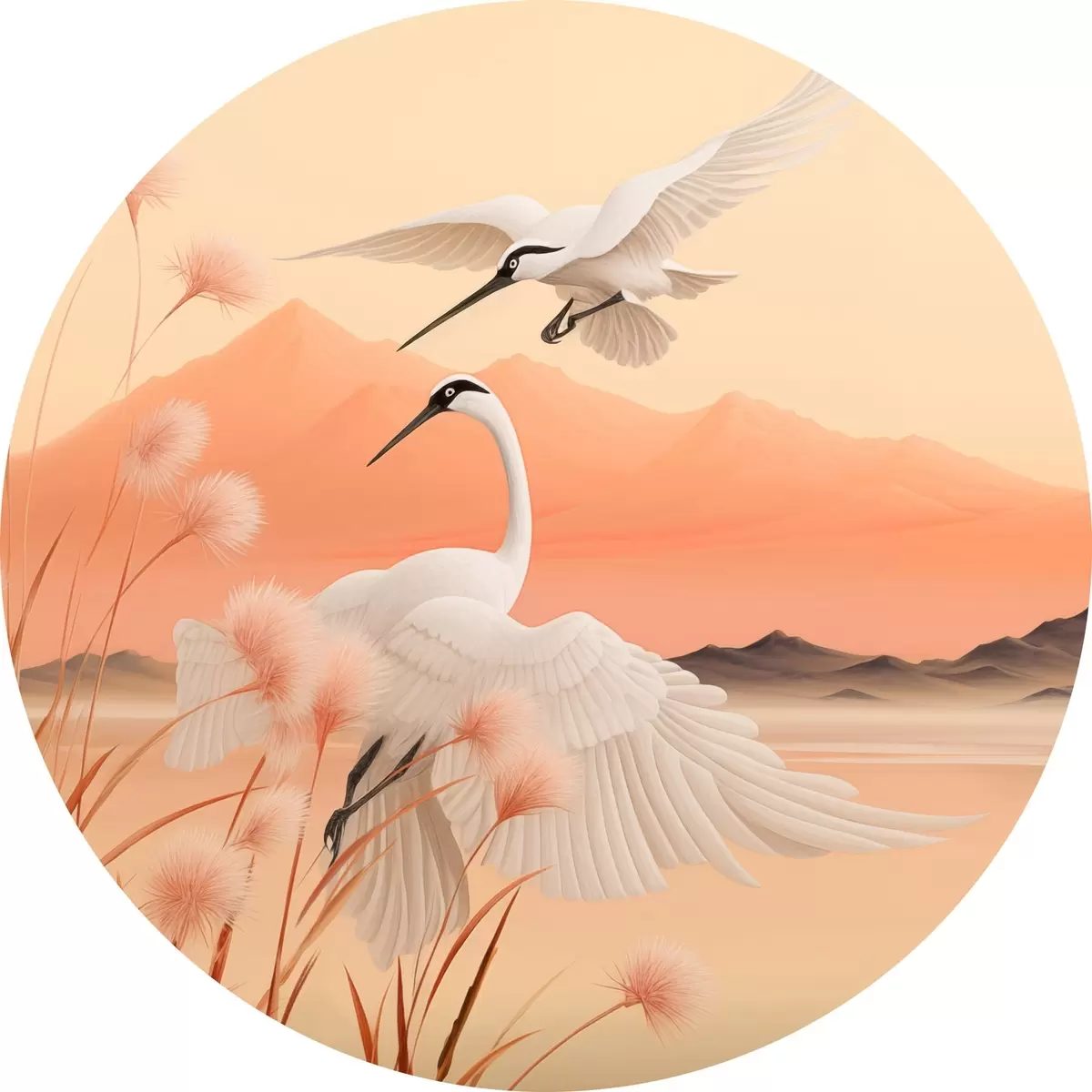 Cuadros redondos Grullas blancas con juncos rosas en primer plano, montañas y un lago al fondo, luz suave anaranjada r44925