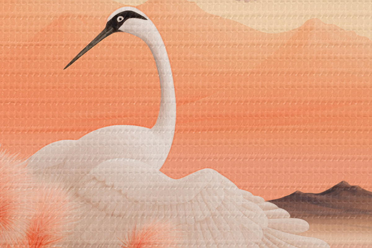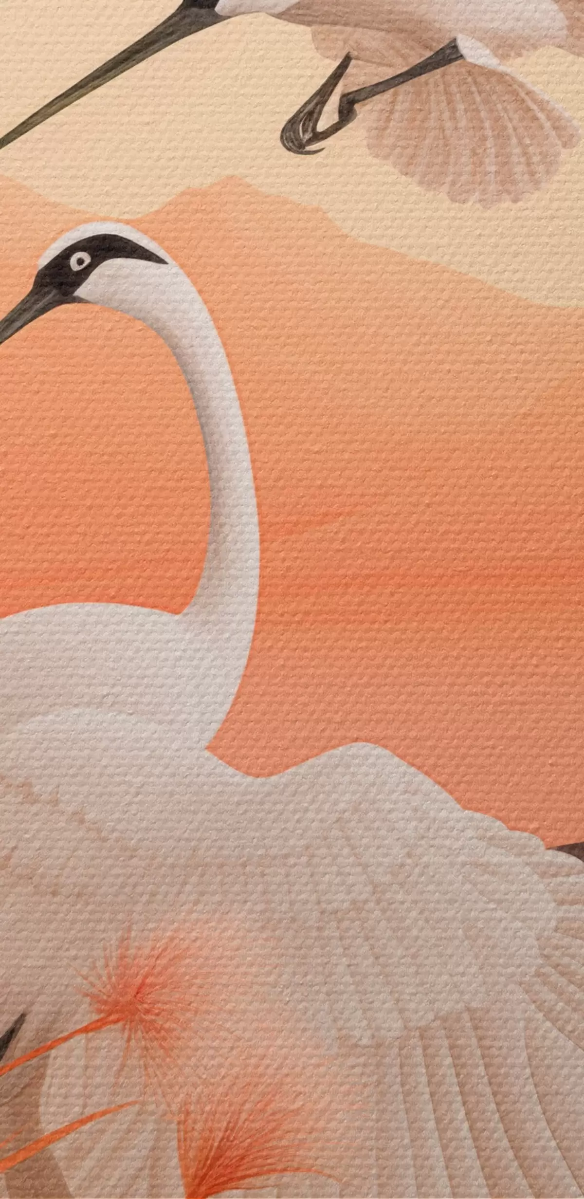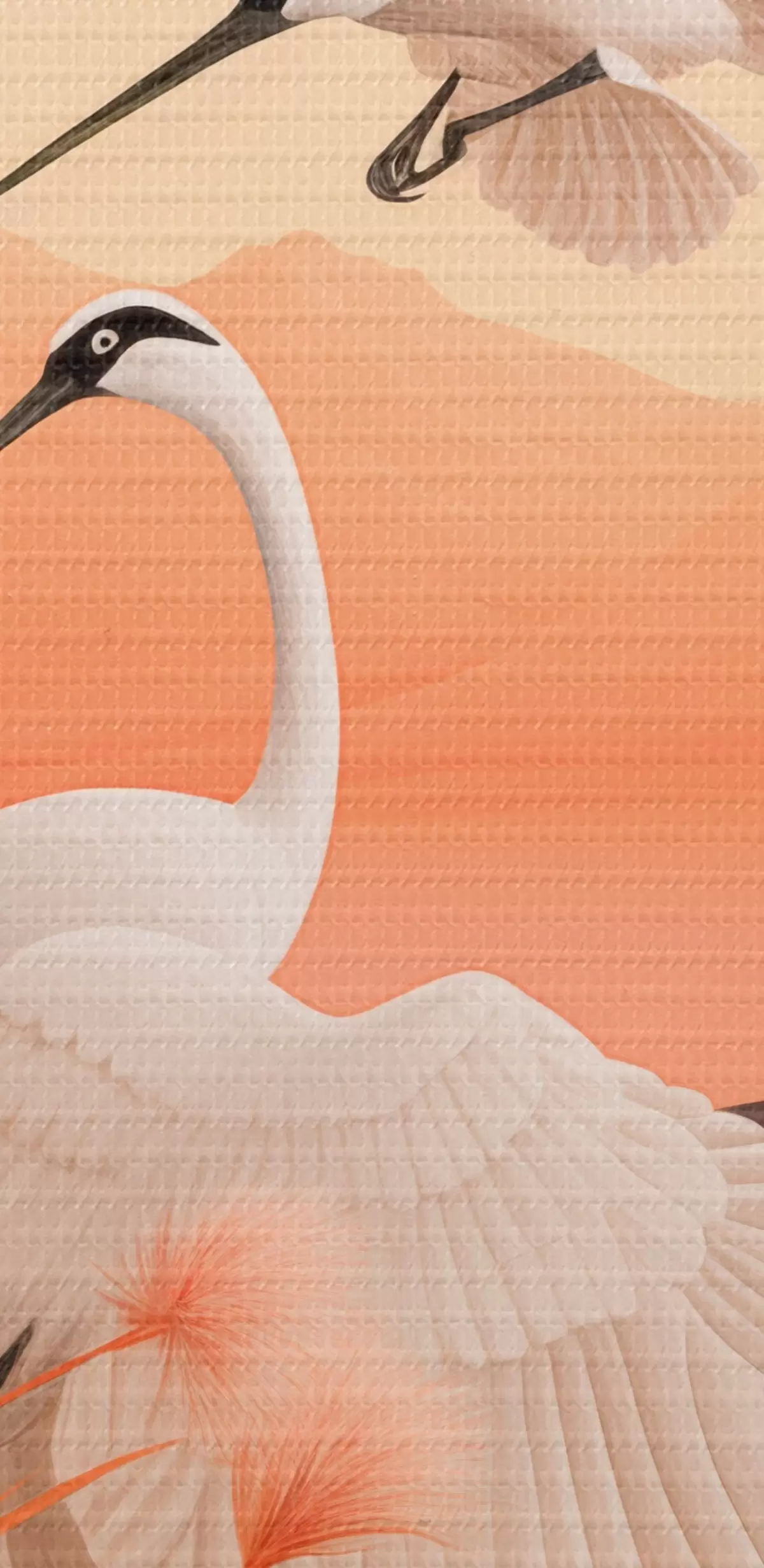 Cuadros redondos Grullas blancas con juncos rosas en primer plano, montañas y un lago al fondo, luz suave anaranjada r44925