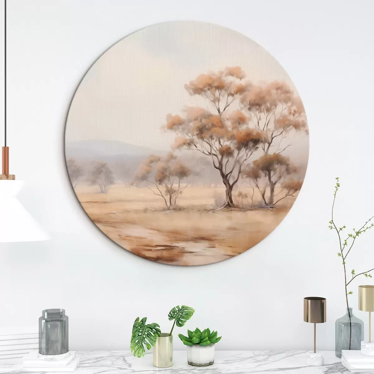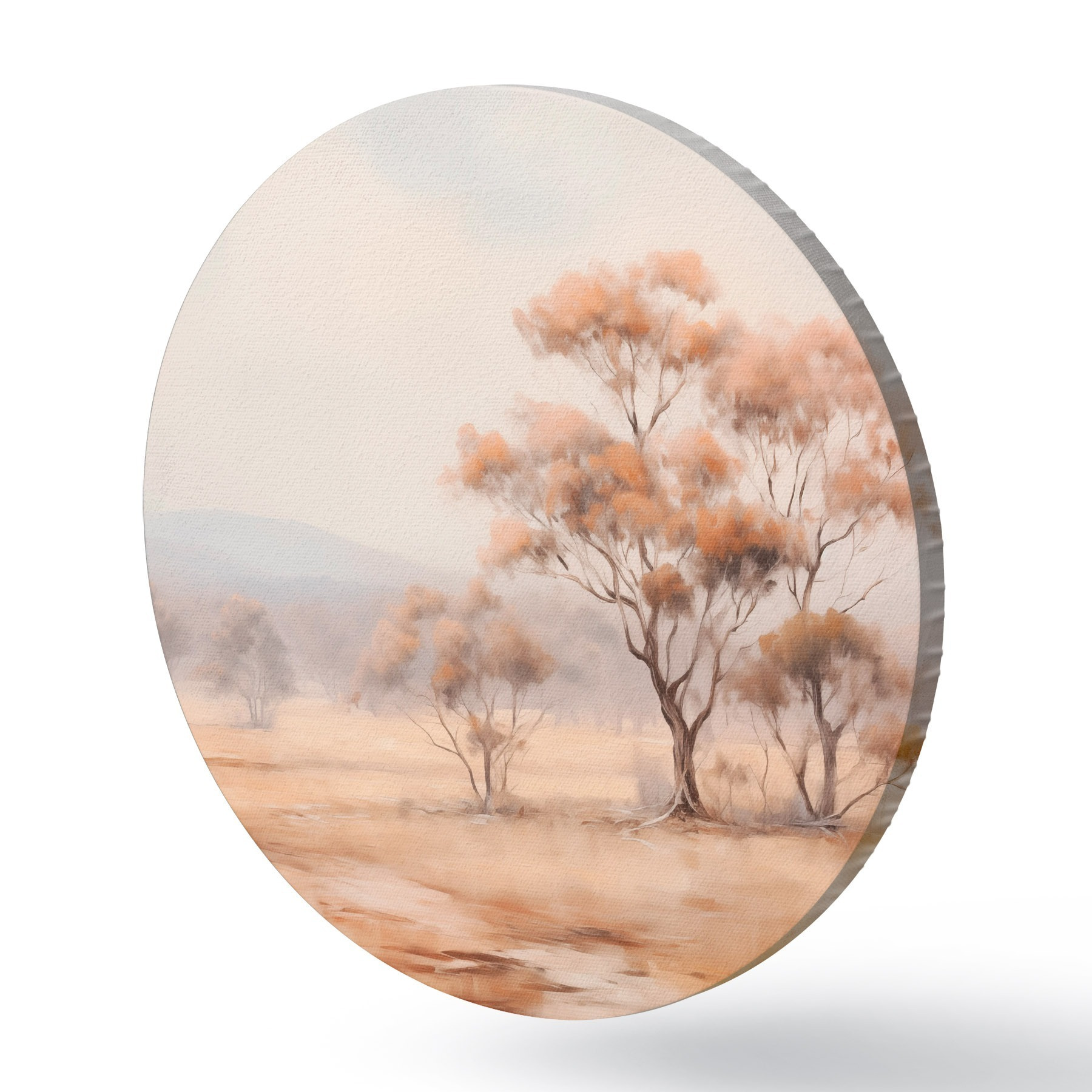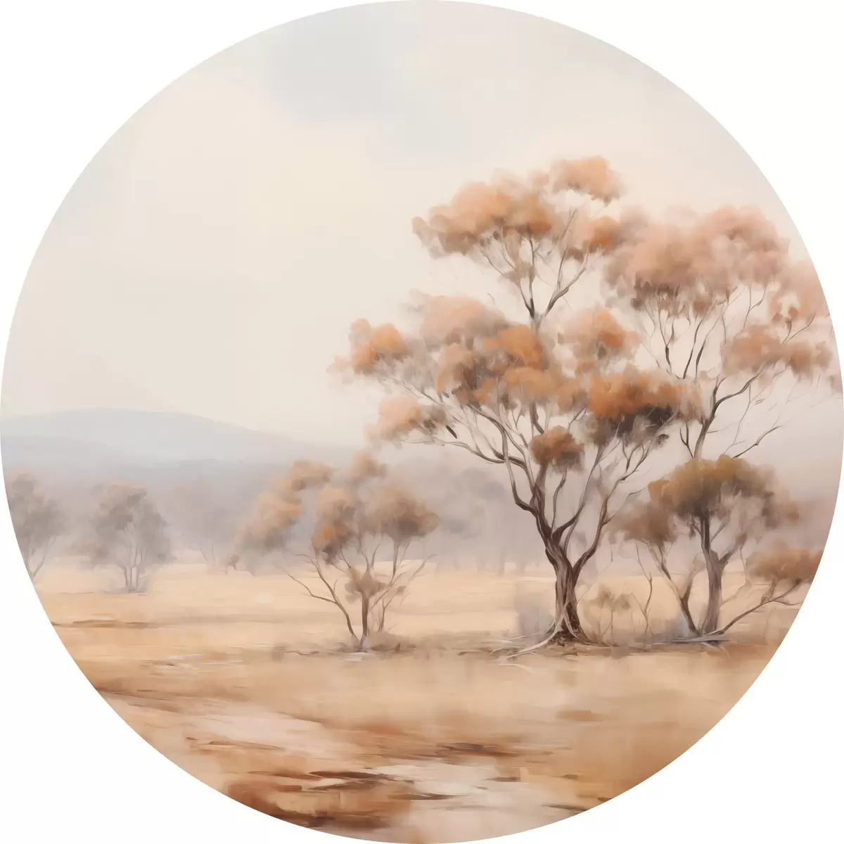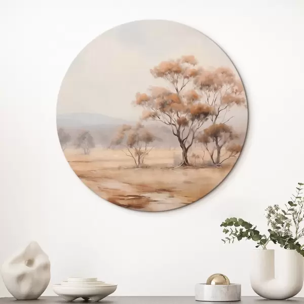Cuadros redondos Un campo con hierba naranja y algunos árboles con hojas naranjas, montañas al fondo con un cielo nublado r44927