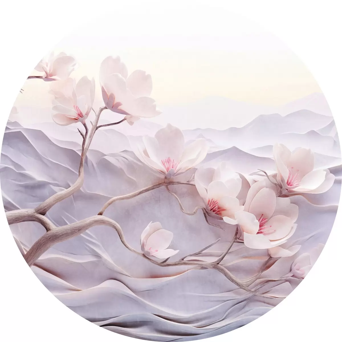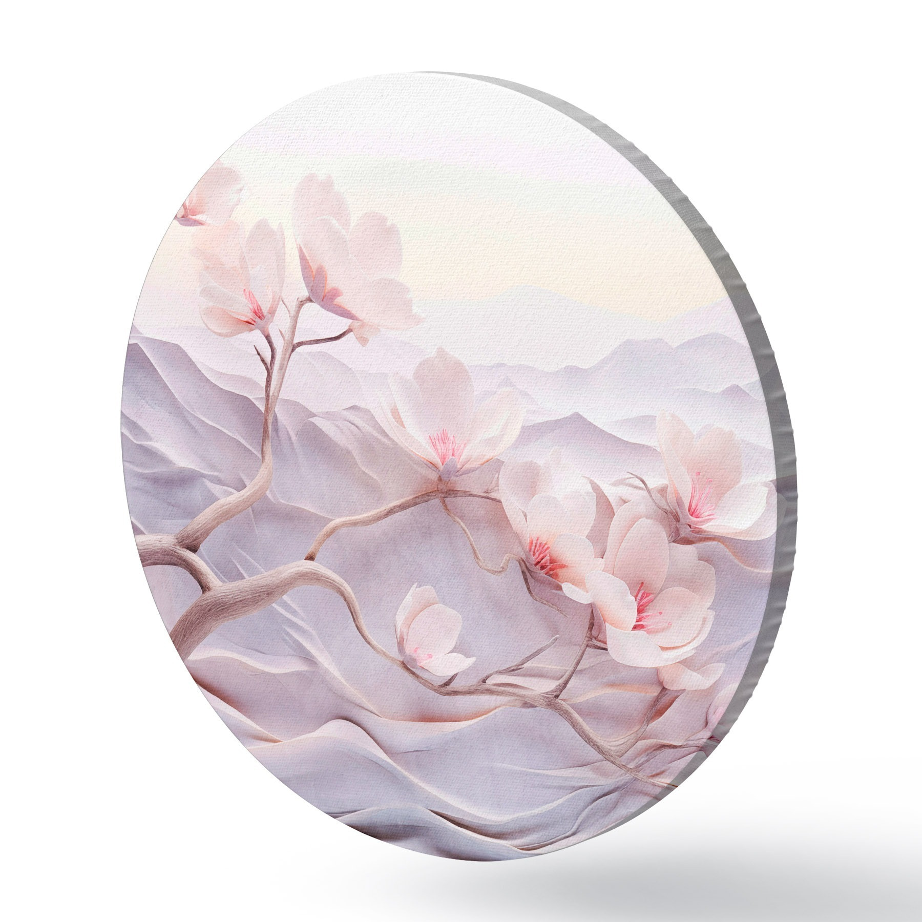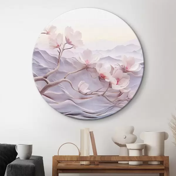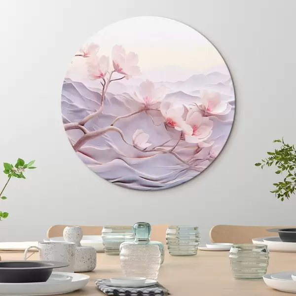 Cuadros redondos Rama florecida con flores rosas, montañas al fondo, suaves colores pastel, arte japonés con textura r44930