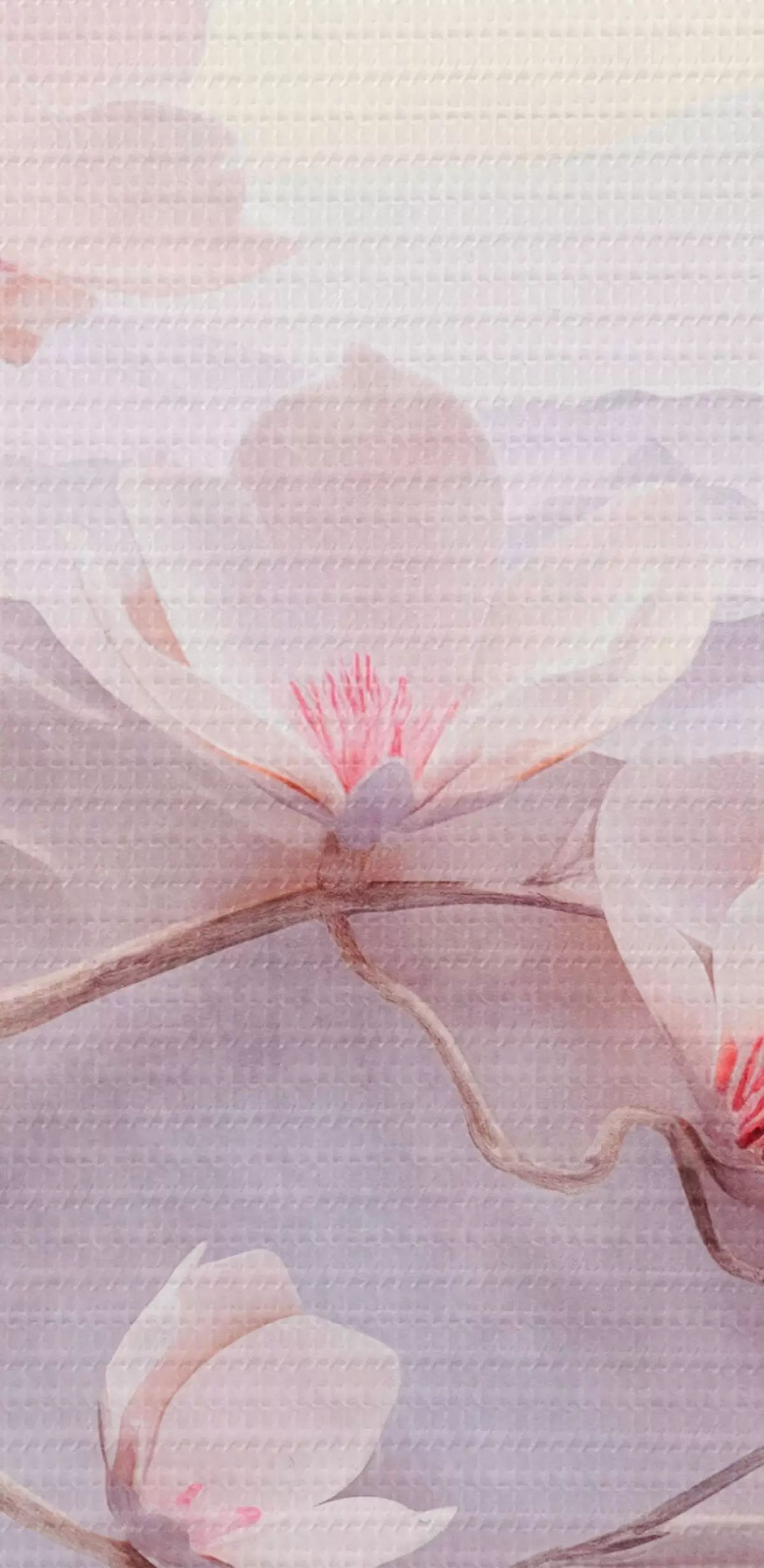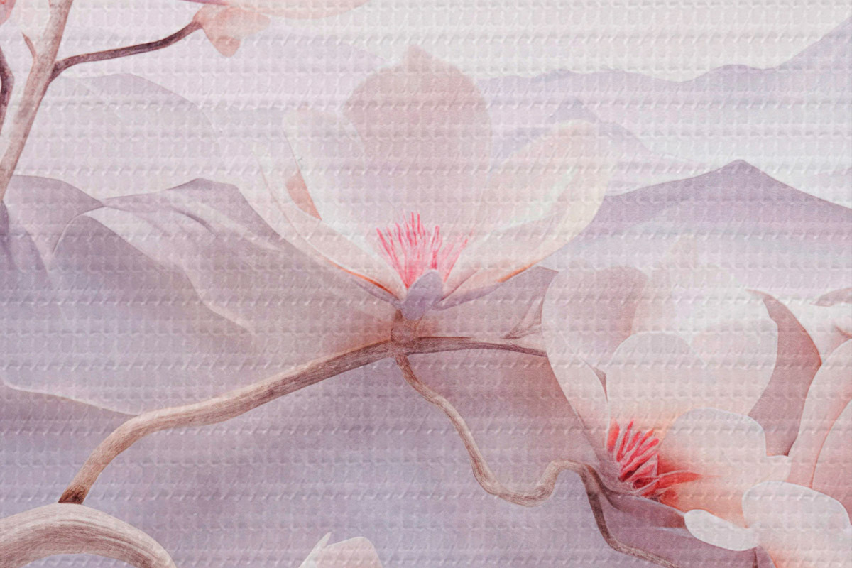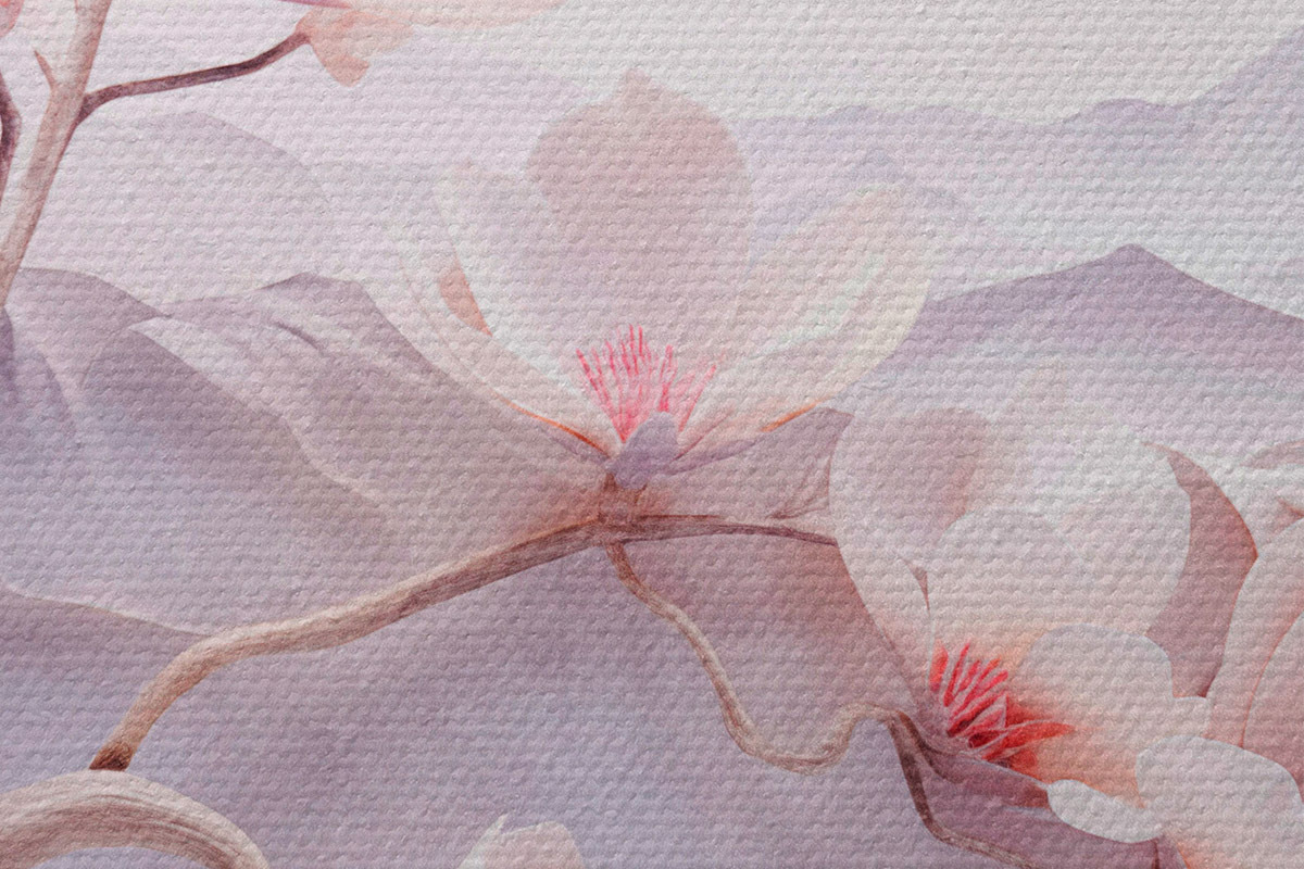 Foto Rama florecida con flores rosas, montañas al fondo, suaves colores pastel, arte japonés con textura Nr r44930