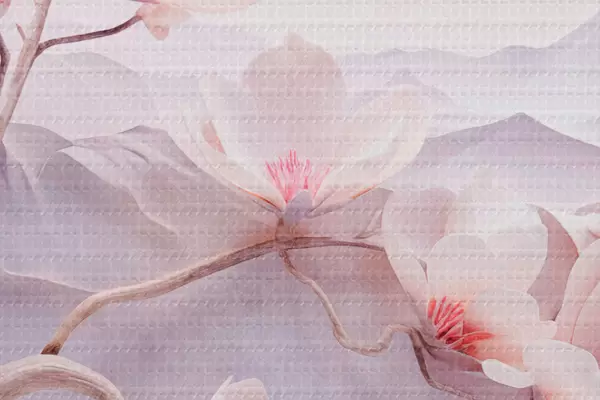 Foto Rama florecida con flores rosas, montañas al fondo, suaves colores pastel, arte japonés con textura Nr r44930