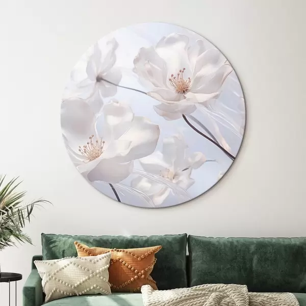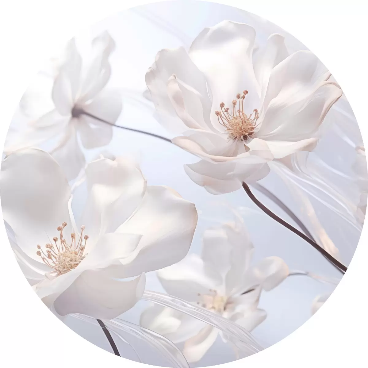 Cuadros redondos Flores blancas con pétalos translúcidos, fondo azul claro suave, elegante, romántico, delicado, de ensueño r44931