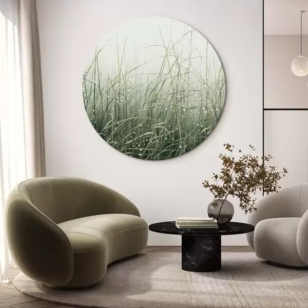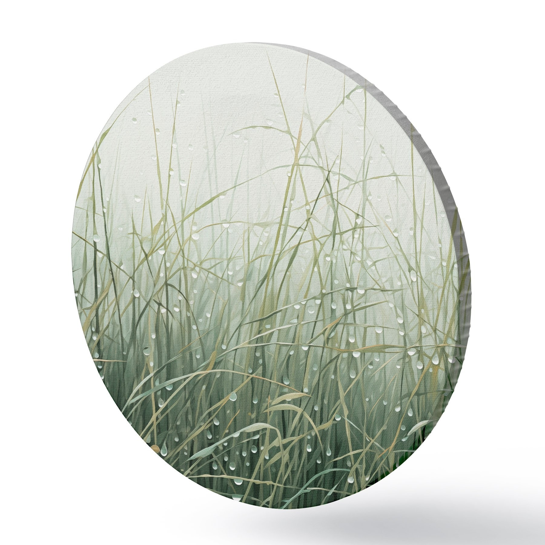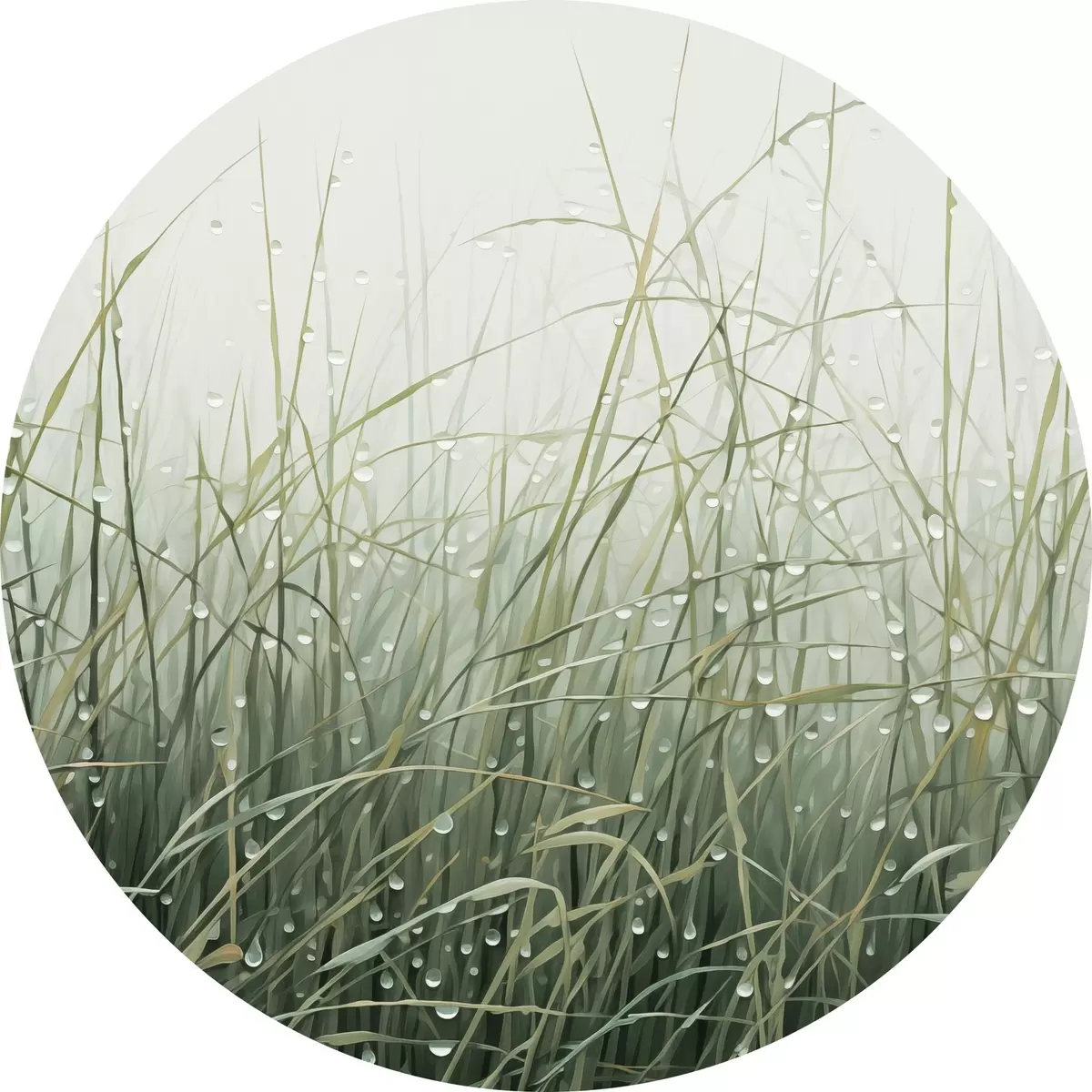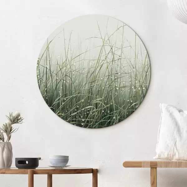 Cuadros redondos Hierba con gotas de agua, tonos verdes, luz suave, fondo brumoso, estilo abstracto minimalista texturizado r44932