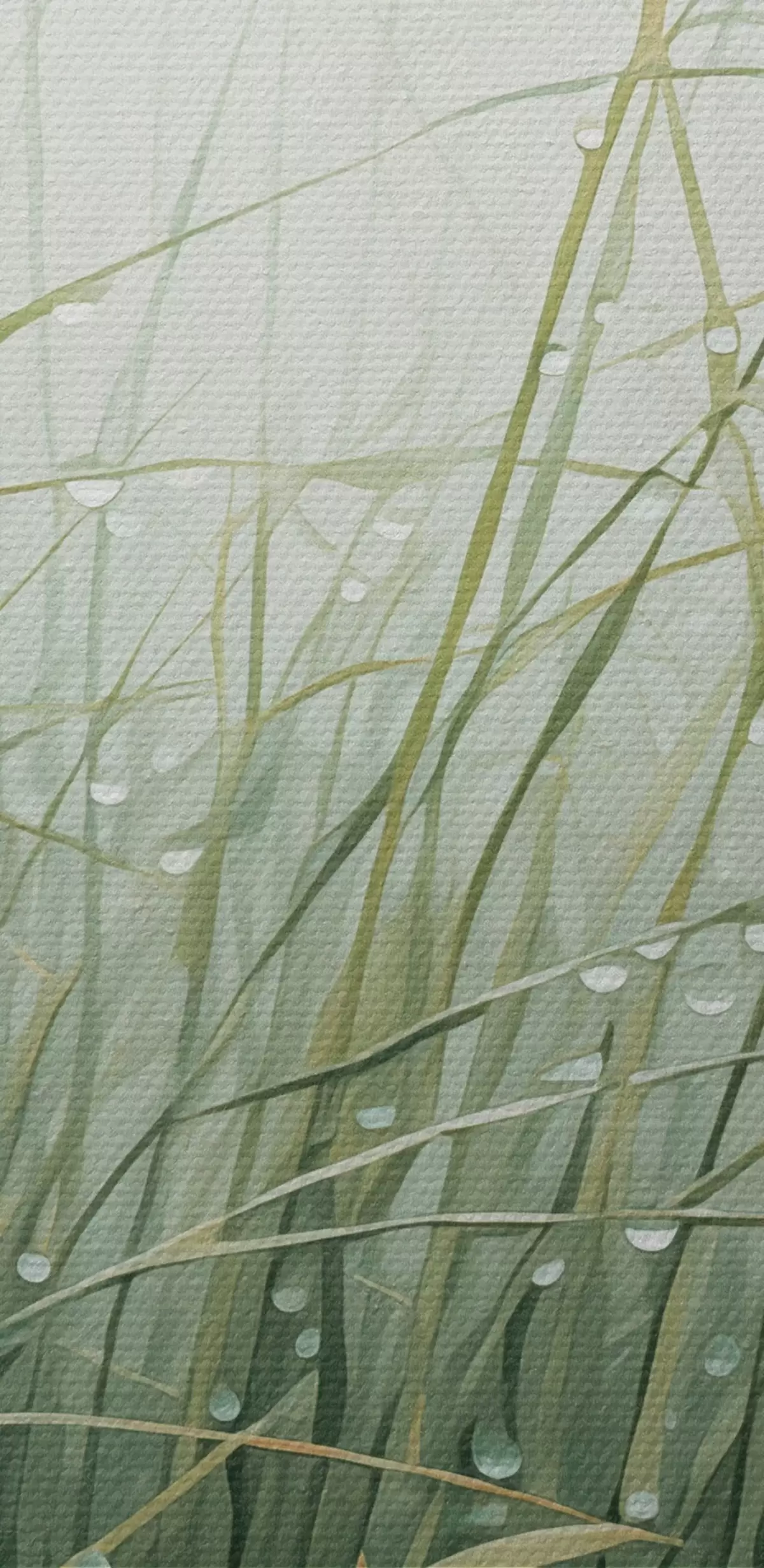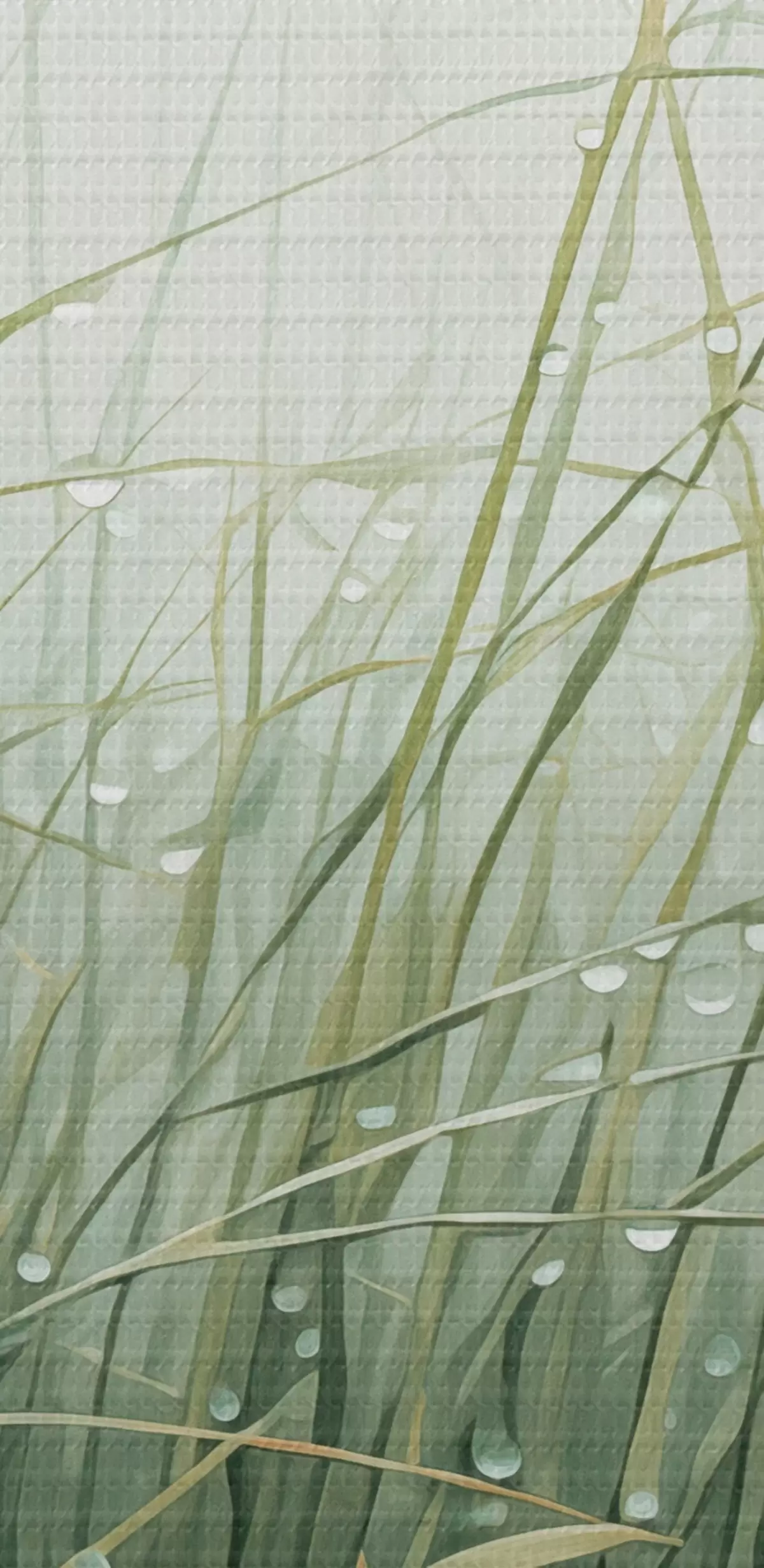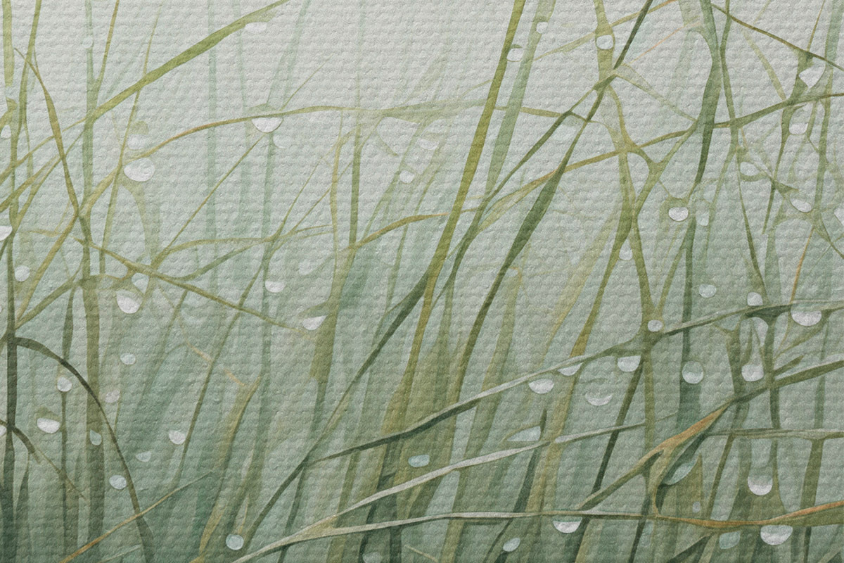 Foto Hierba con gotas de agua, tonos verdes, luz suave, fondo brumoso, estilo abstracto minimalista texturizado Nr r44932
