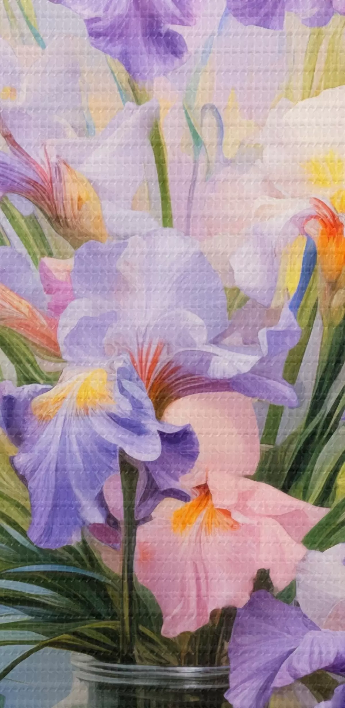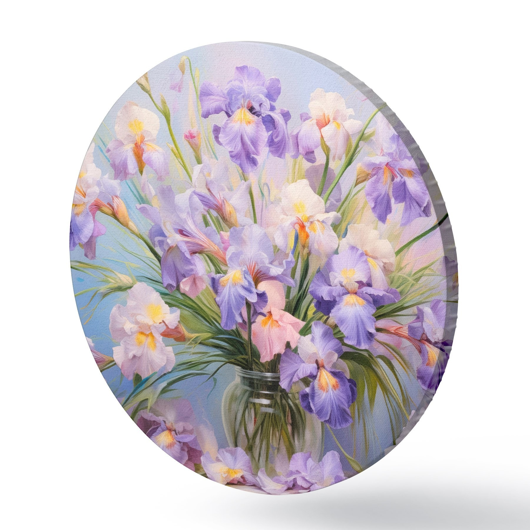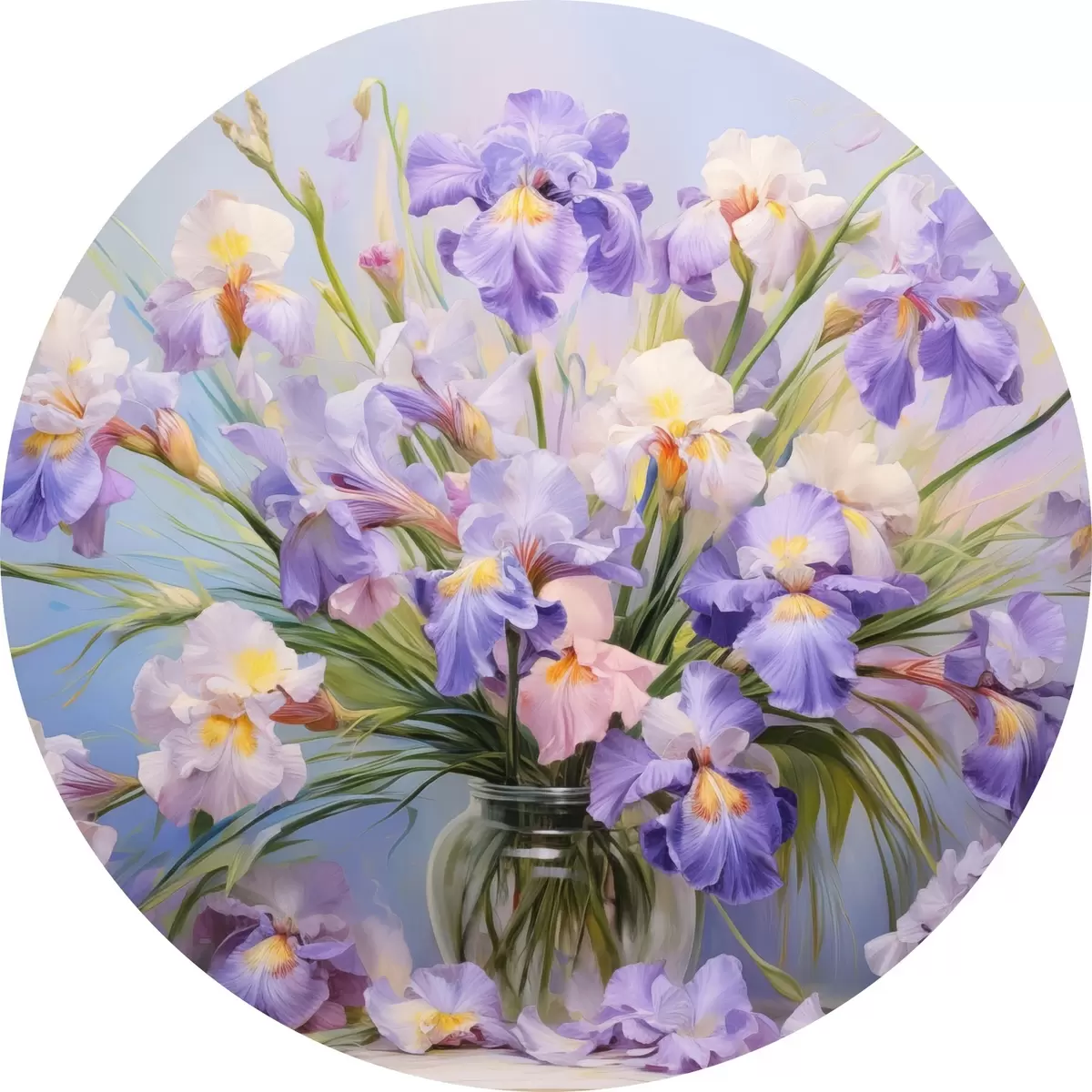 Cuadros redondos Un jarrón con muchos lirios pastel, algunos pétalos esparcidos sobre la mesa, fondo pastel suave con tonos azules y rosas r44933