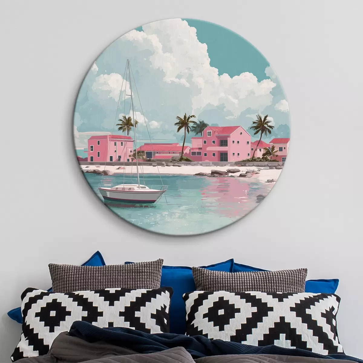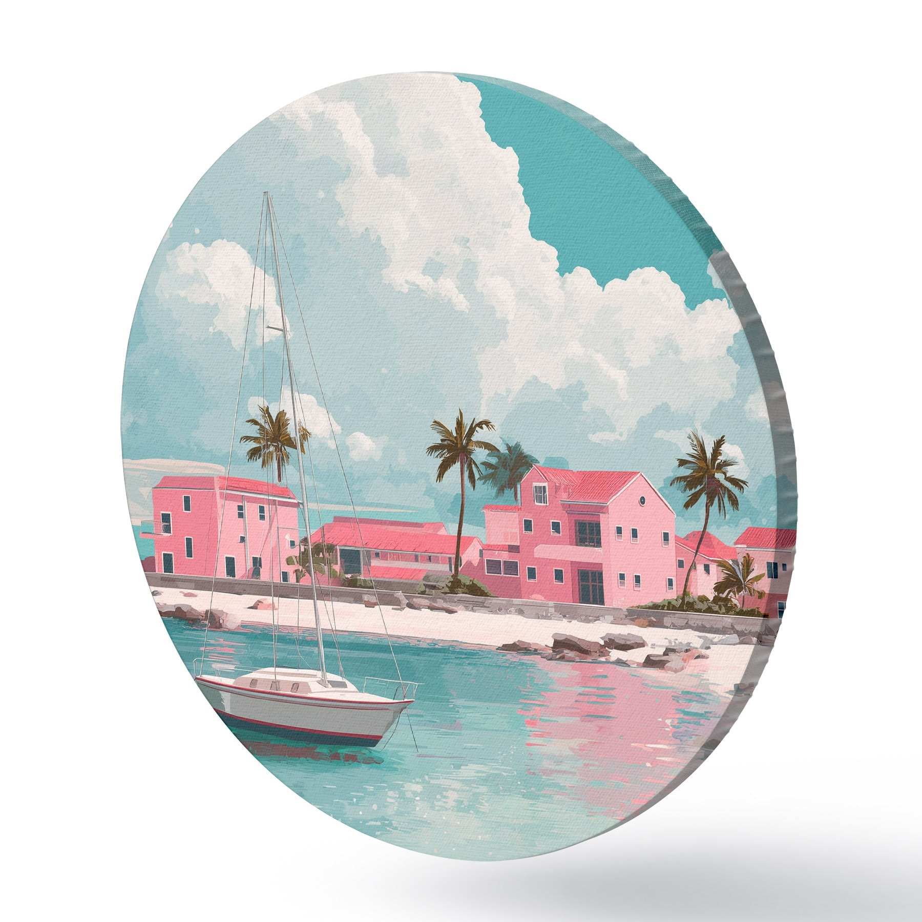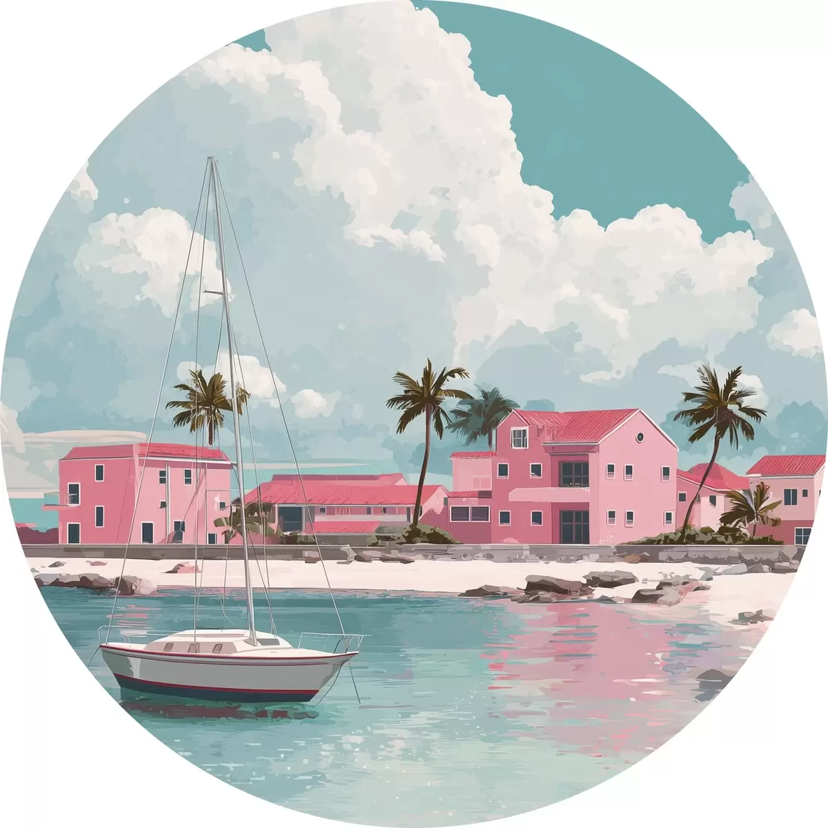 Cuadros redondos Playa rosa con sol radiante, velero y casas r44986