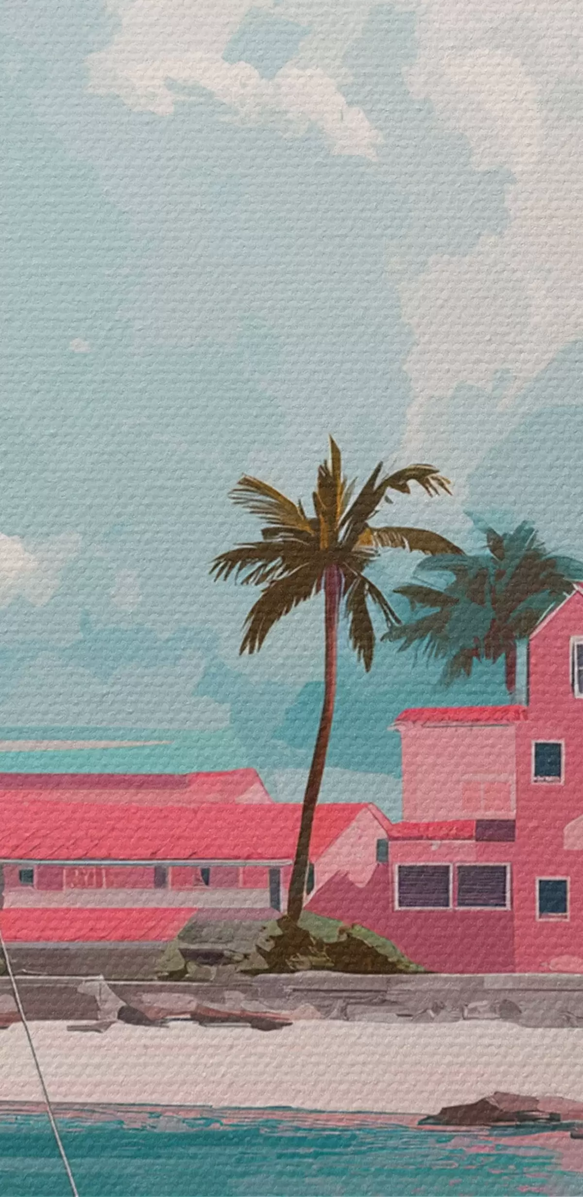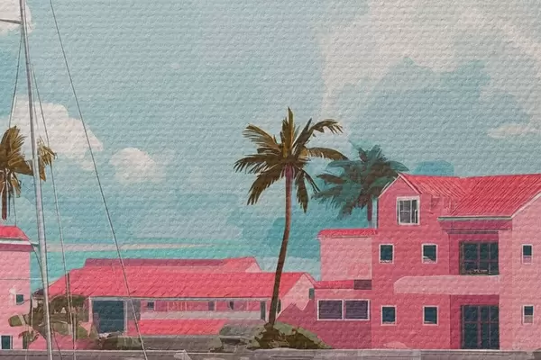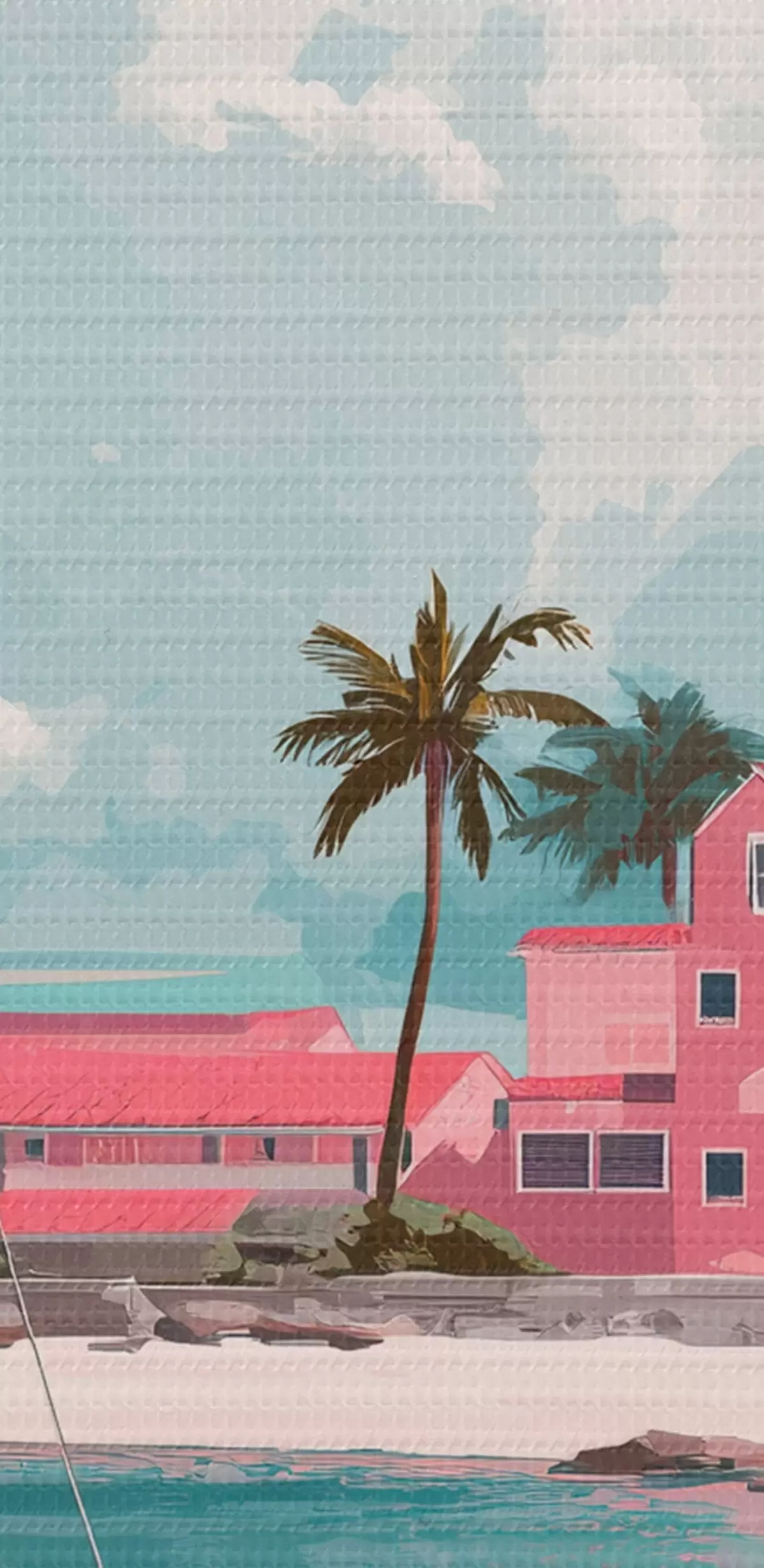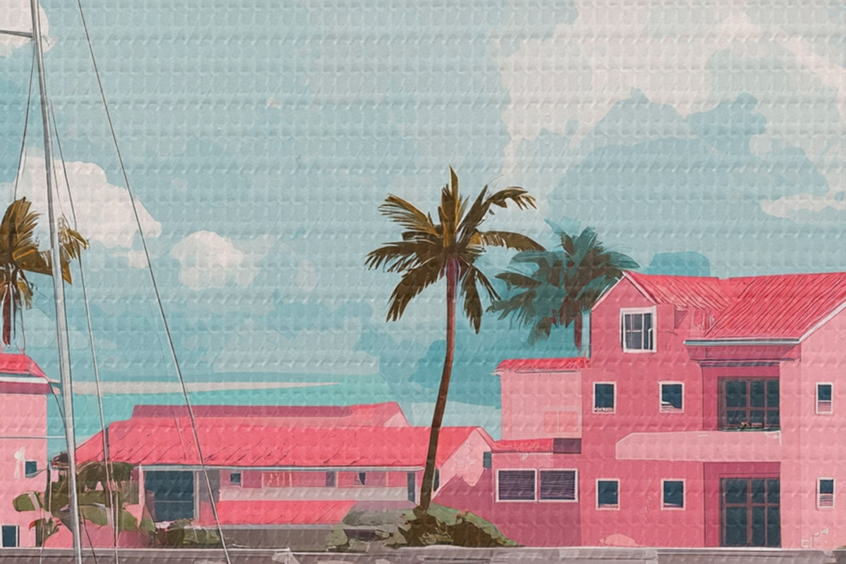 Foto Playa rosa con sol radiante, velero y casas Nr r44986