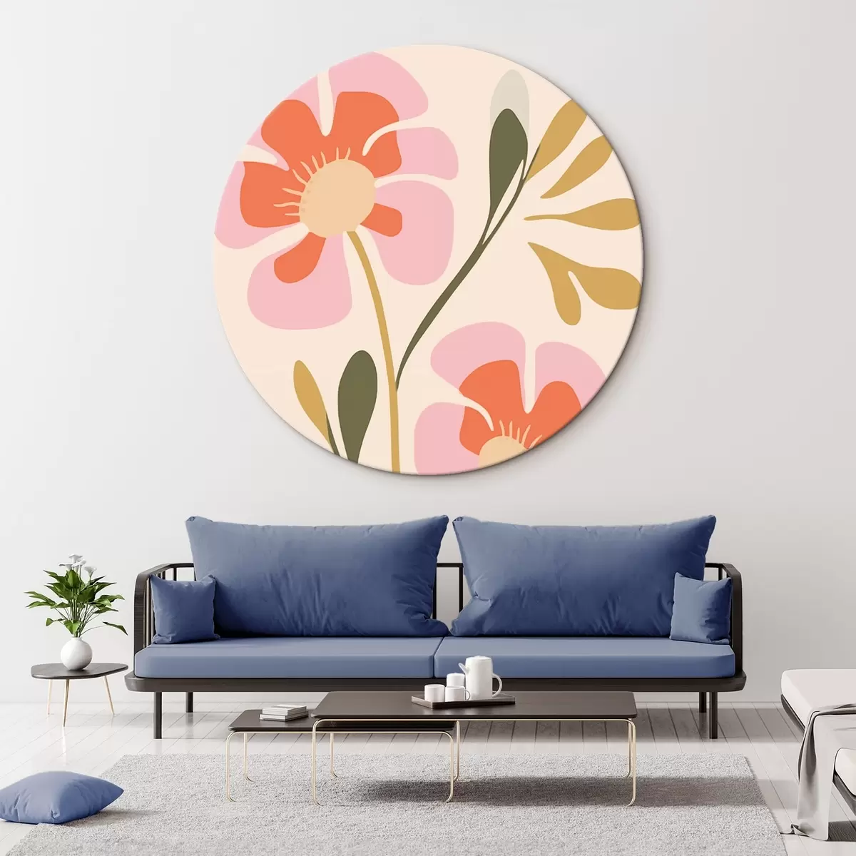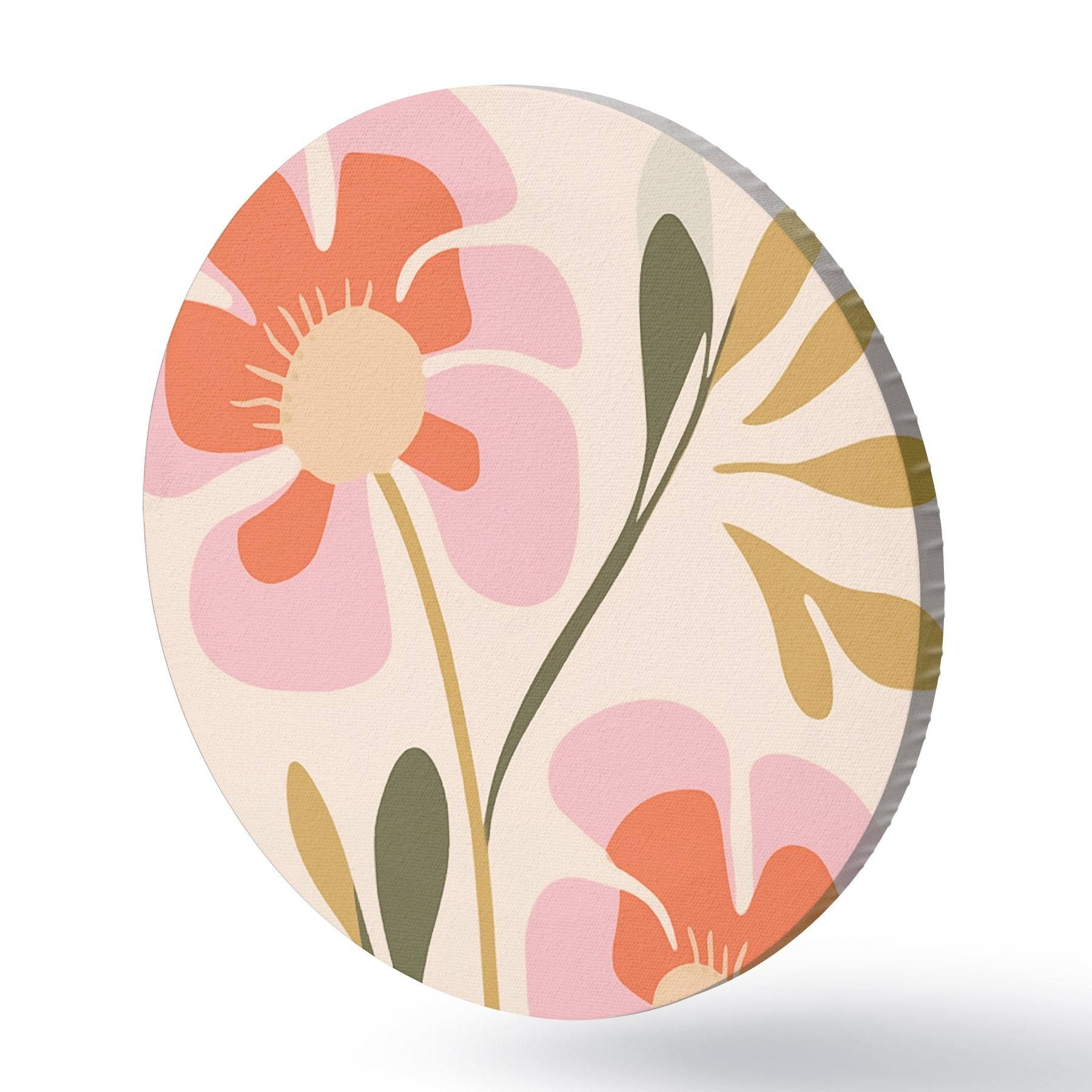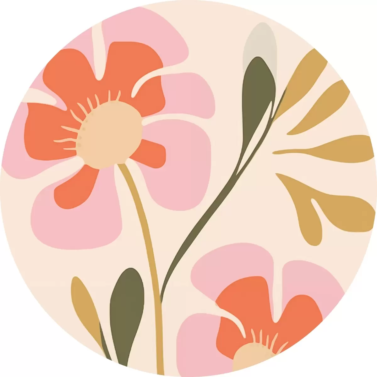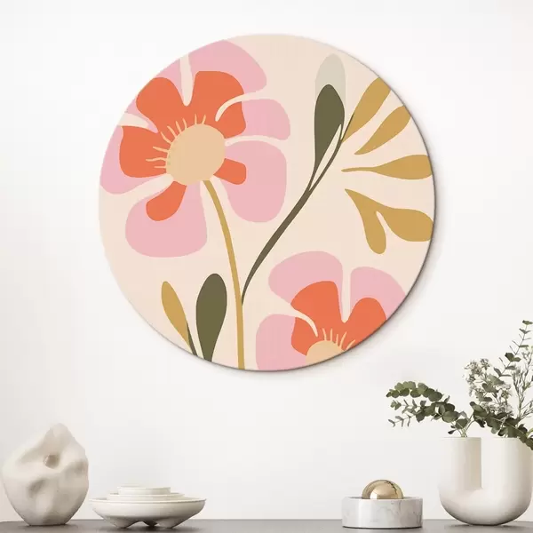 Cuadros redondos Flores estilizadas rosas y naranjas con hojas verdes r45140