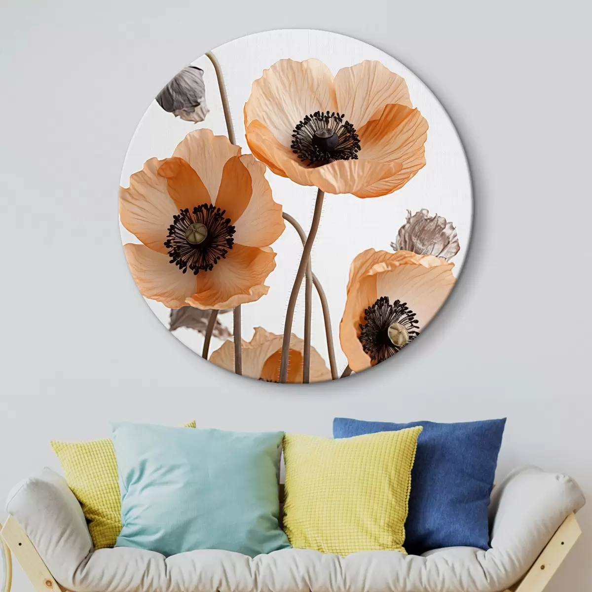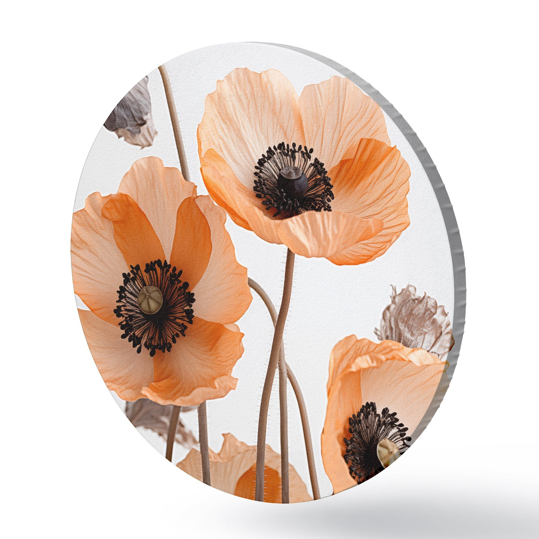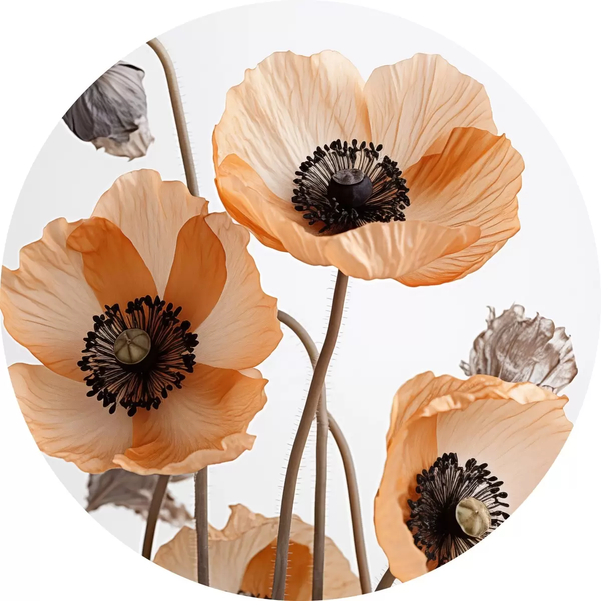 Cuadros redondos Amapolas naranjas, flores secas sobre fondo claro, iluminación suave, pétalos delicados, arreglo floral r45167