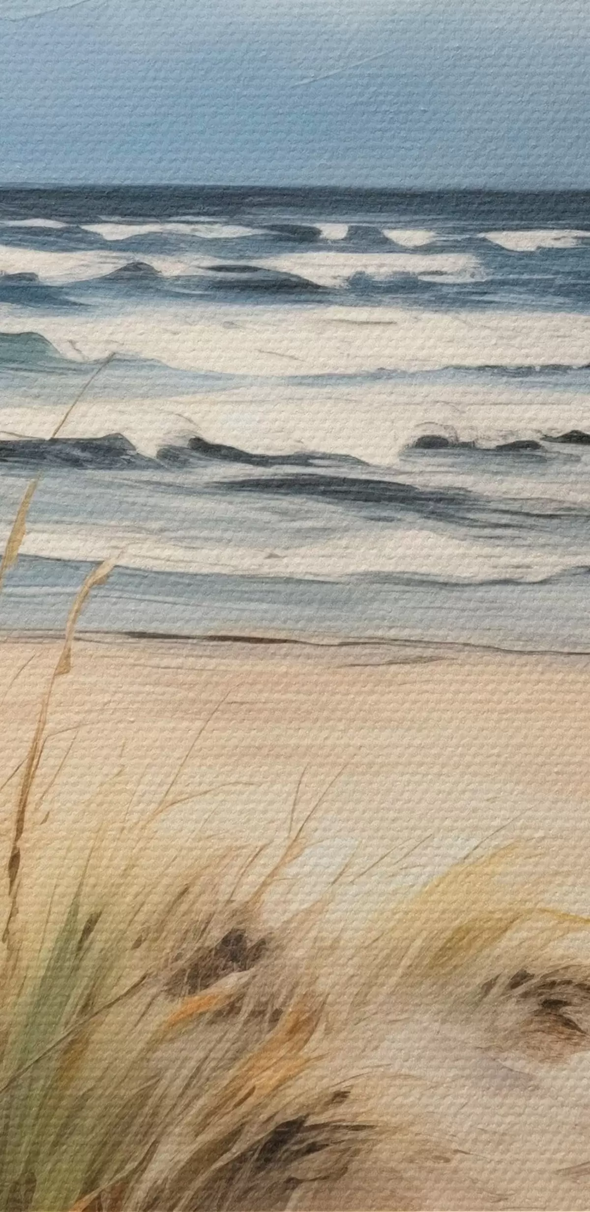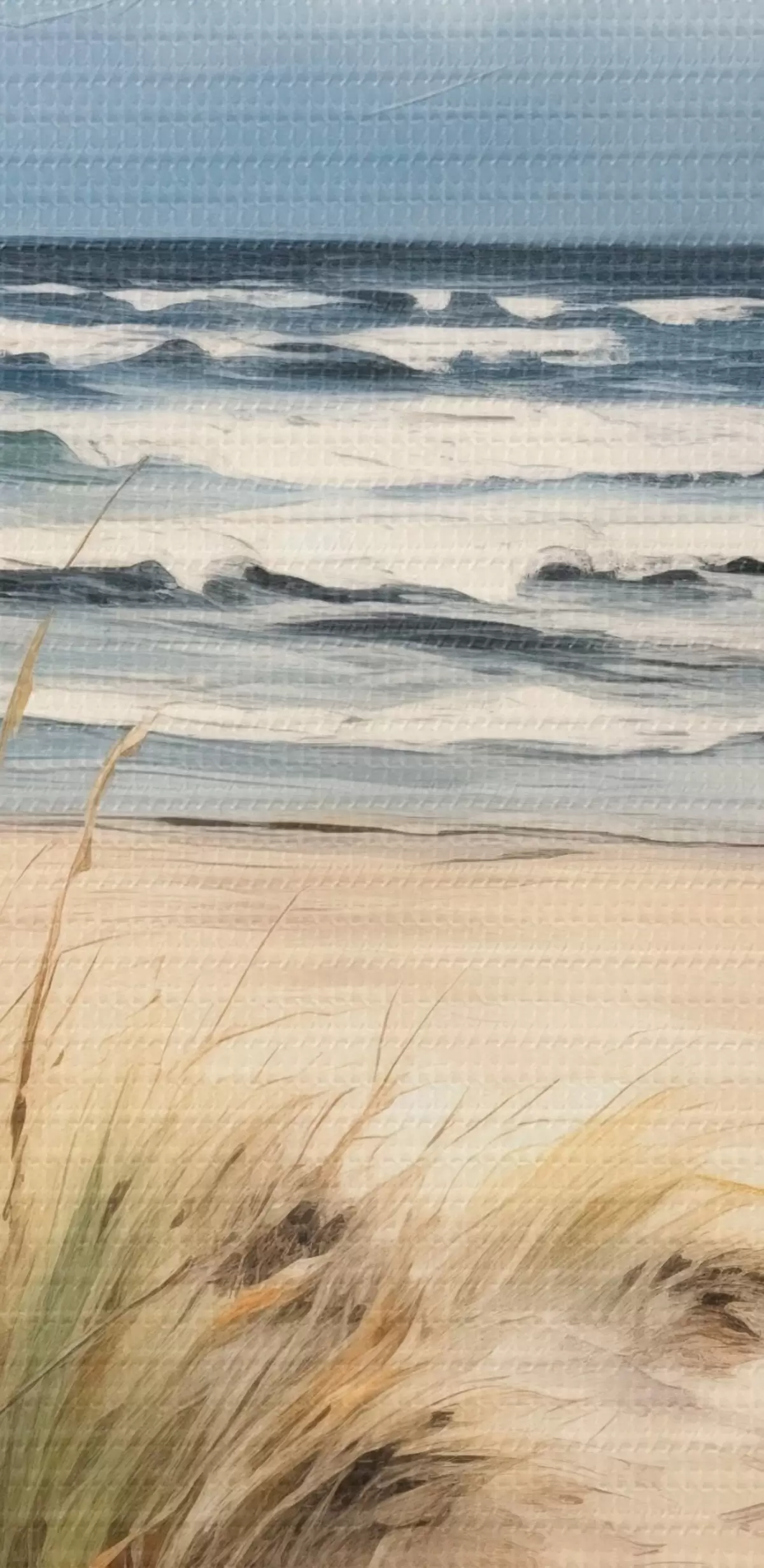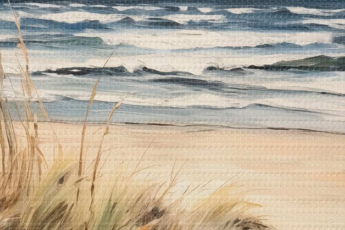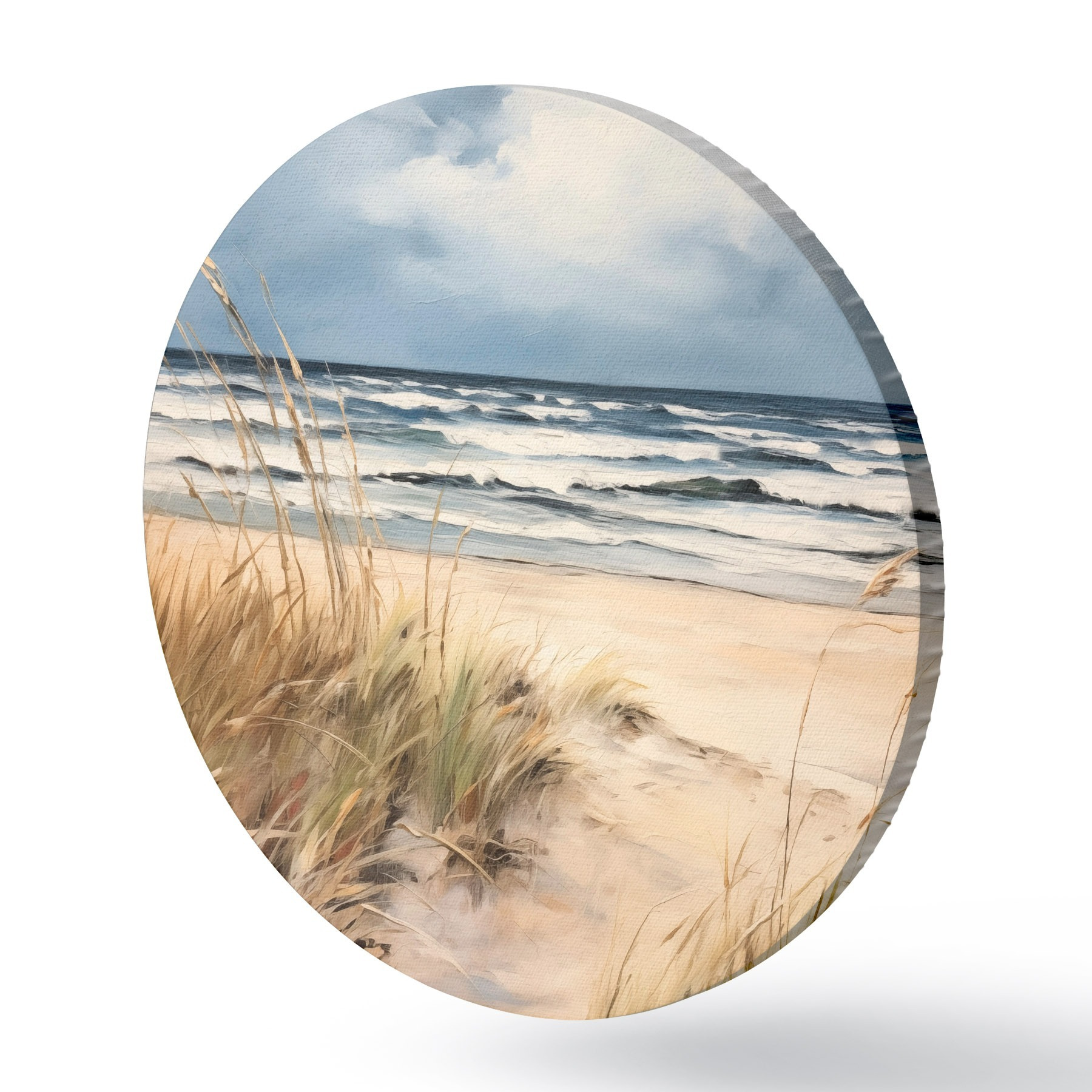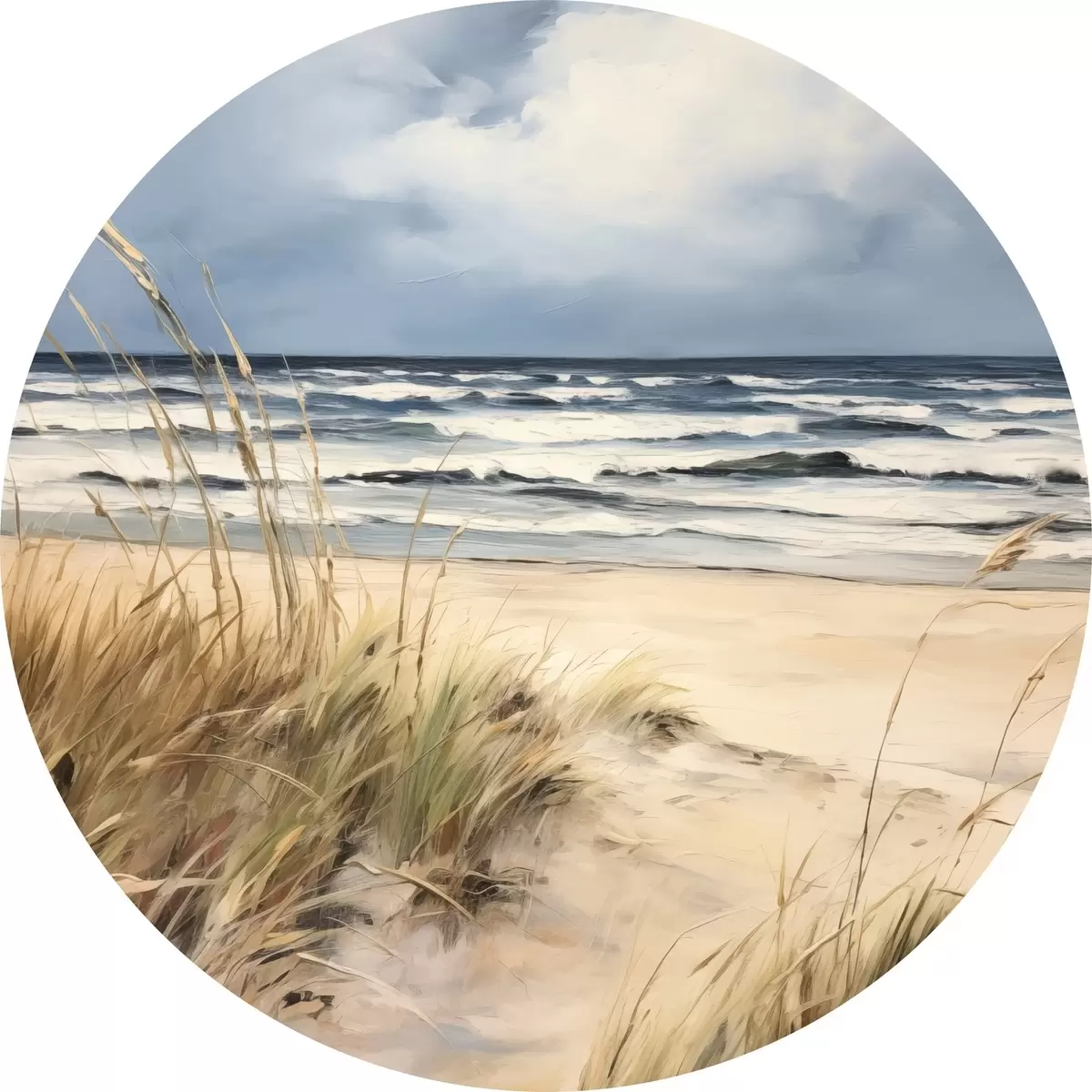 Cuadros redondos Una playa de arena con hierba alta en primer plano, el océano con olas y un cielo nublado al fondo r45173