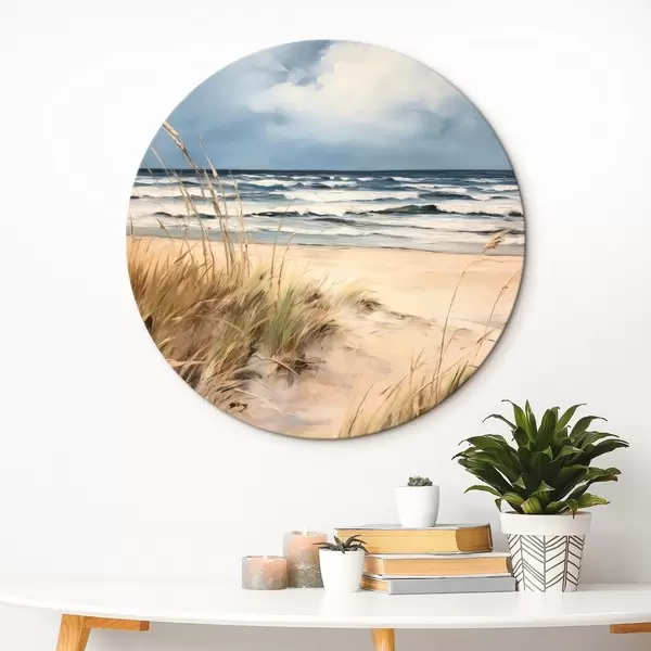 Cuadros redondos Una playa de arena con hierba alta en primer plano, el océano con olas y un cielo nublado al fondo r45173