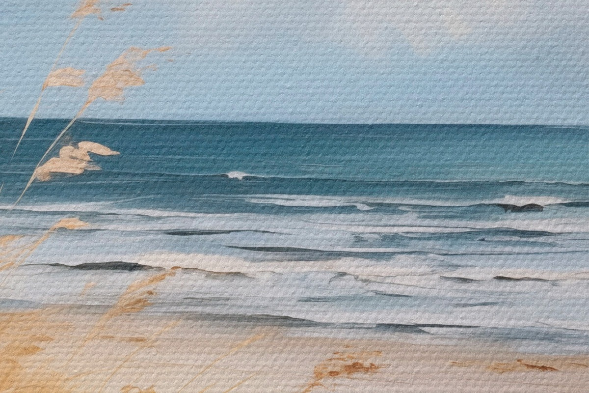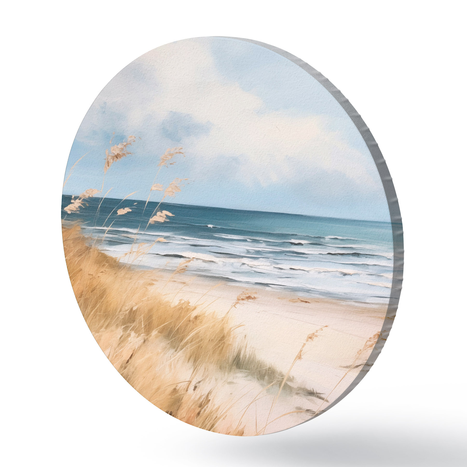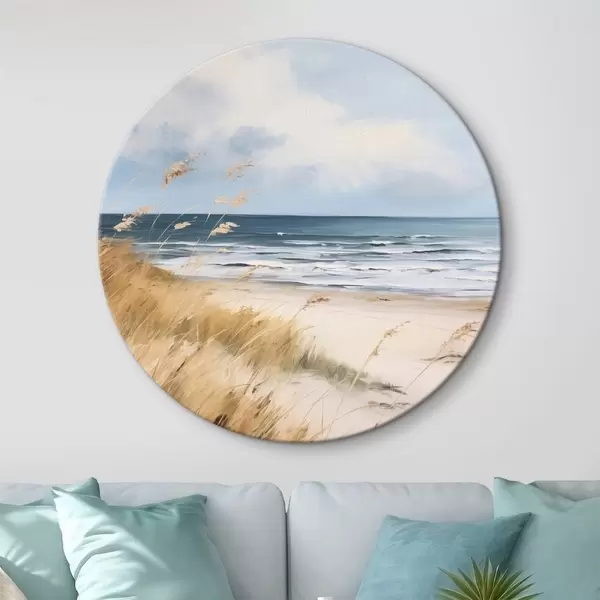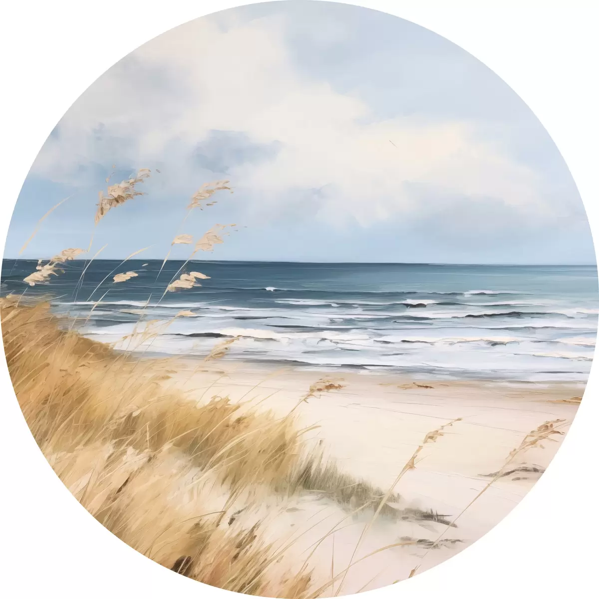 Cuadros redondos Una playa de arena con hierba alta en primer plano, el océano con olas y un cielo nublado al fondo r45174
