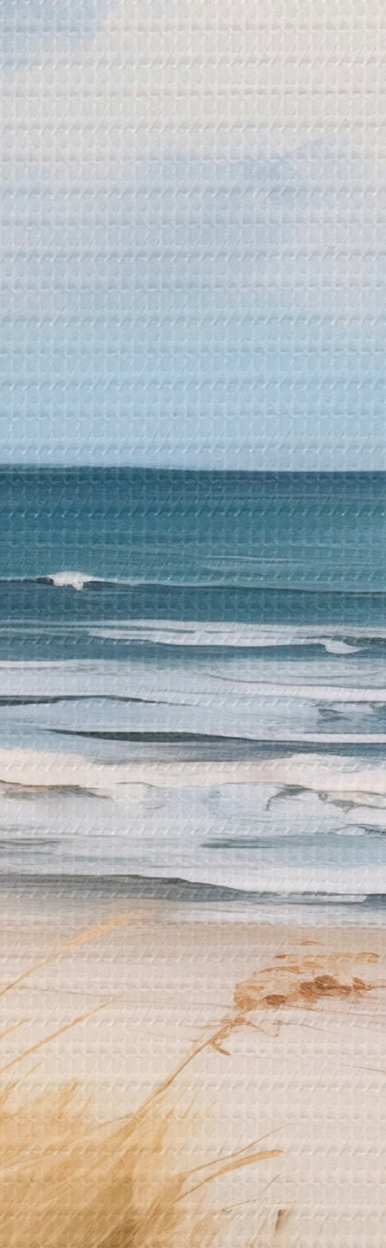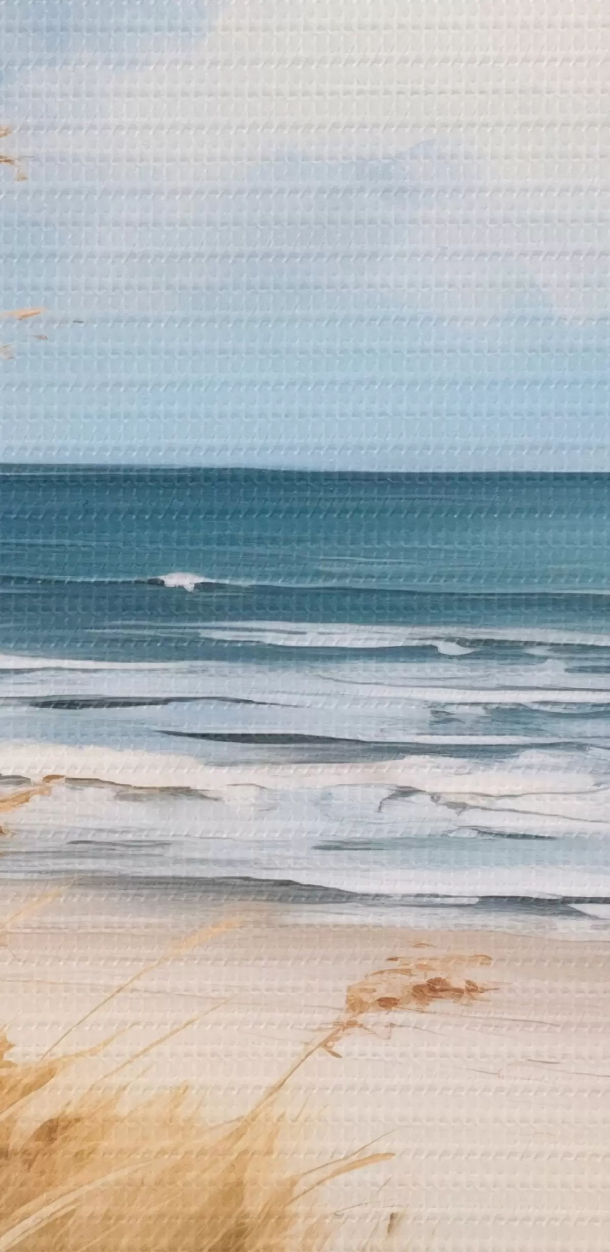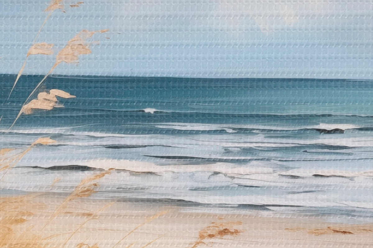 Cuadros redondos Una playa de arena con hierba alta en primer plano, el océano con olas y un cielo nublado al fondo r45174