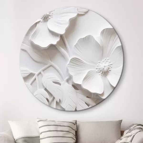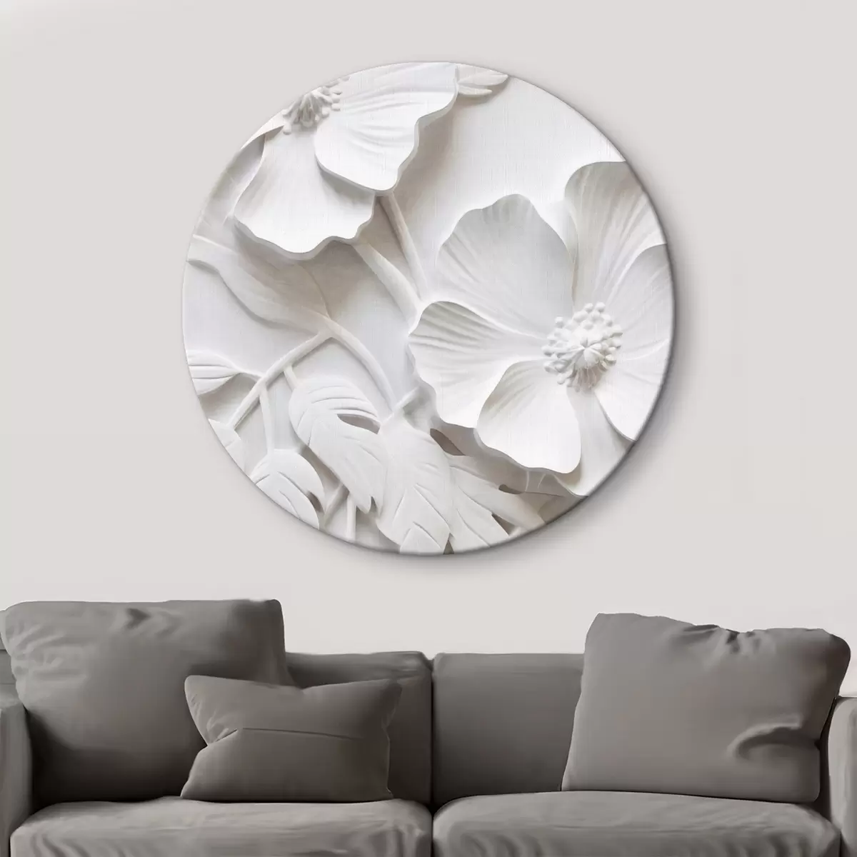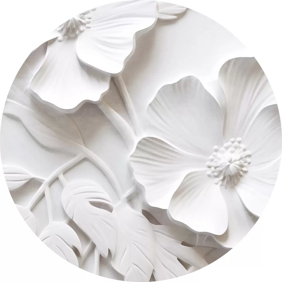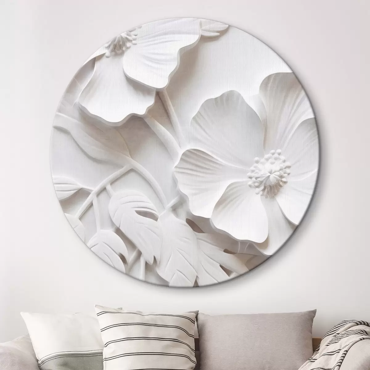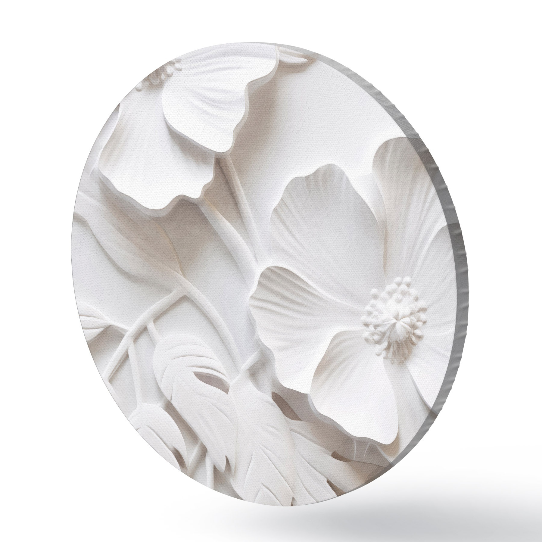 Cuadros redondos Flores blancas minimalistas decorativas con hojas, imitación relieve, fondo blanco r45179
