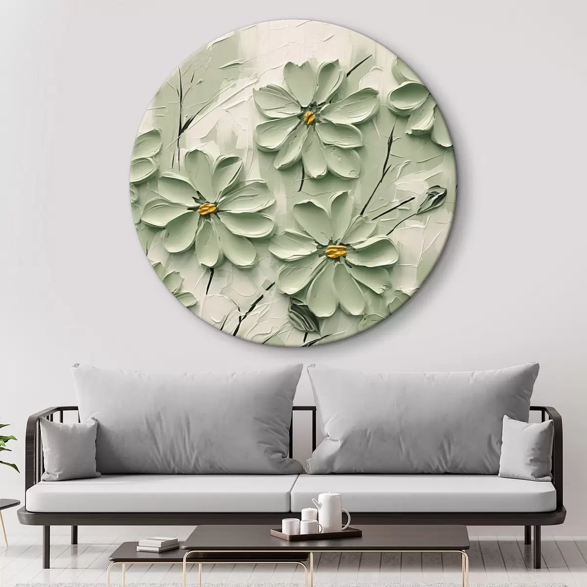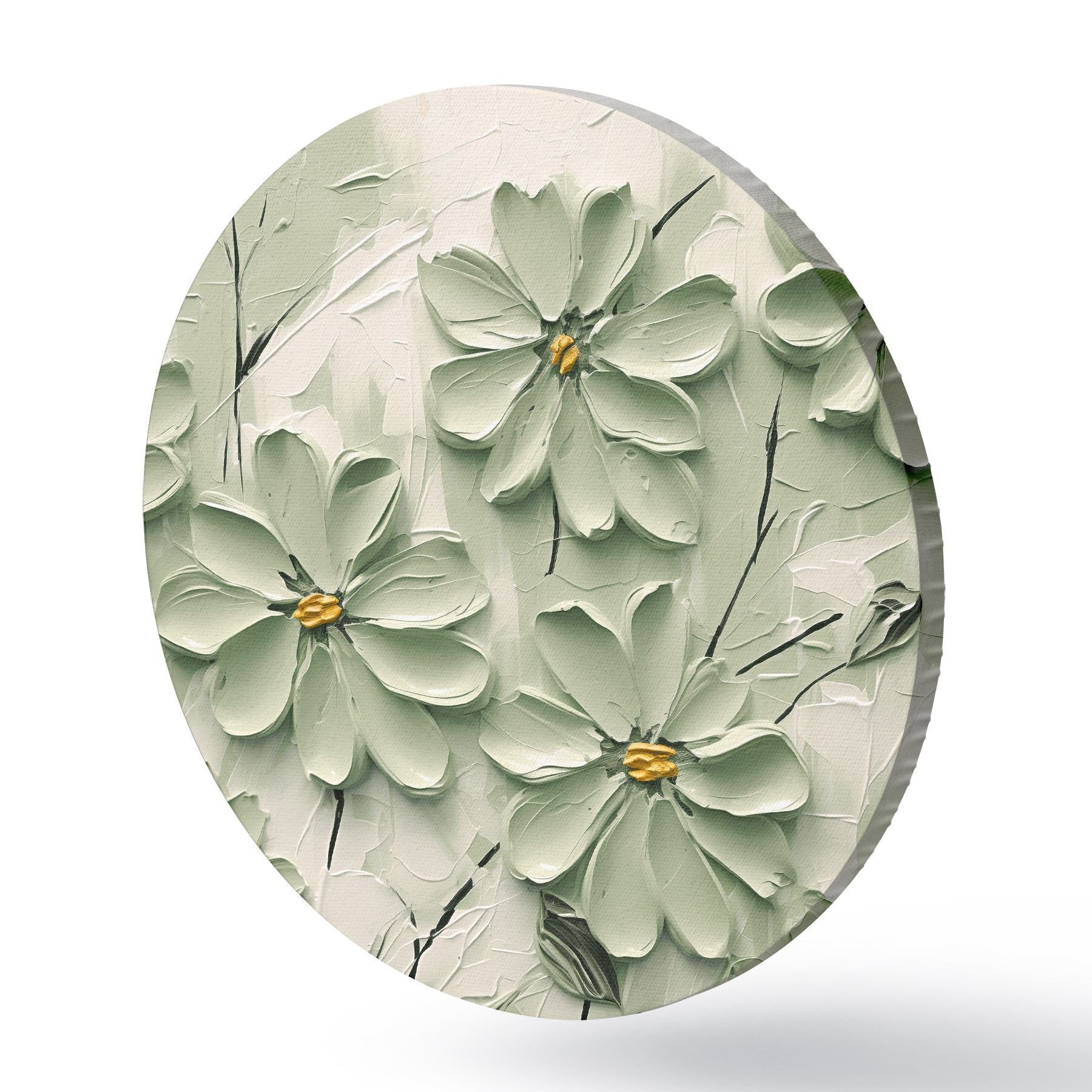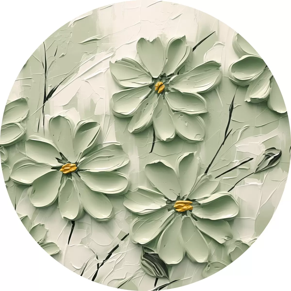 Cuadros redondos Flores verdes con centros amarillos pintadas con pinceladas gruesas sobre fondo claro r45265