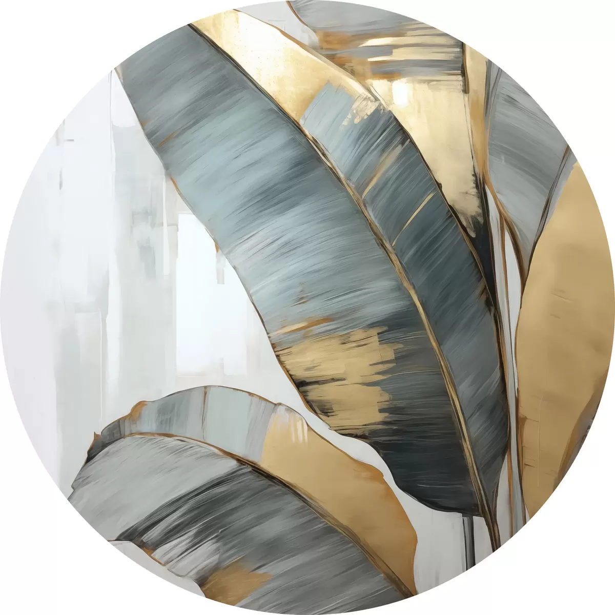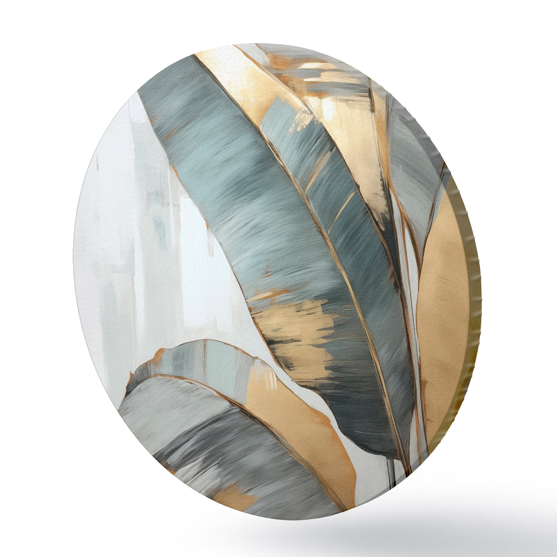 Cuadros redondos Conjunto de hojas de plátano azules, grises y amarillas con pinceladas visibles, sobre un fondo blanco abstracto r45551