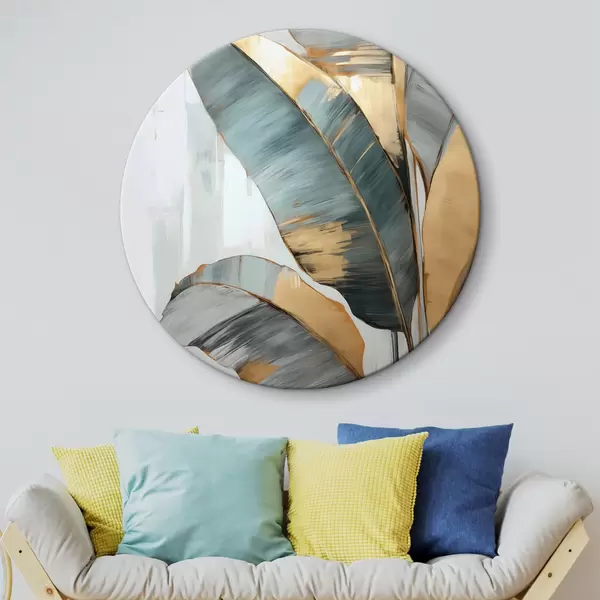Cuadros redondos Conjunto de hojas de plátano azules, grises y amarillas con pinceladas visibles, sobre un fondo blanco abstracto r45551