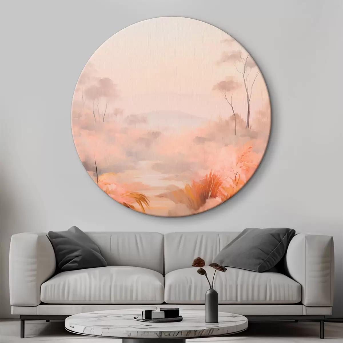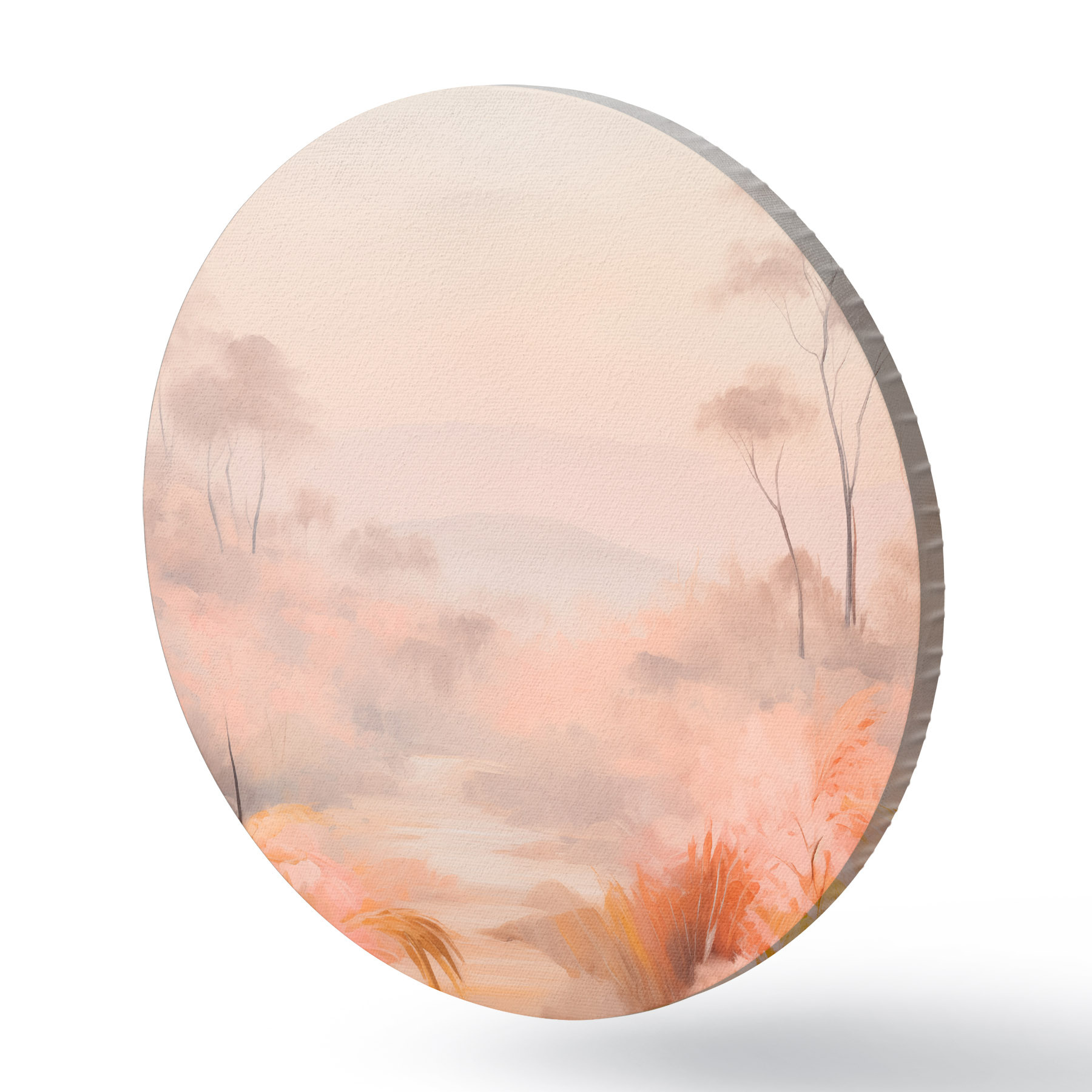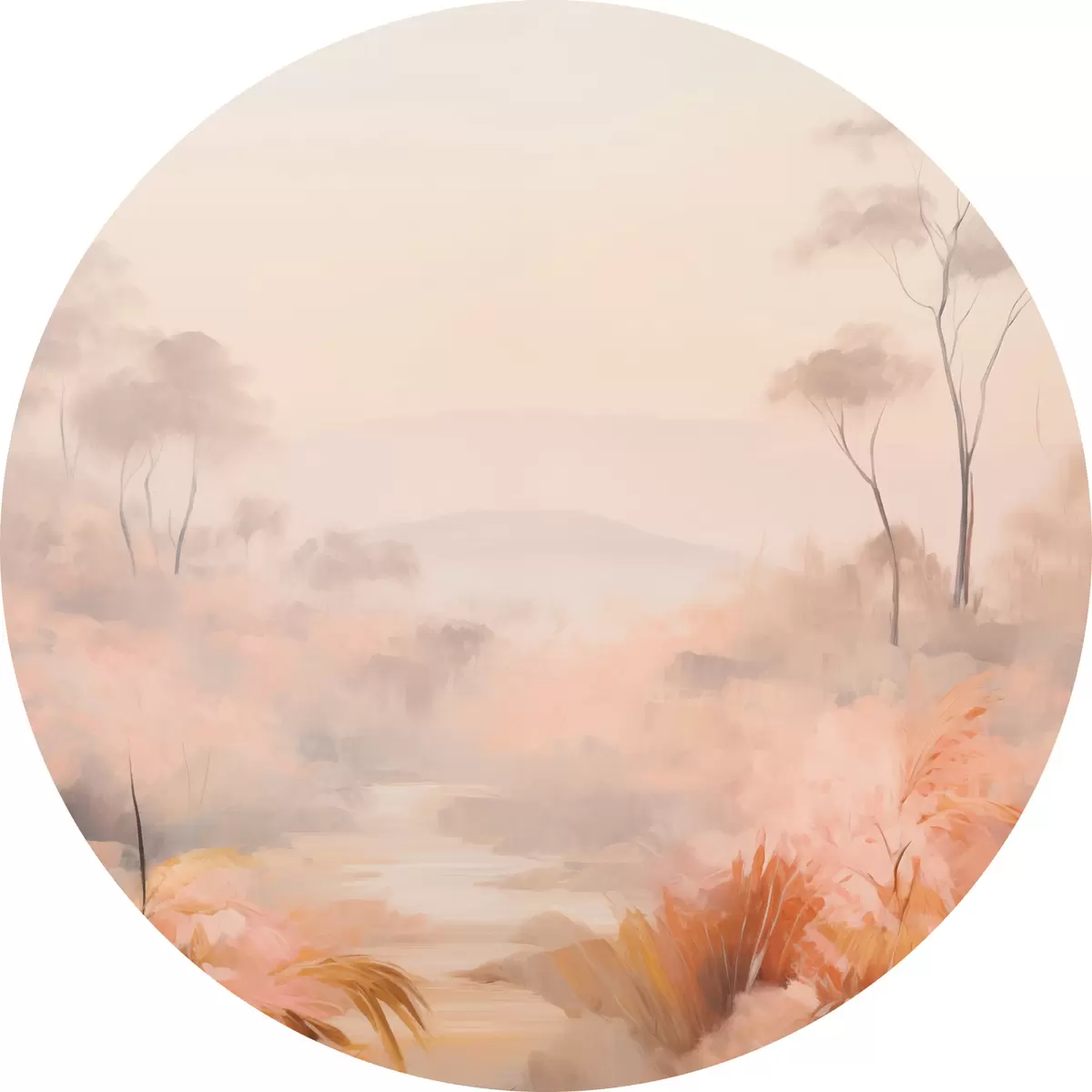 Cuadros redondos Un paisaje con arbustos y árboles en tonos rosas, naranjas y marrones, con montañas al fondo r45553