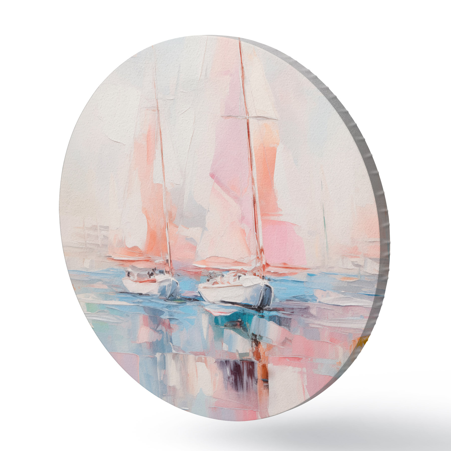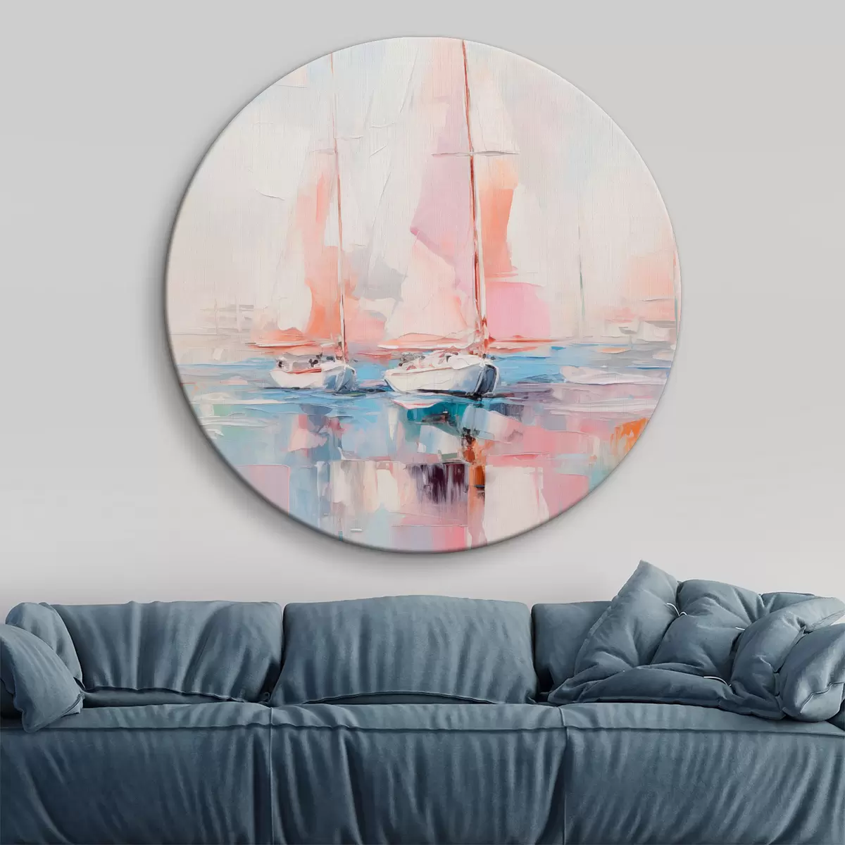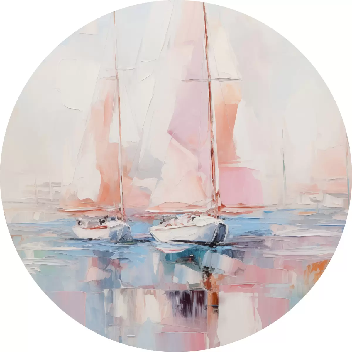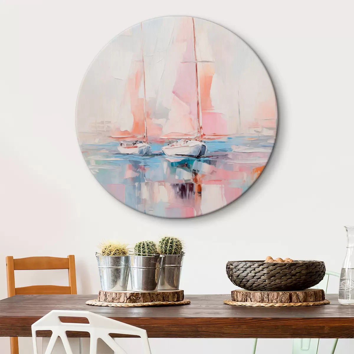 Cuadros redondos Veleros con velas rosas flotando en un mar en calma, reflejos de los barcos en el agua, suaves colores pastel r45557