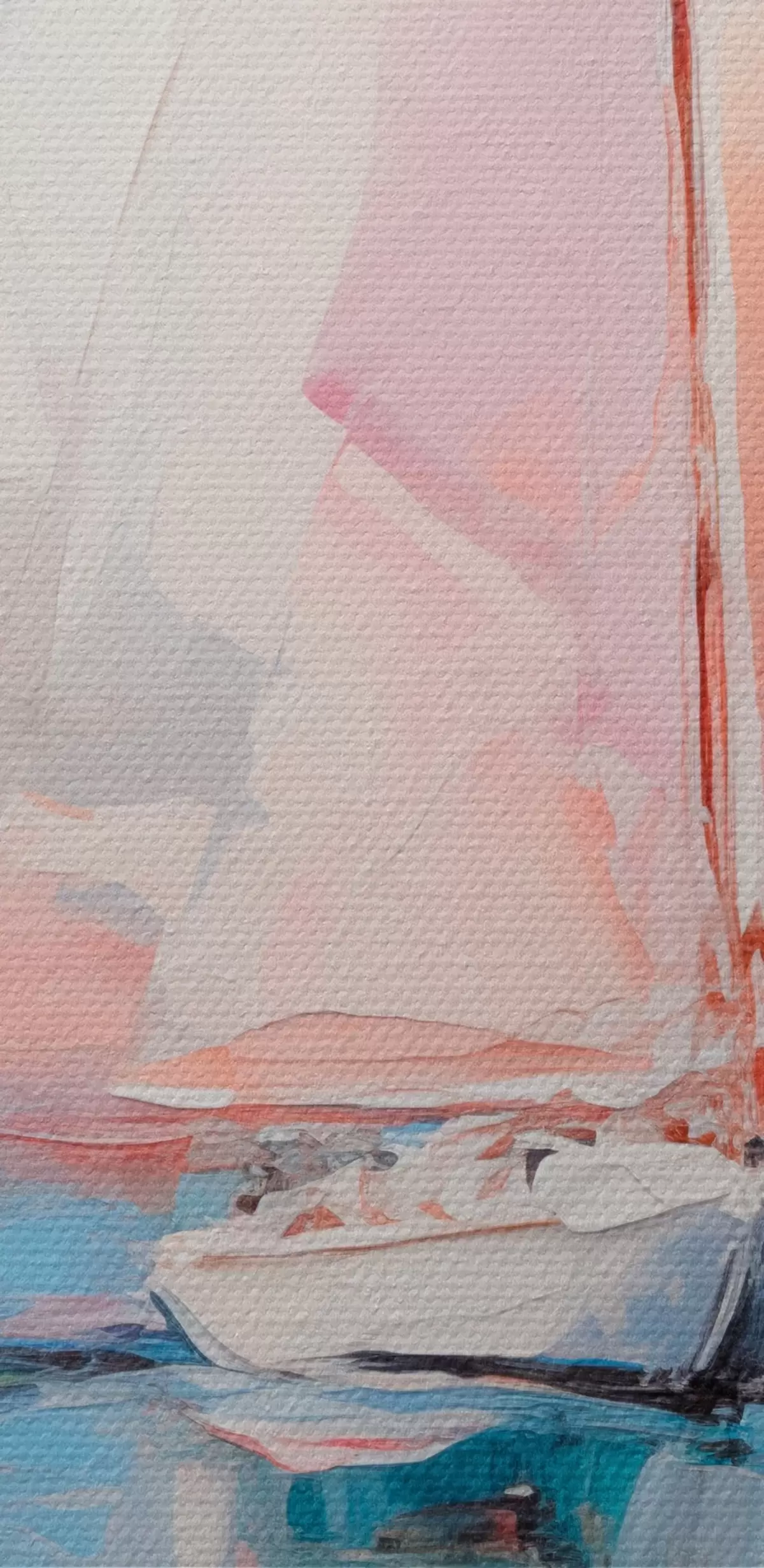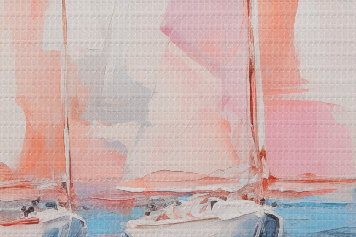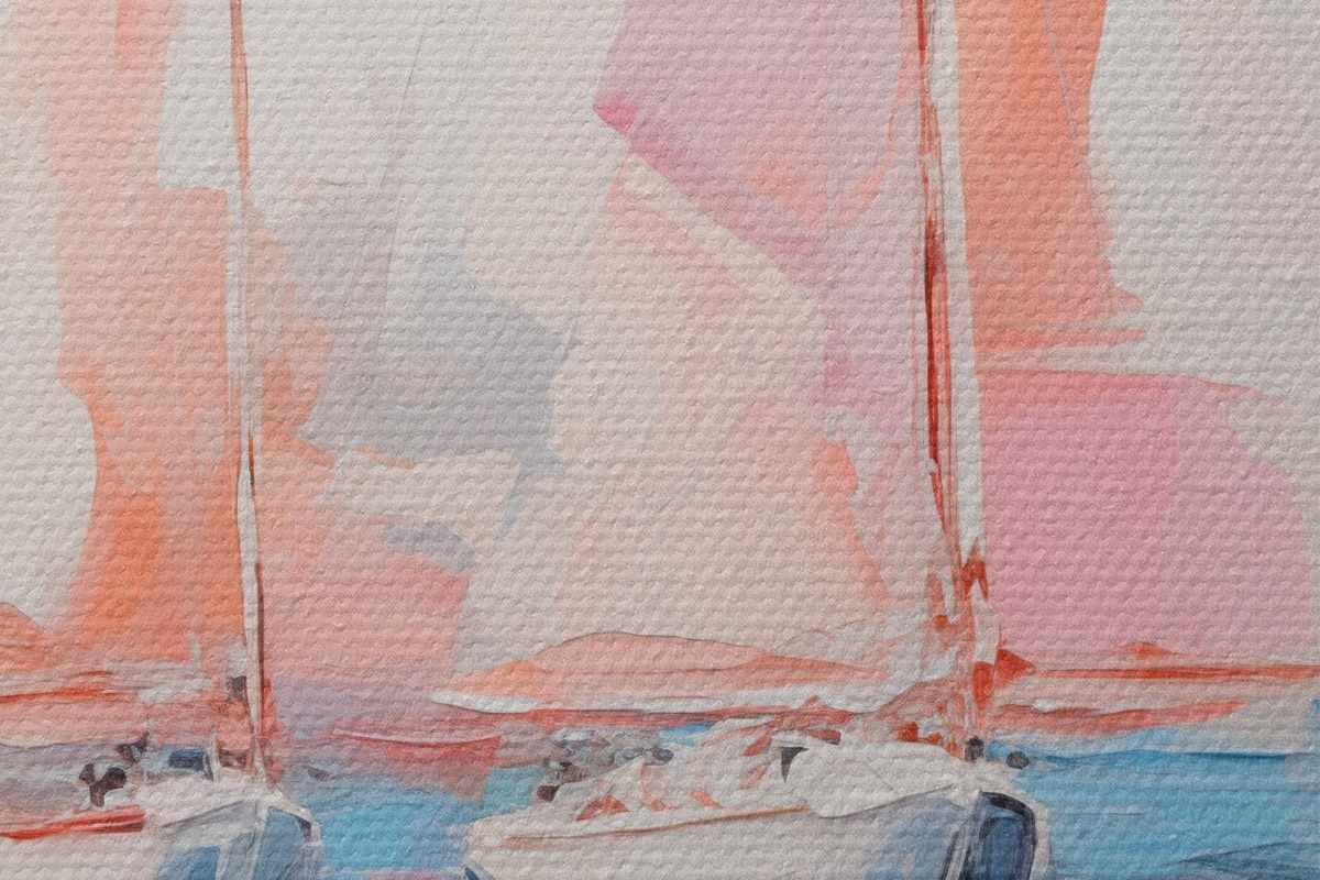 Foto Veleros con velas rosas flotando en un mar en calma, reflejos de los barcos en el agua, suaves colores pastel Nr r45557