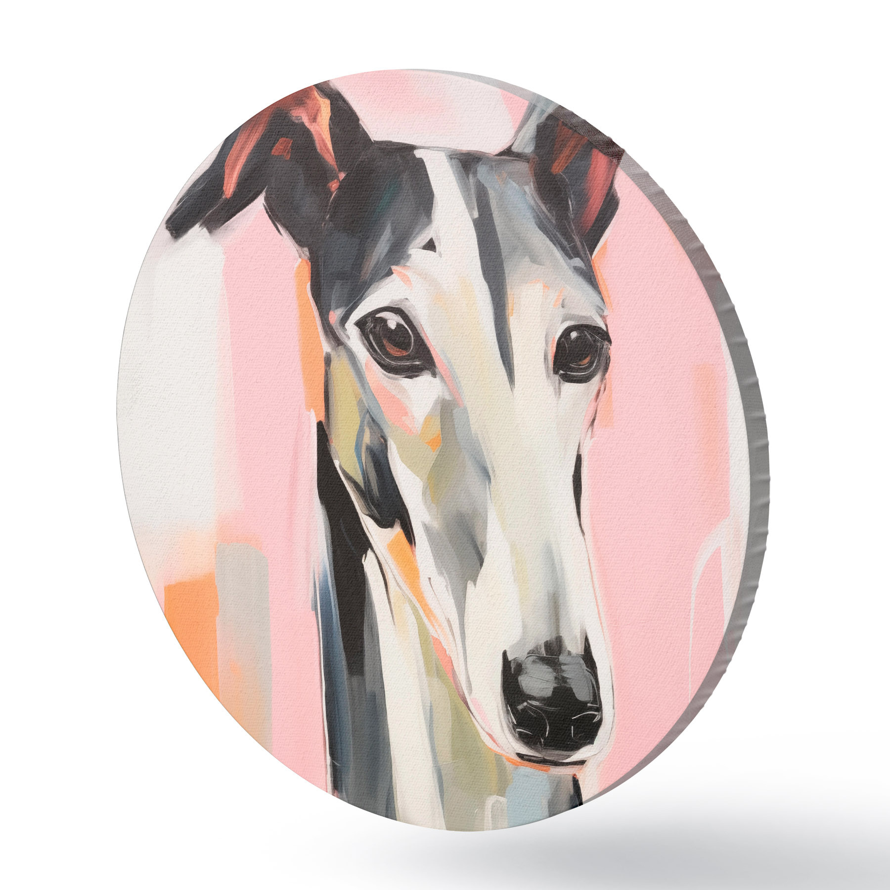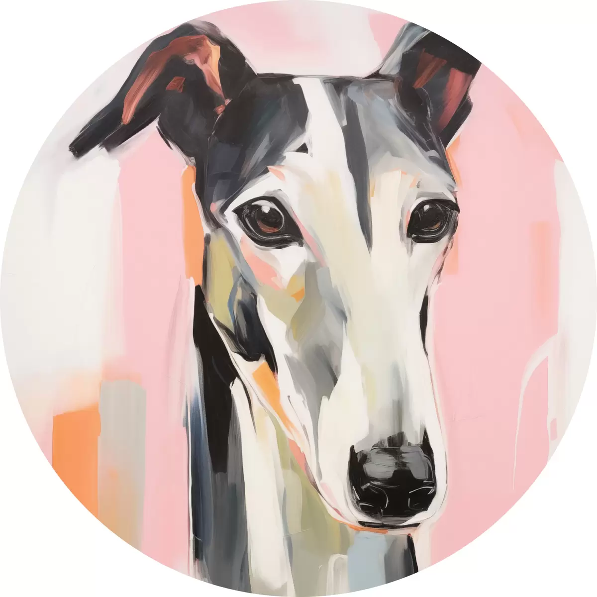 Cuadros redondos Un galgo sobre un fondo de pinceladas rosas, naranjas y blancas r45566
