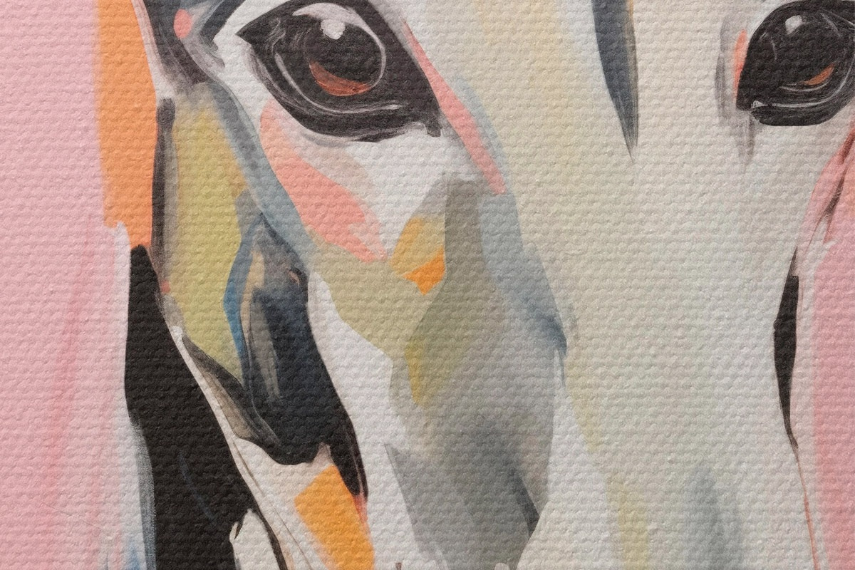 Foto Un galgo sobre un fondo de pinceladas rosas, naranjas y blancas Nr r45566
