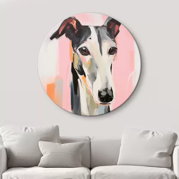Cuadros redondos Un galgo sobre un fondo de pinceladas rosas, naranjas y blancas r45566