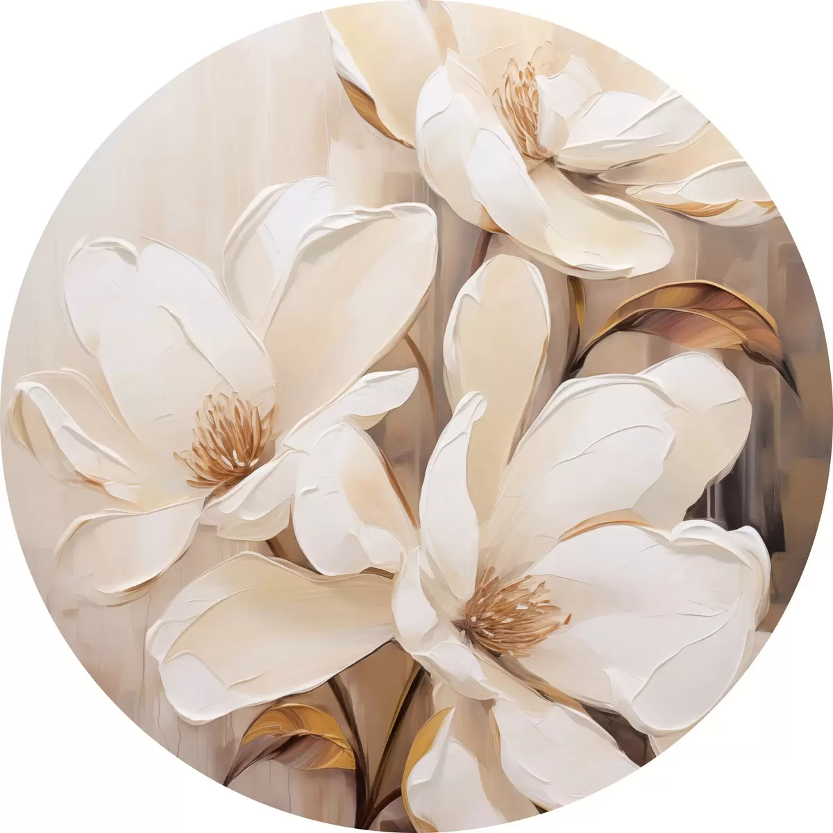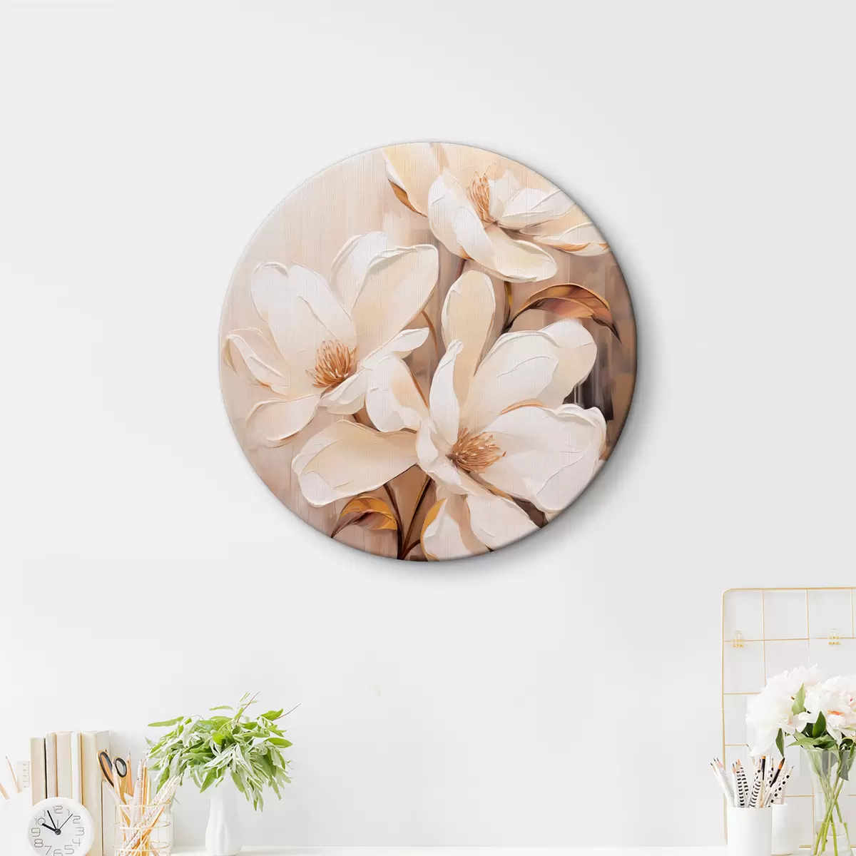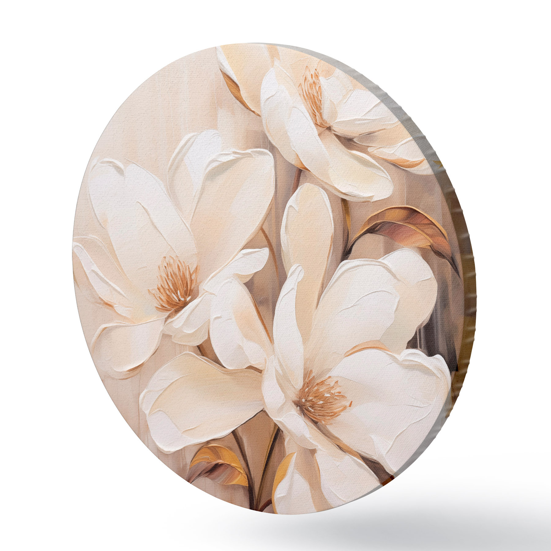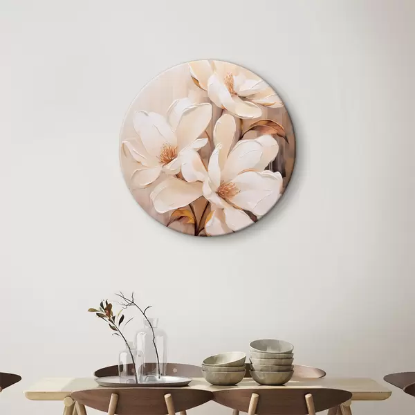Cuadros redondos Flores blancas de magnolia sobre un fondo suave y difuminado de tonos beige y marrones, elegante composición floral r45571
