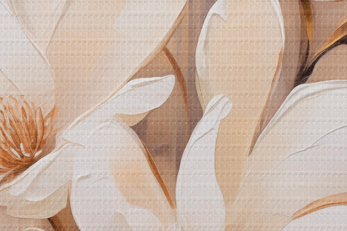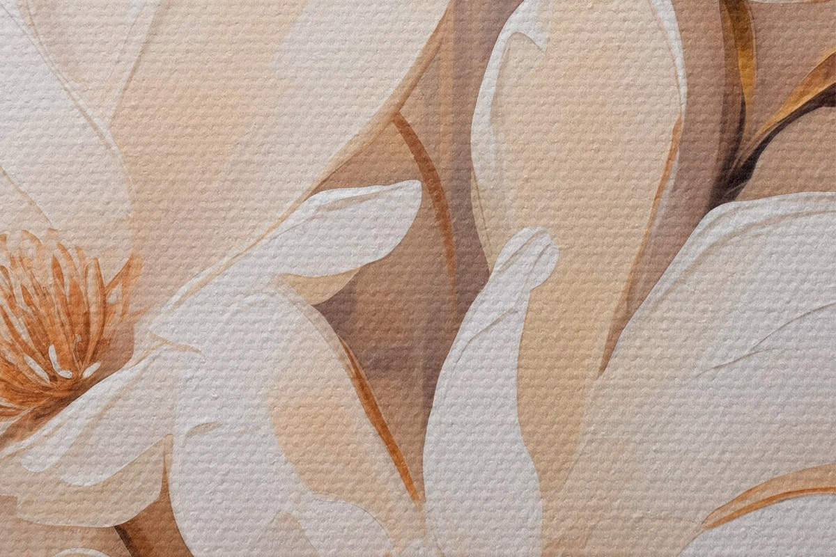 Foto Flores blancas de magnolia sobre un fondo suave y difuminado de tonos beige y marrones, elegante composición floral Nr r45571