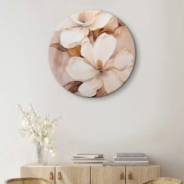 Cuadros redondos Flores blancas de magnolia sobre un fondo suave y difuminado de tonos beige y marrones, estilo pintura r45572