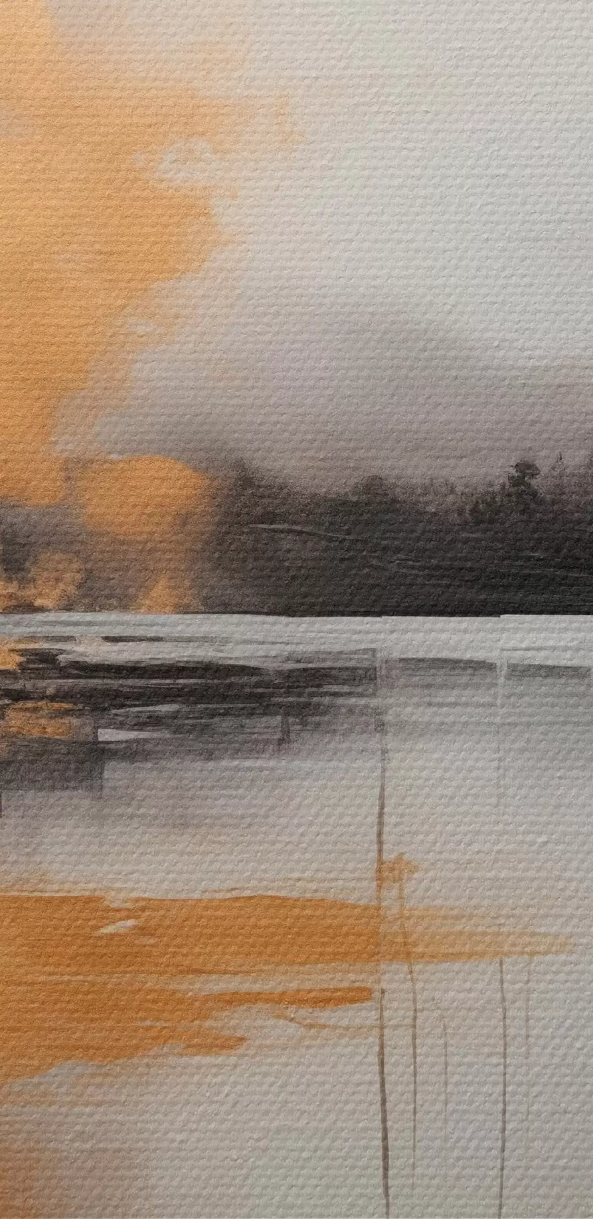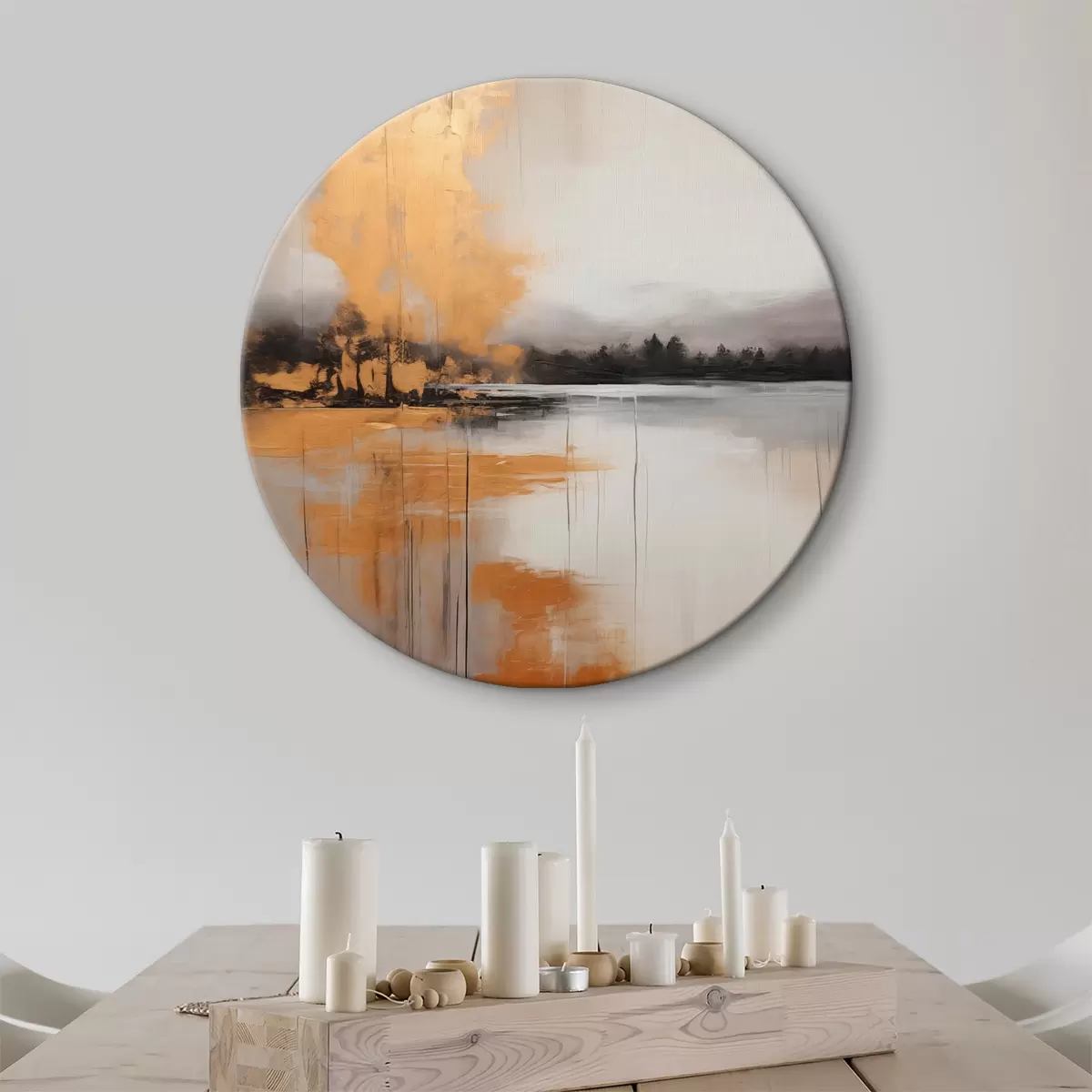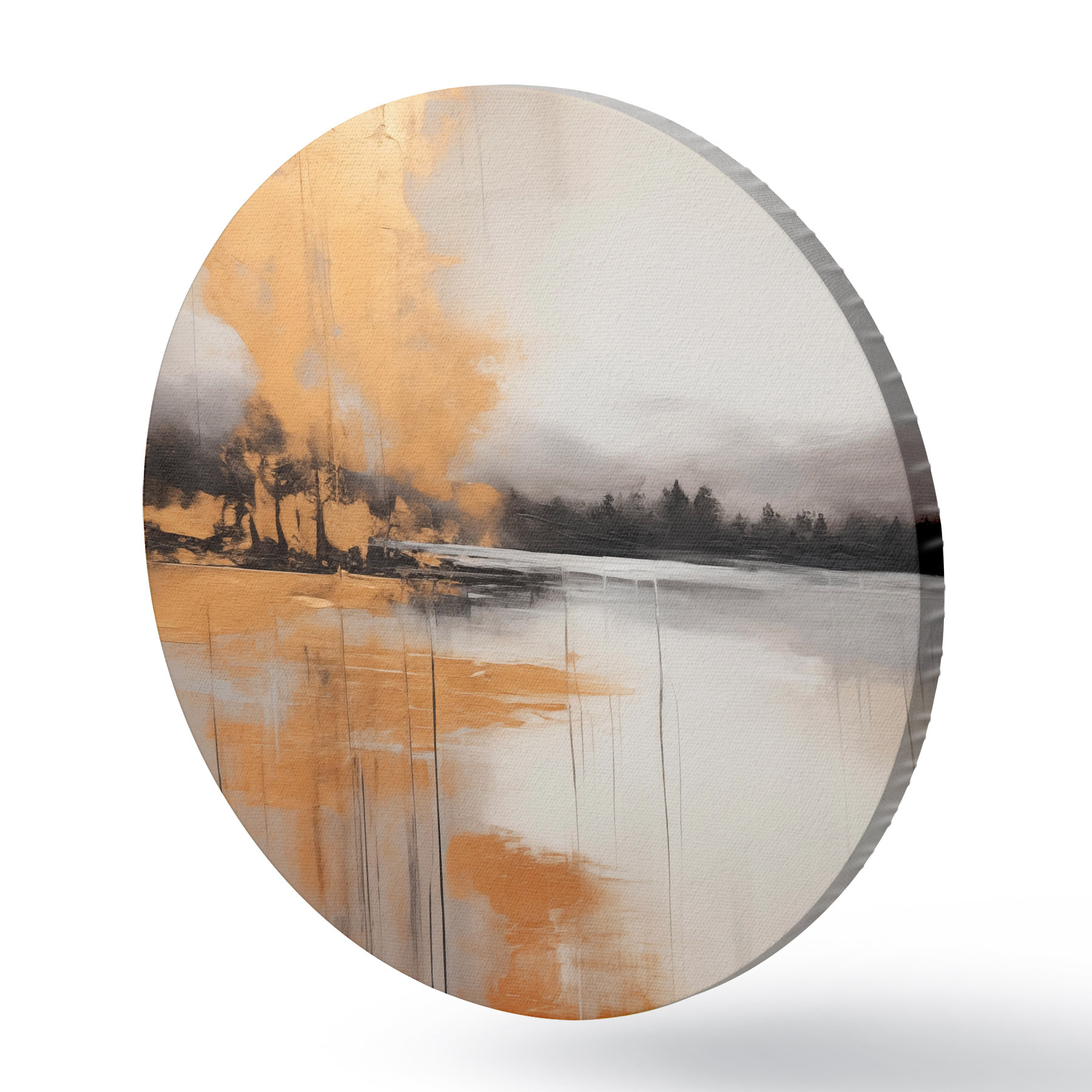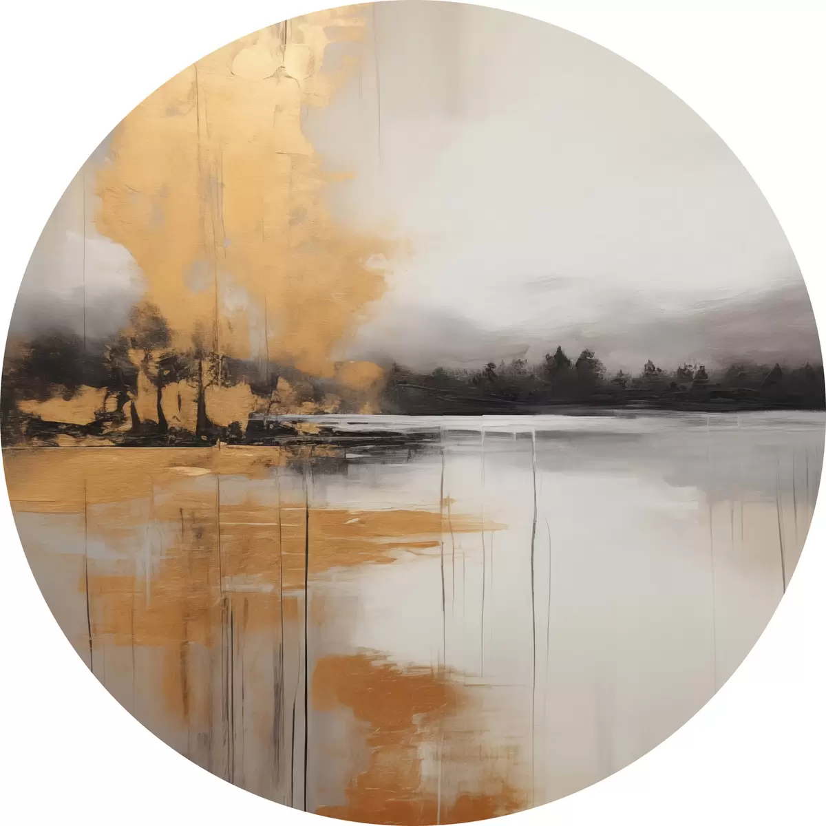 Cuadros redondos Un paisaje abstracto con un lago, un árbol y niebla amarilla , el agua se refleja y el cielo nublado r45575