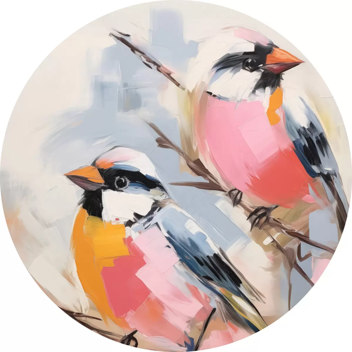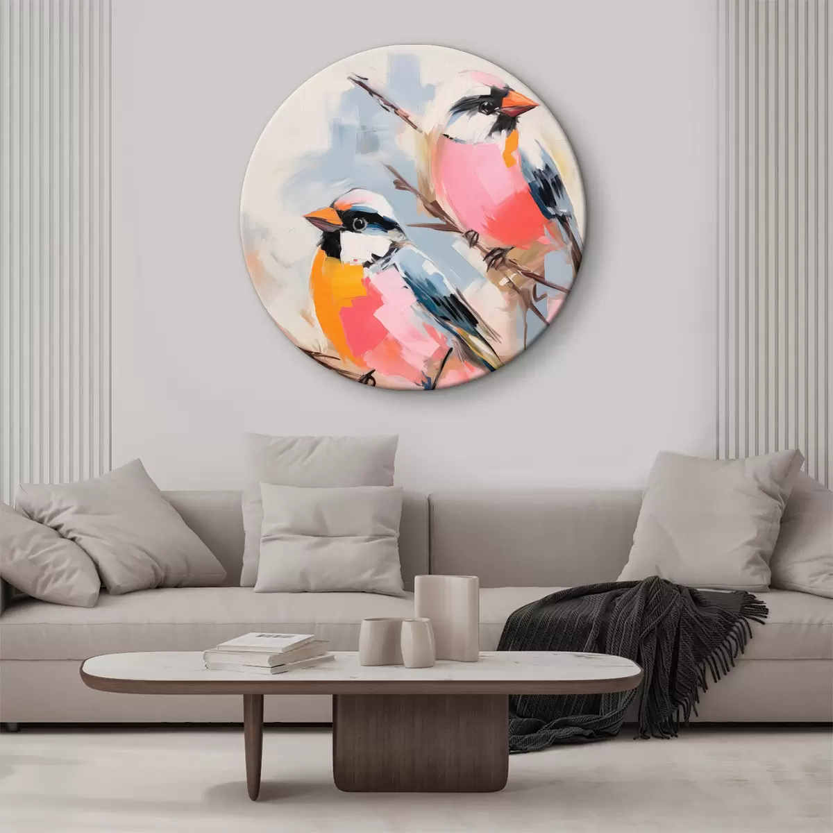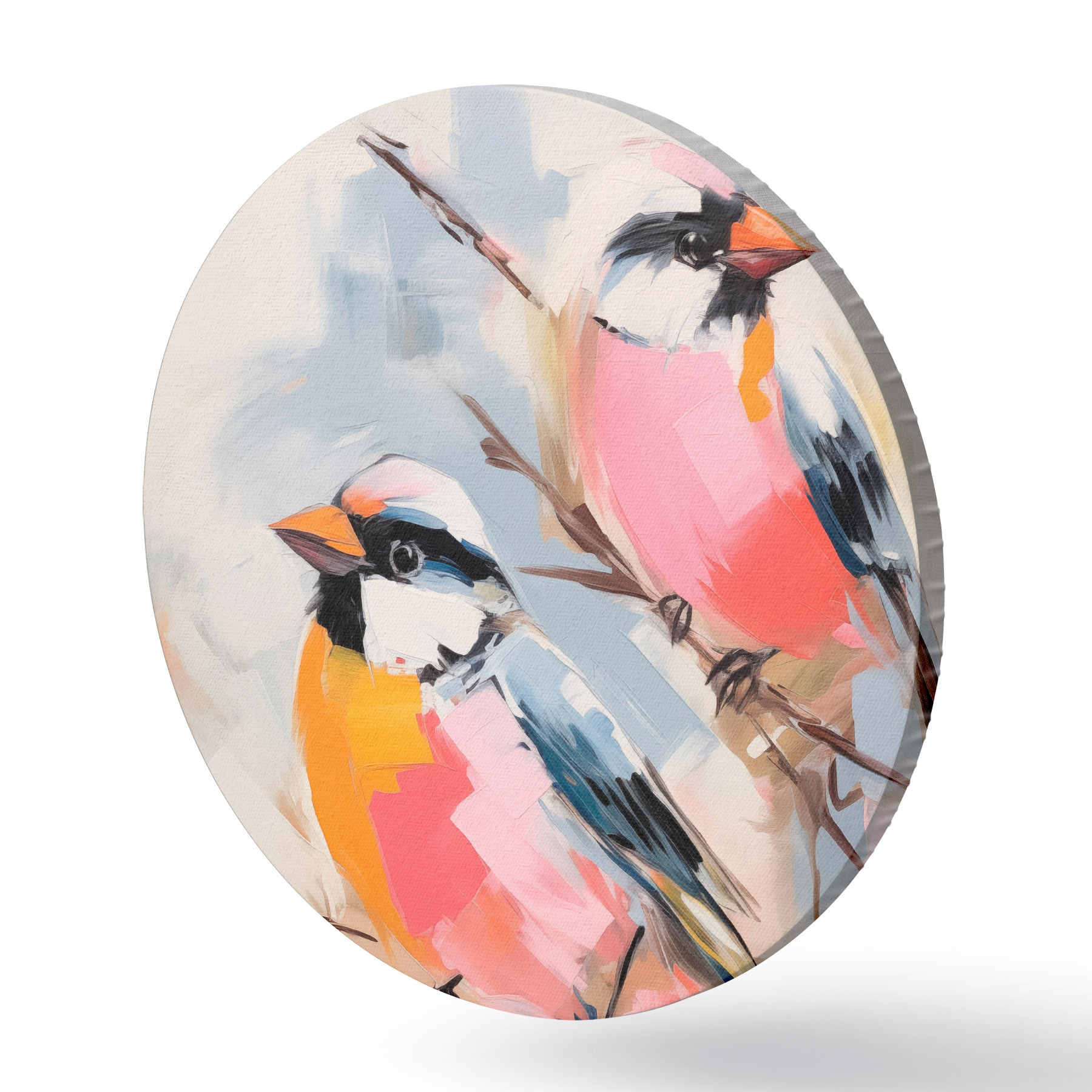 Cuadros redondos Pájaros de colores posados en una rama sobre un fondo de suaves colores pastel r45578