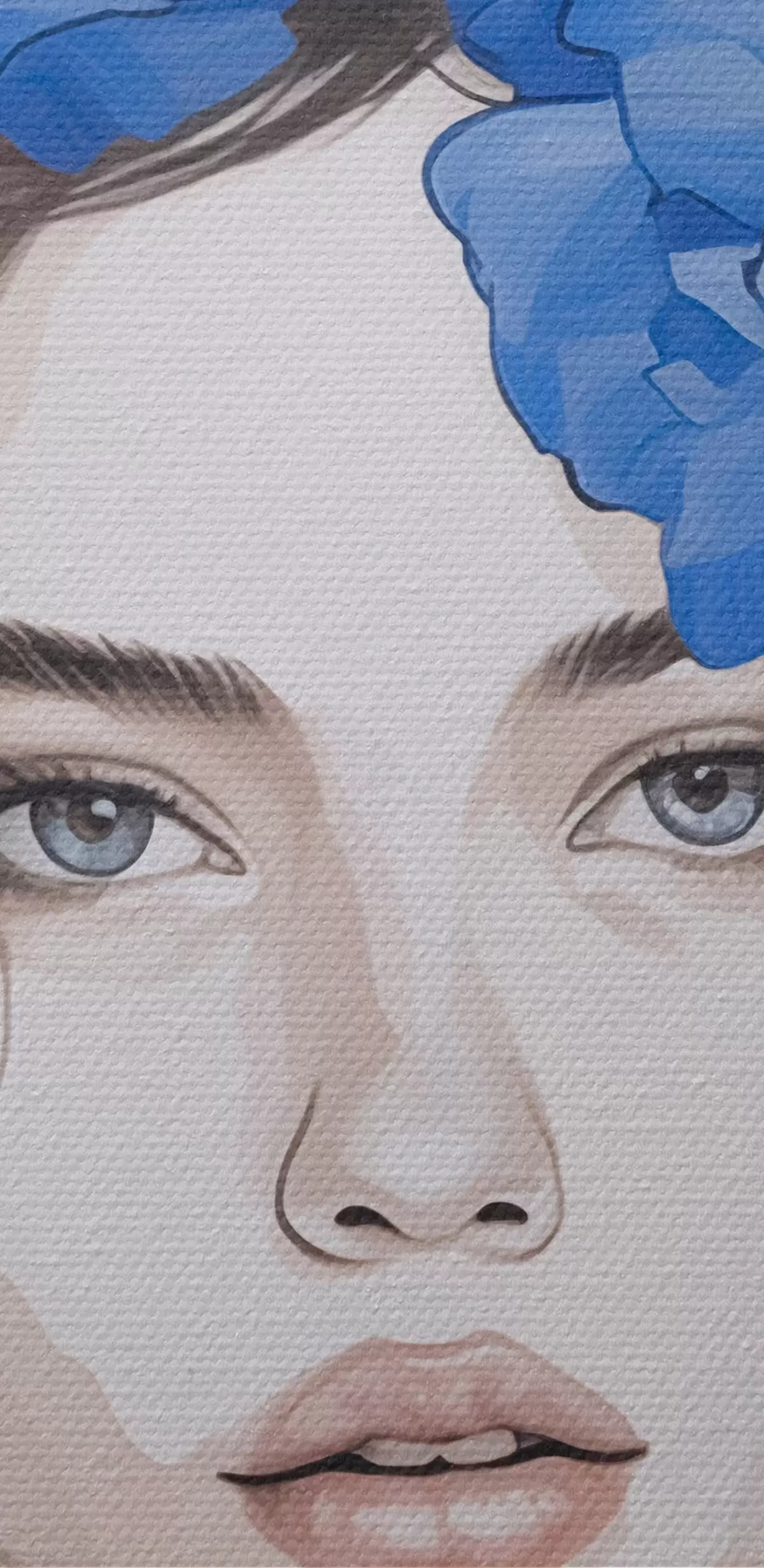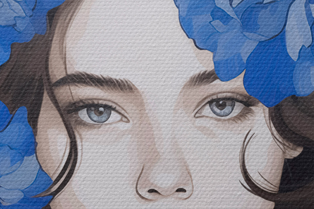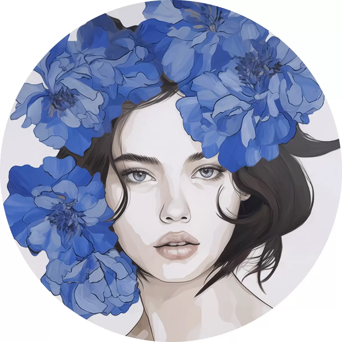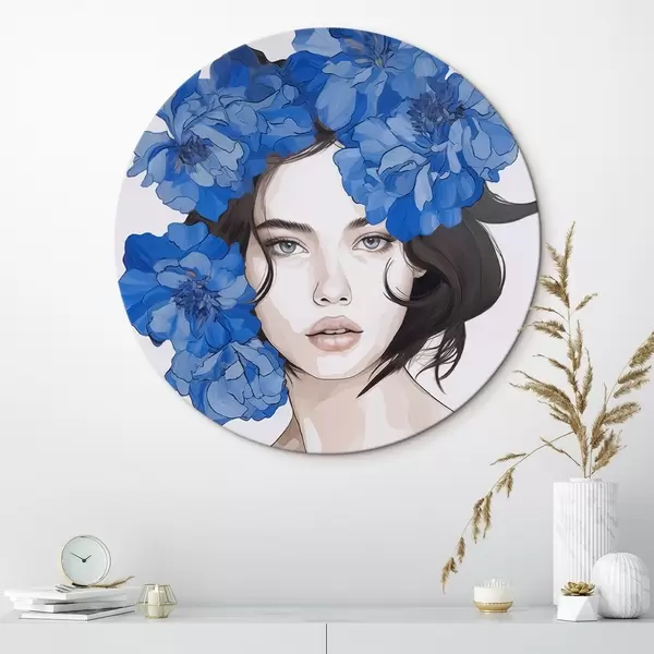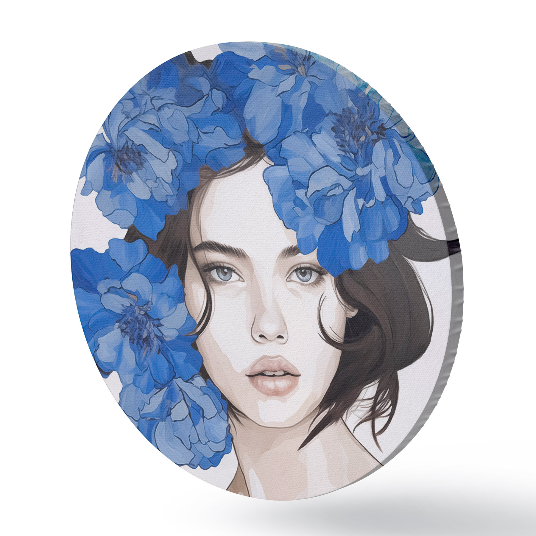 Cuadros redondos Retrato de una niña con flores azules r45756
