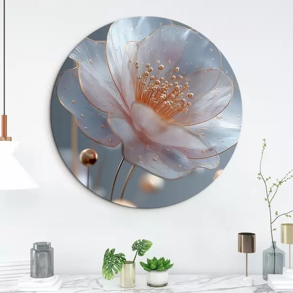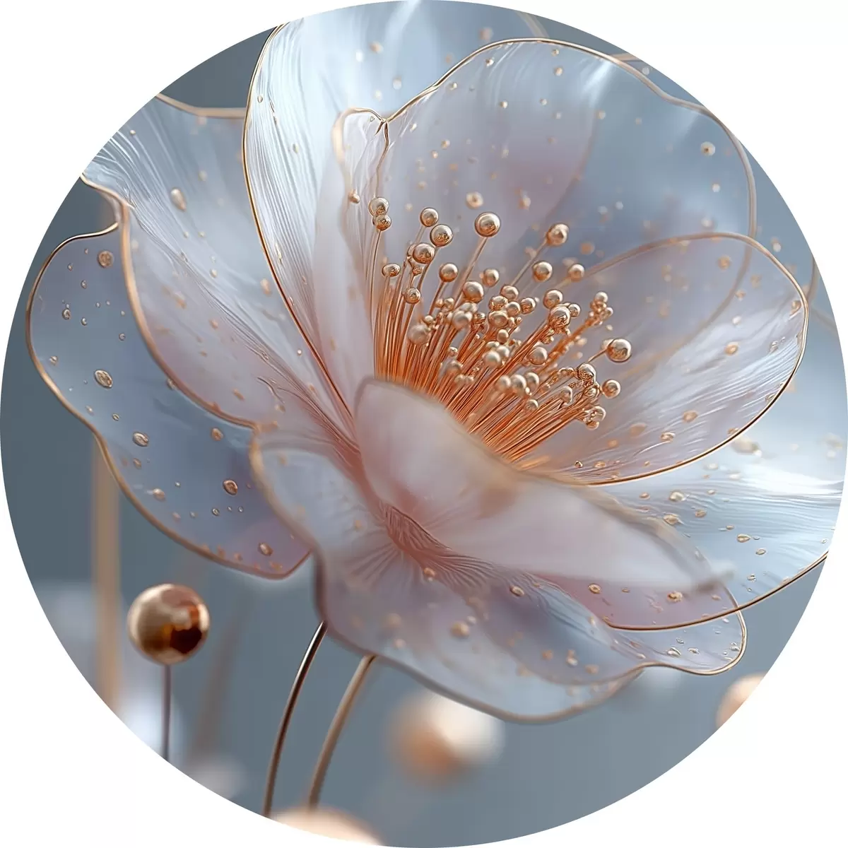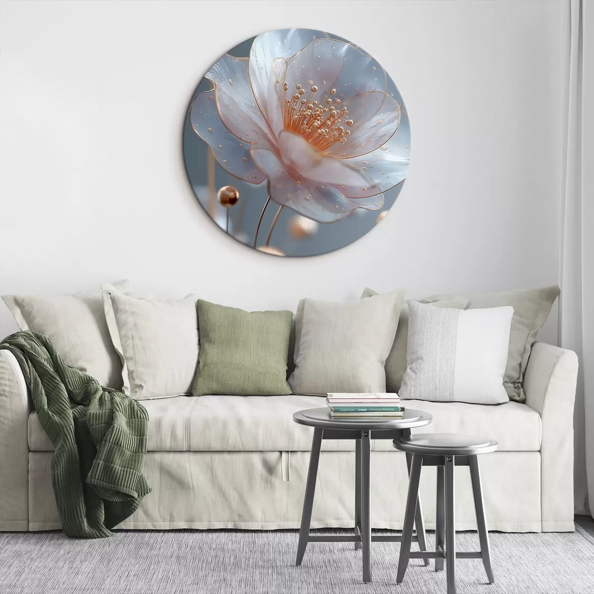 Cuadros redondos Flor translúcida con estambres cobrizos sobre fondo azul r45880