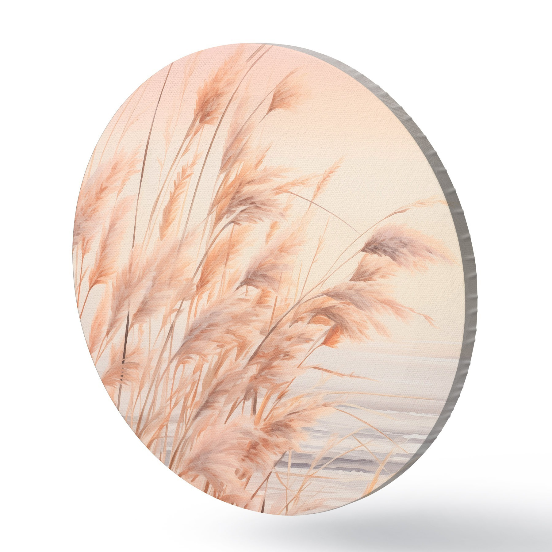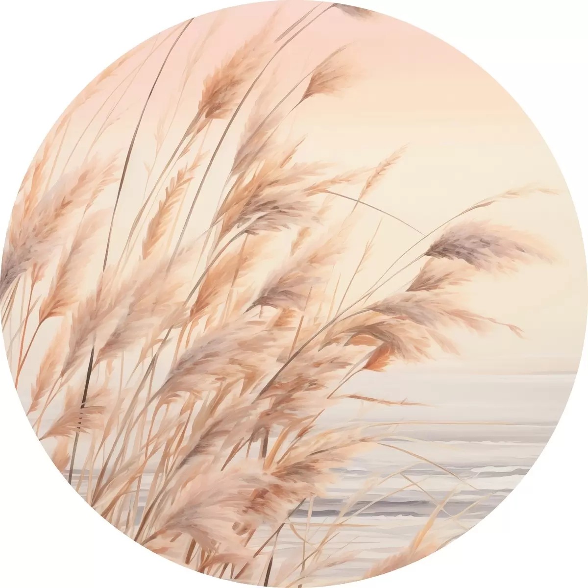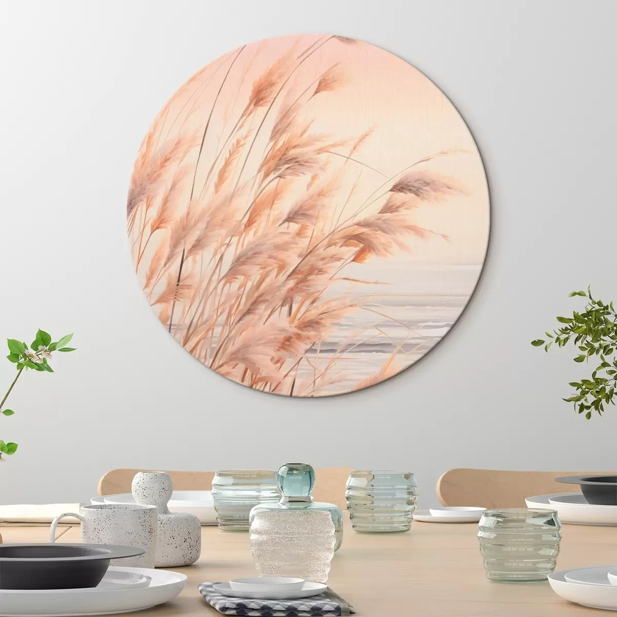 Cuadros redondos Hierba de la pampa con una paleta de colores naranja pastel, cielo rosa claro, un paisaje tranquilo r45934
