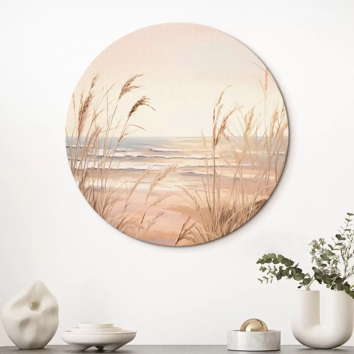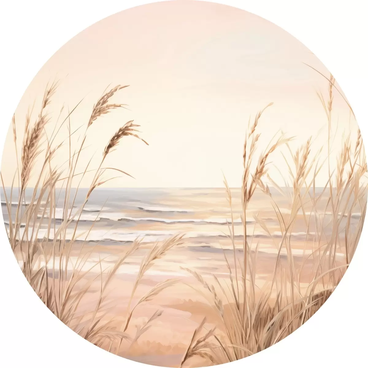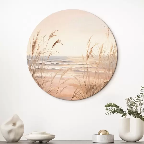 Cuadros redondos Hierba de la pampa con una paleta de colores naranja pastel, cielo rosa claro, un paisaje tranquilo r45935
